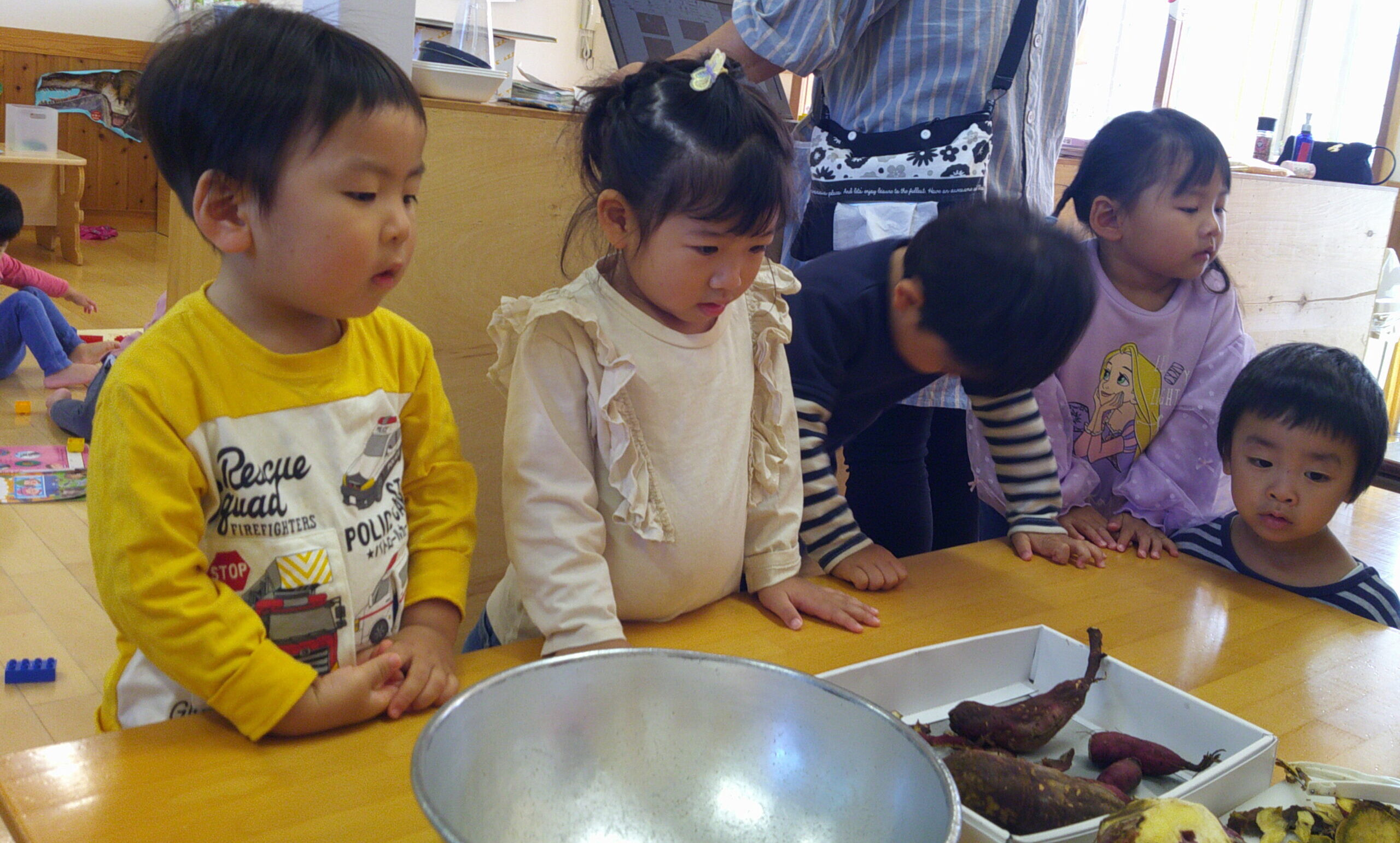 子どもたちと洗ったさつまいもを、1口サイズに切っていきます😊