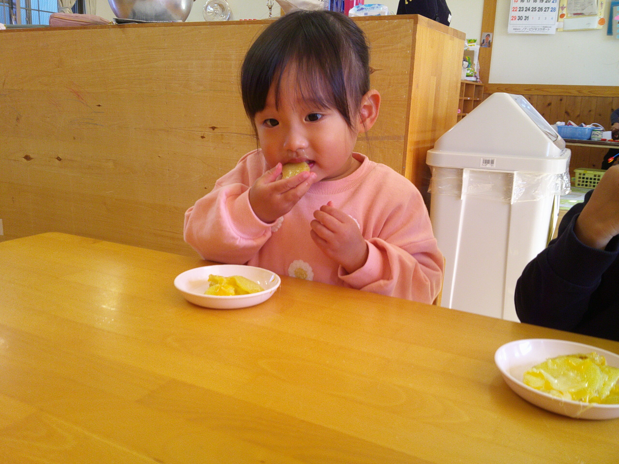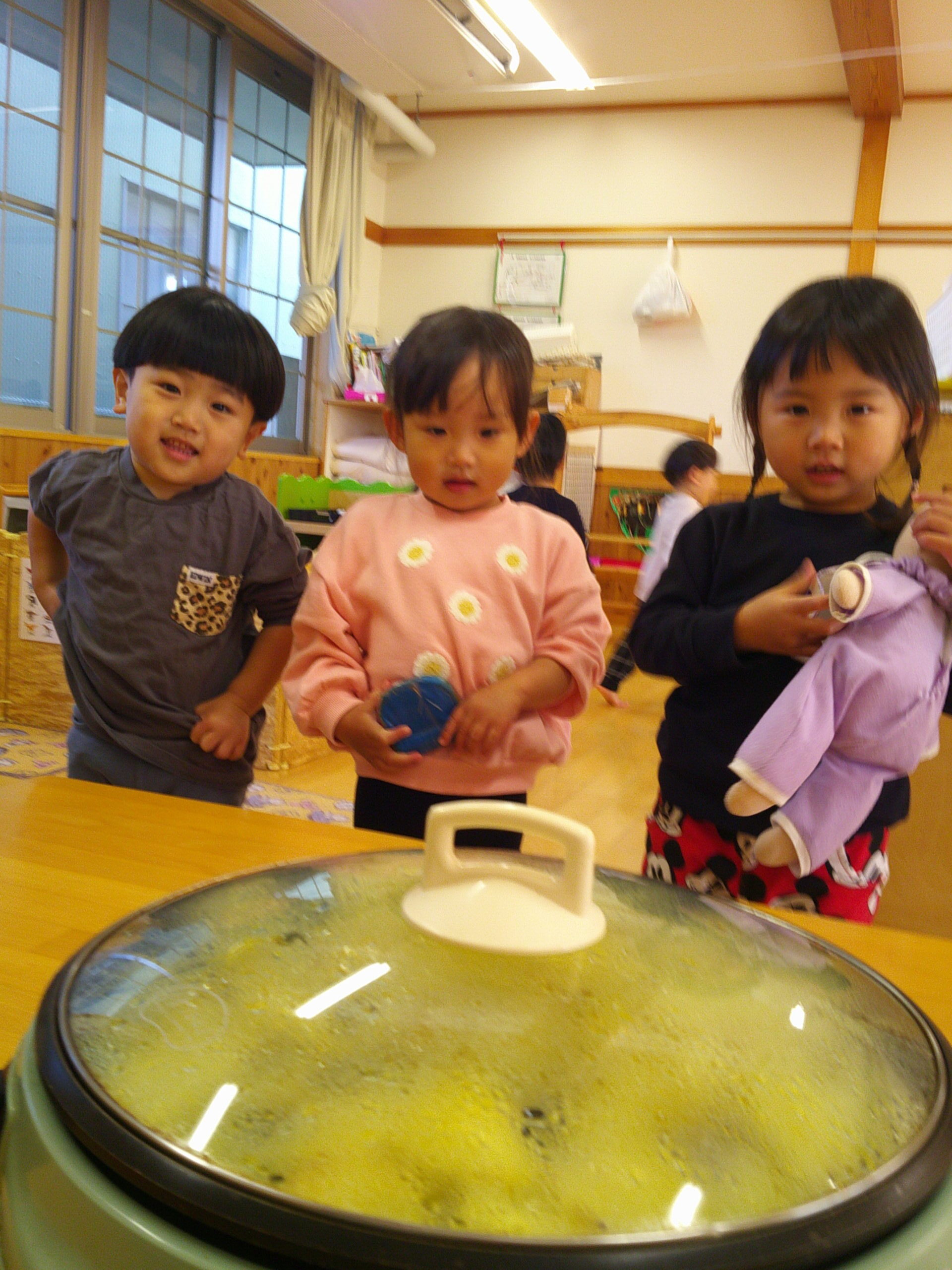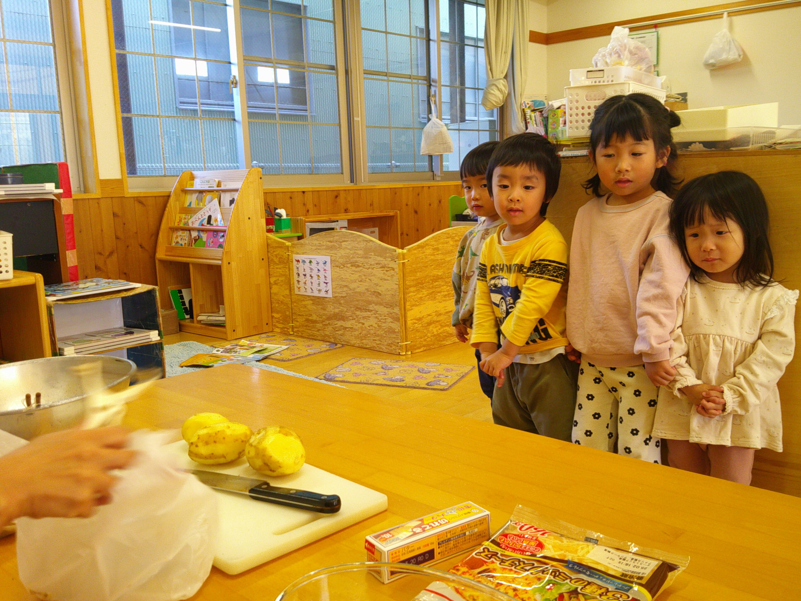 保育室で調理していきました!ホットプレートでじゃがいもを焼いて、バターをのせて!仕上げにチーズをトッピング!調理の様子を見守る子どもたちも、保育士も心ホクホクウキウキ😄