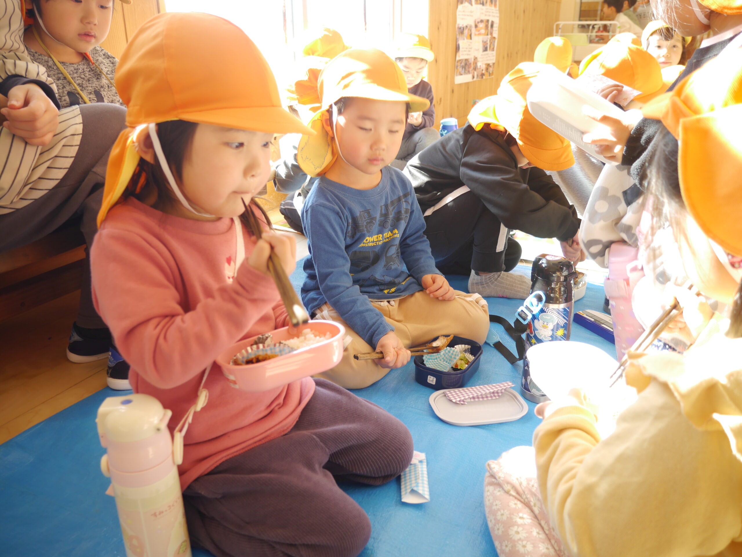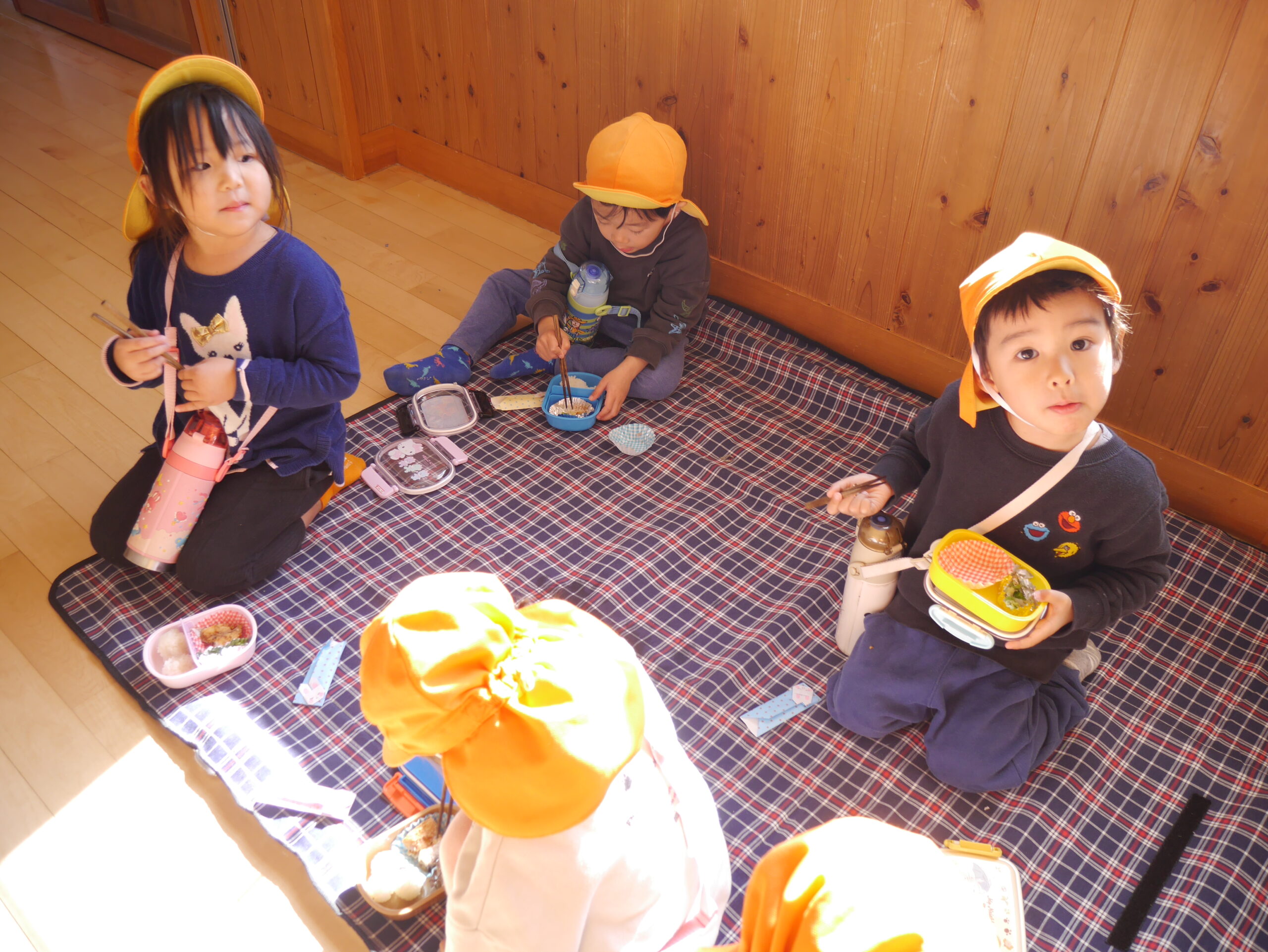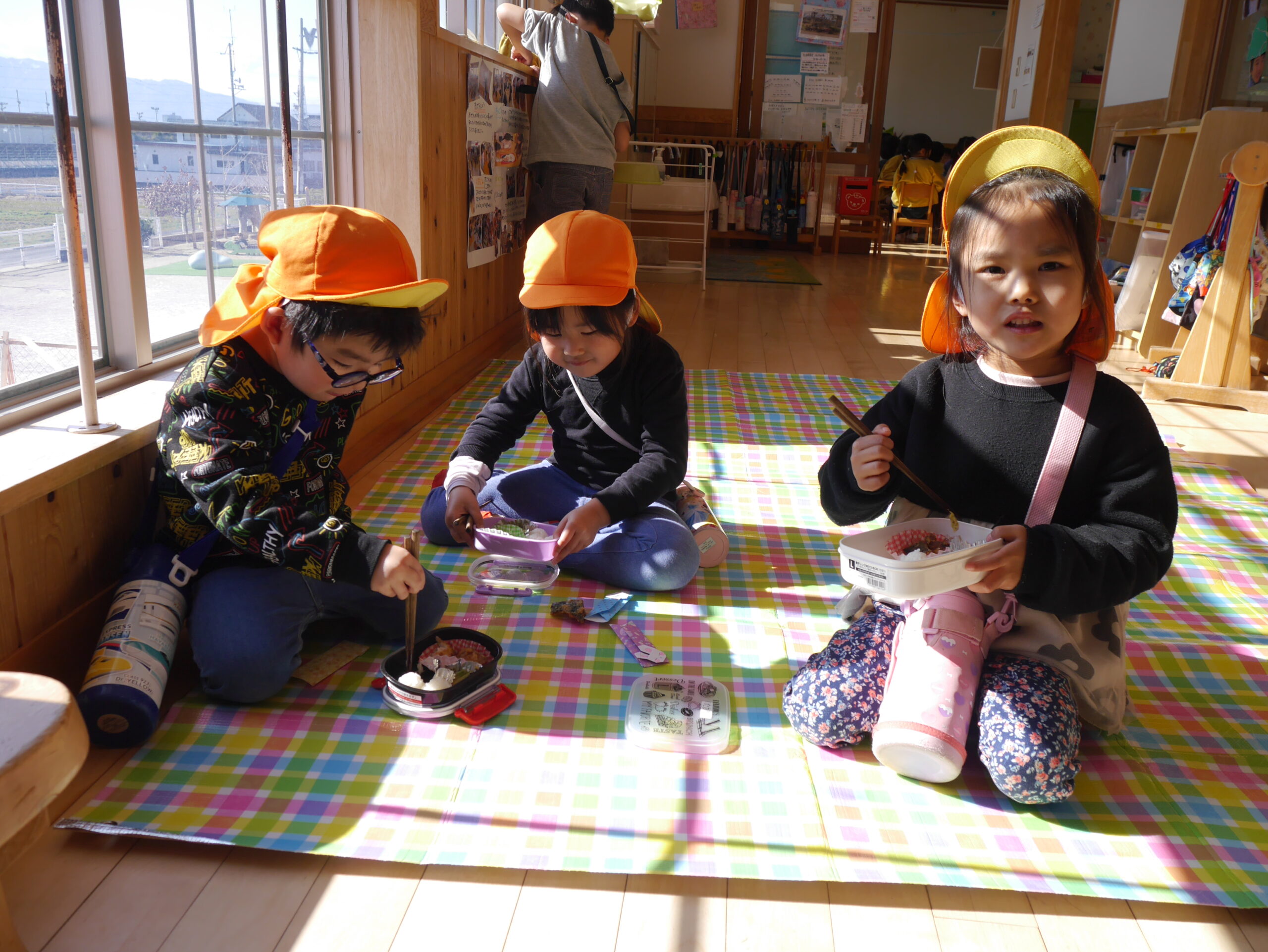 今日はお天気が良く、日射しもぽかぽかしていたので、カラー帽子もかぶって(笑)廊下にレジャーシートをひいて食べてみました💖