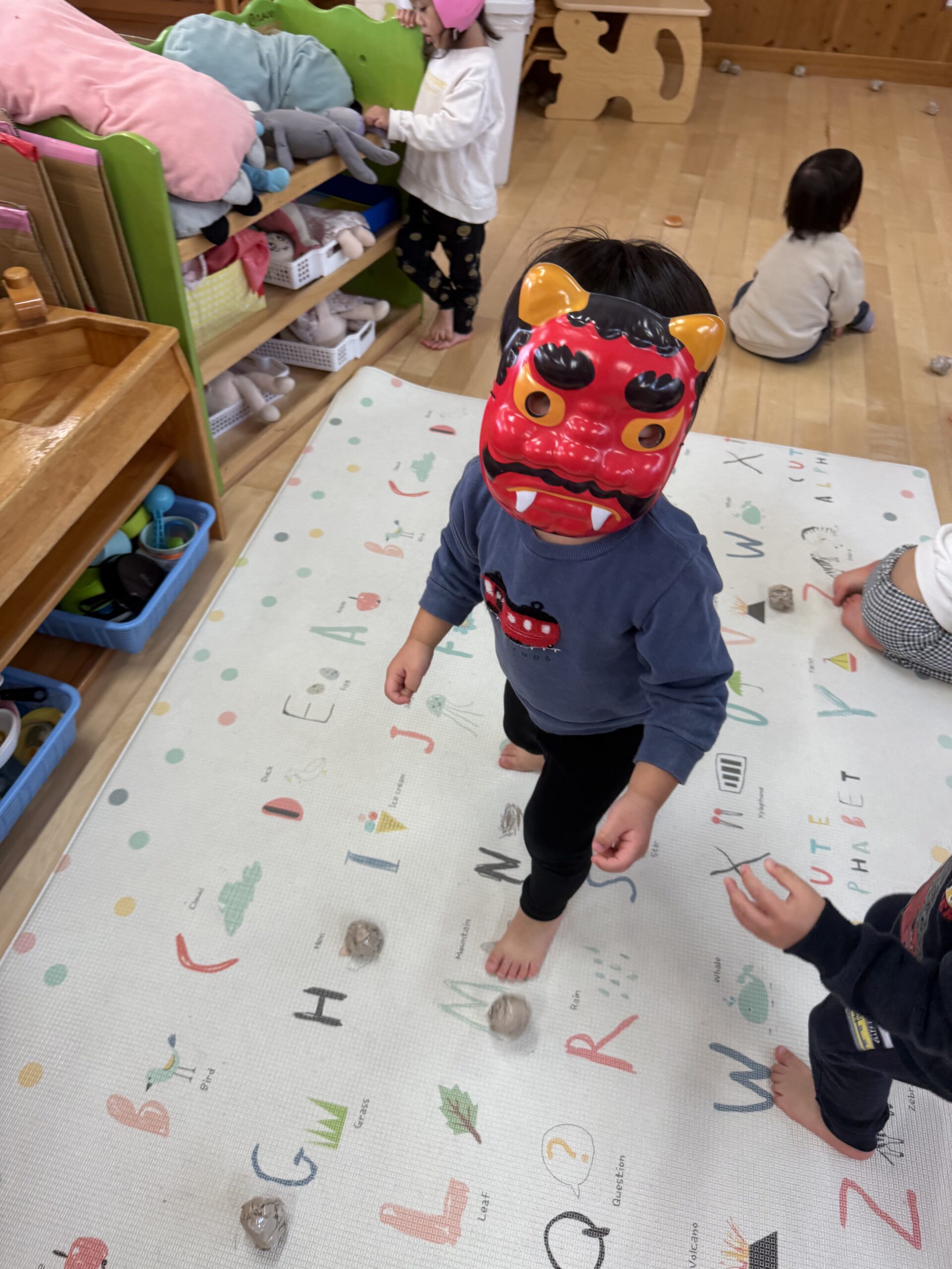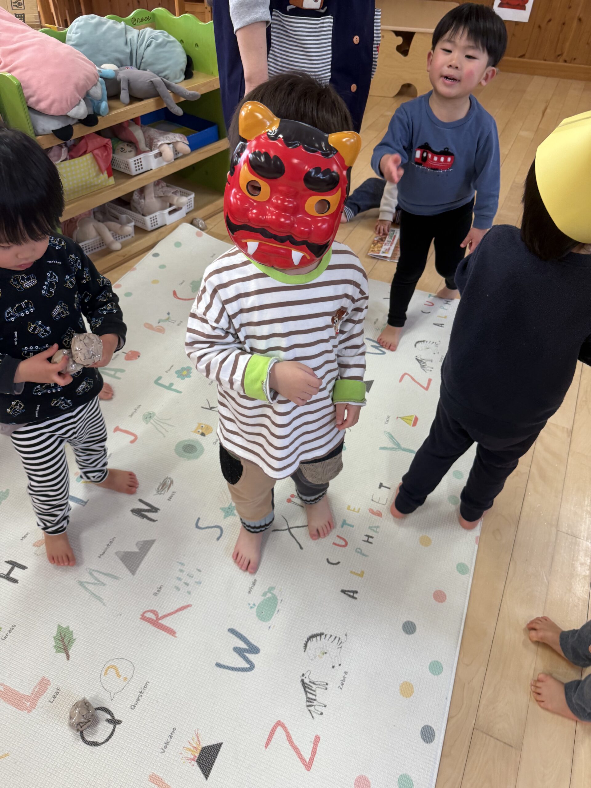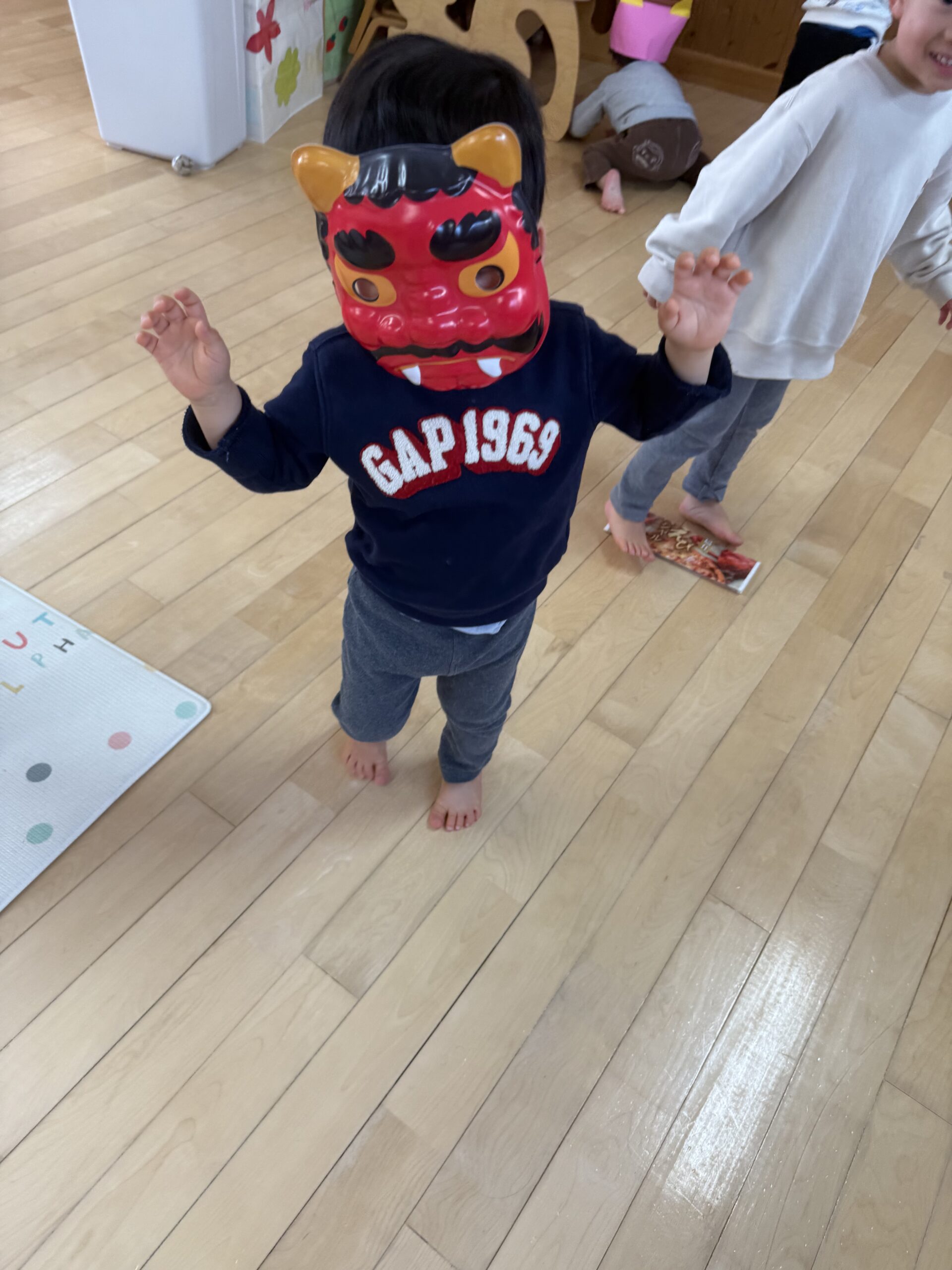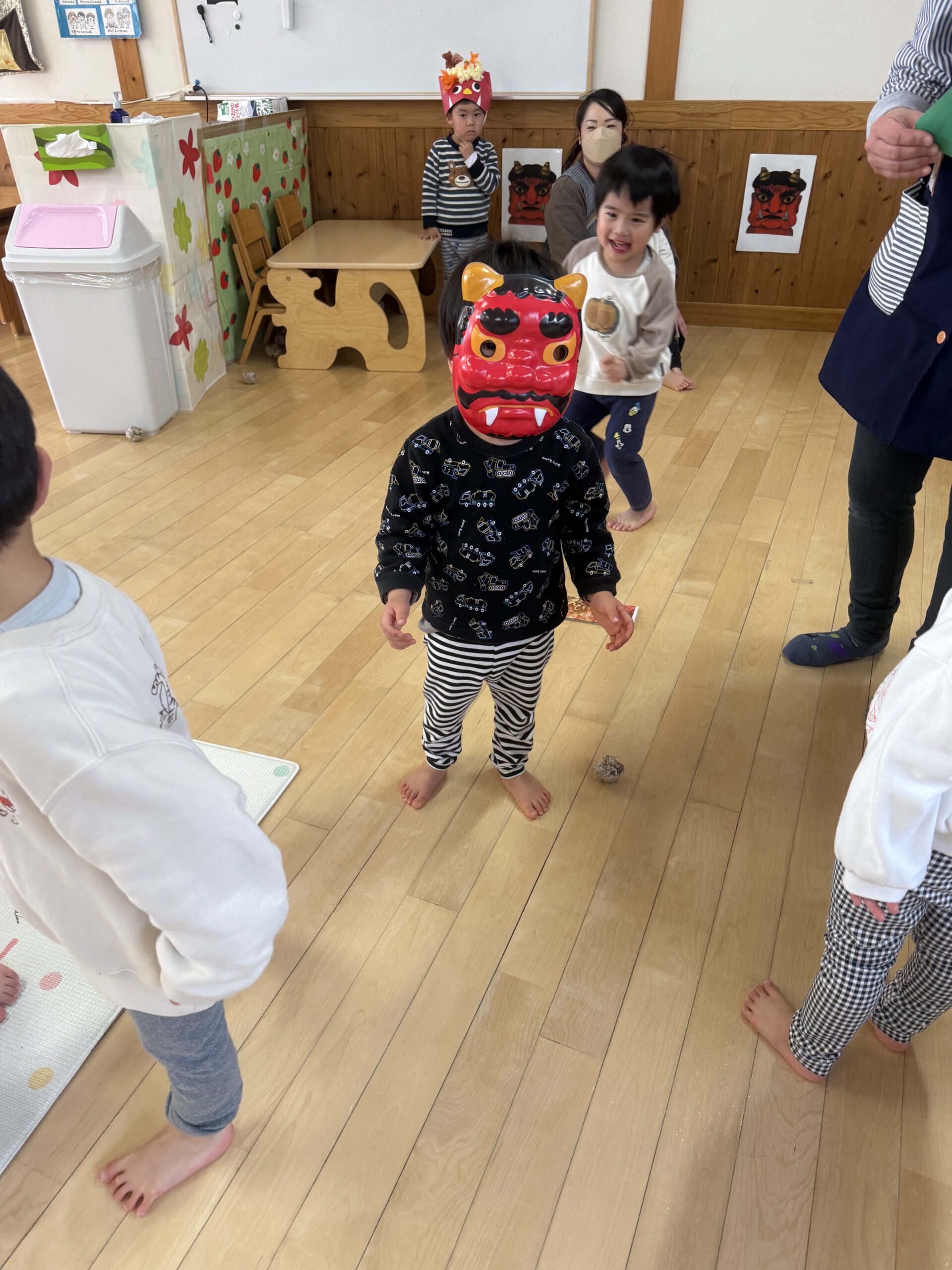 自分で作った鬼のお面を被って、心の中の弱虫鬼を退治したり、保育者が鬼の役をして豆をまいて楽しみました♪