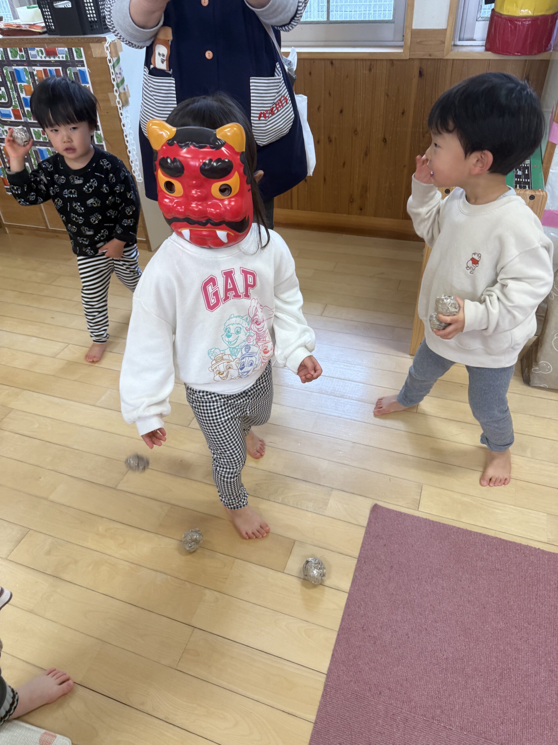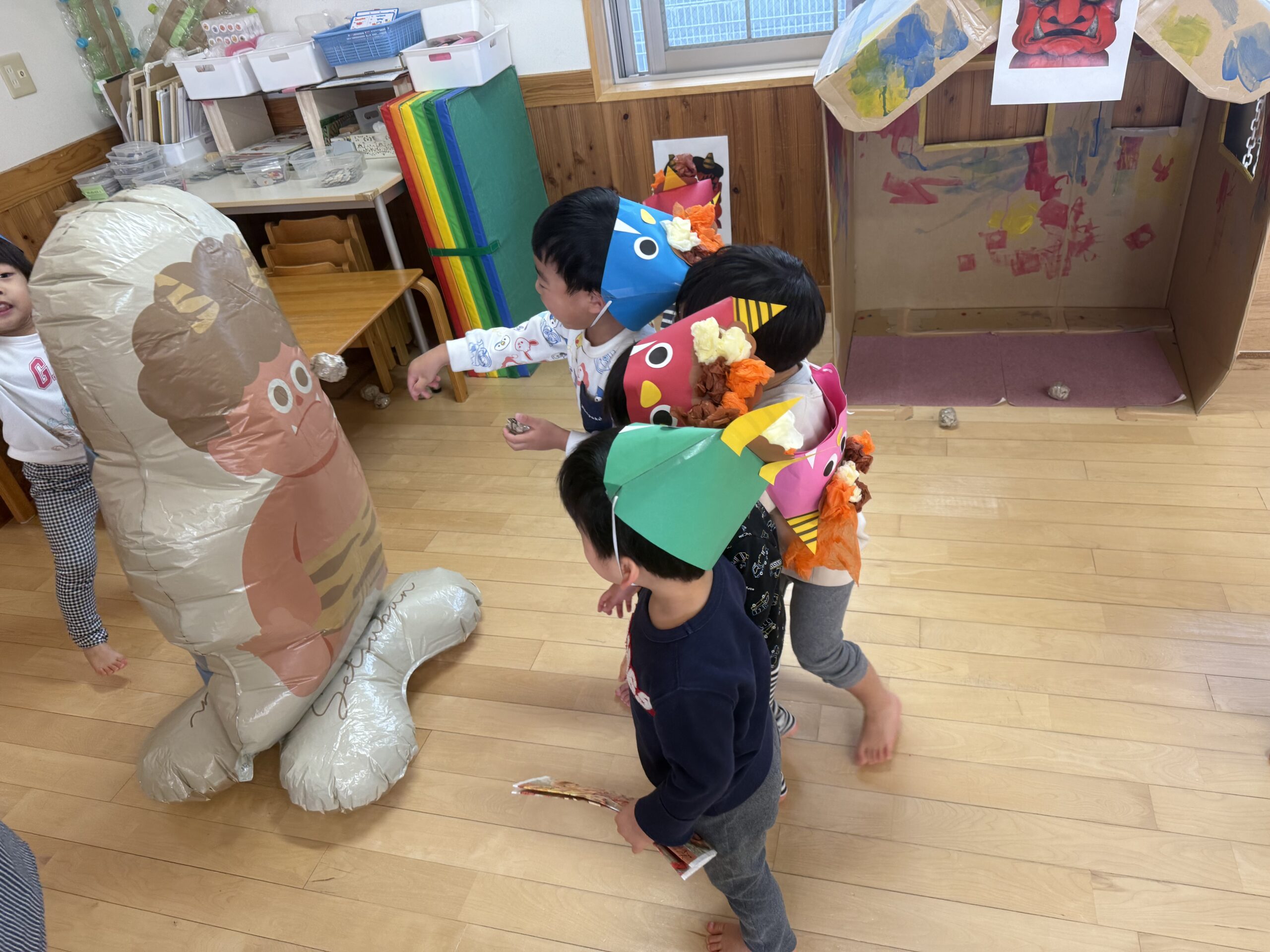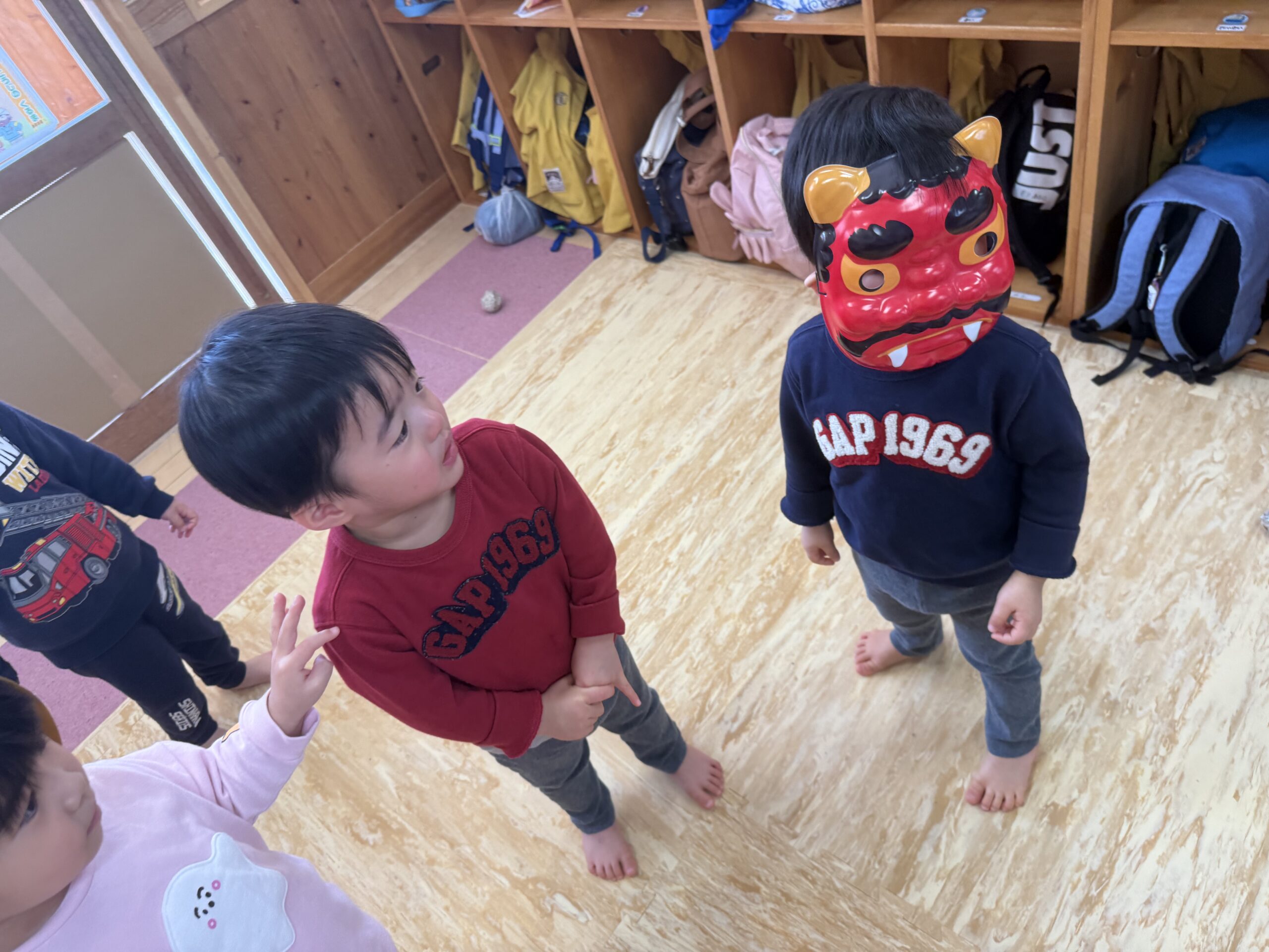 自分で作った鬼のお面を被って、心の中の弱虫鬼を退治したり、保育者が鬼の役をして豆をまいて楽しみました♪