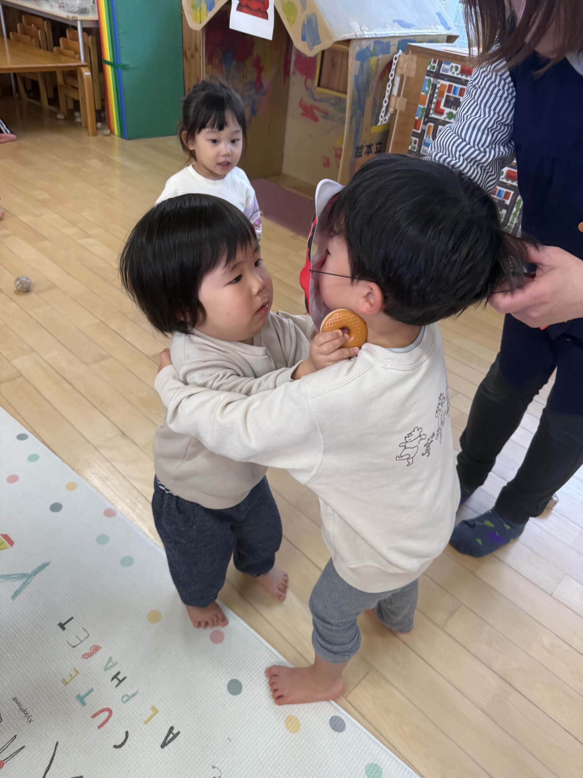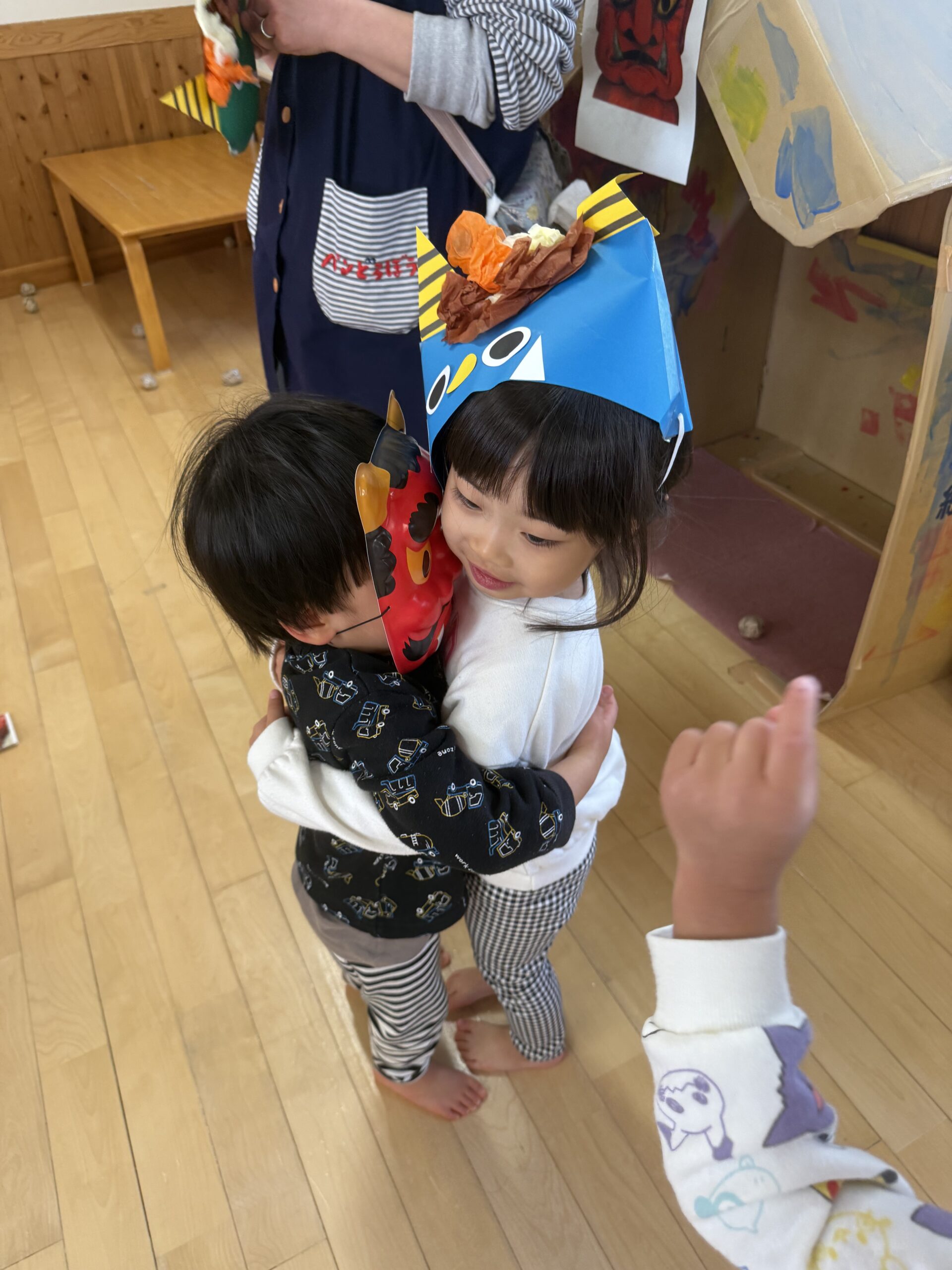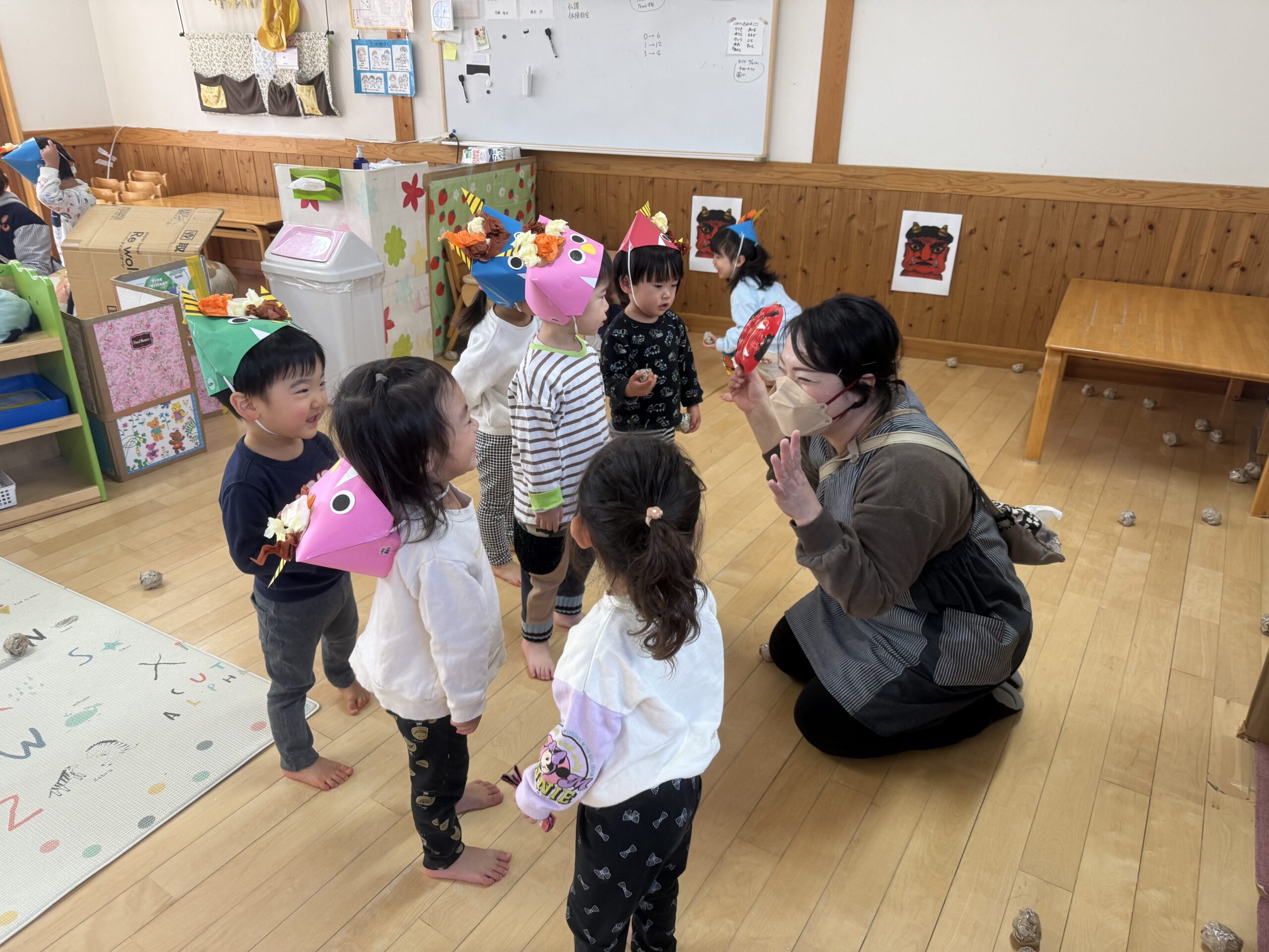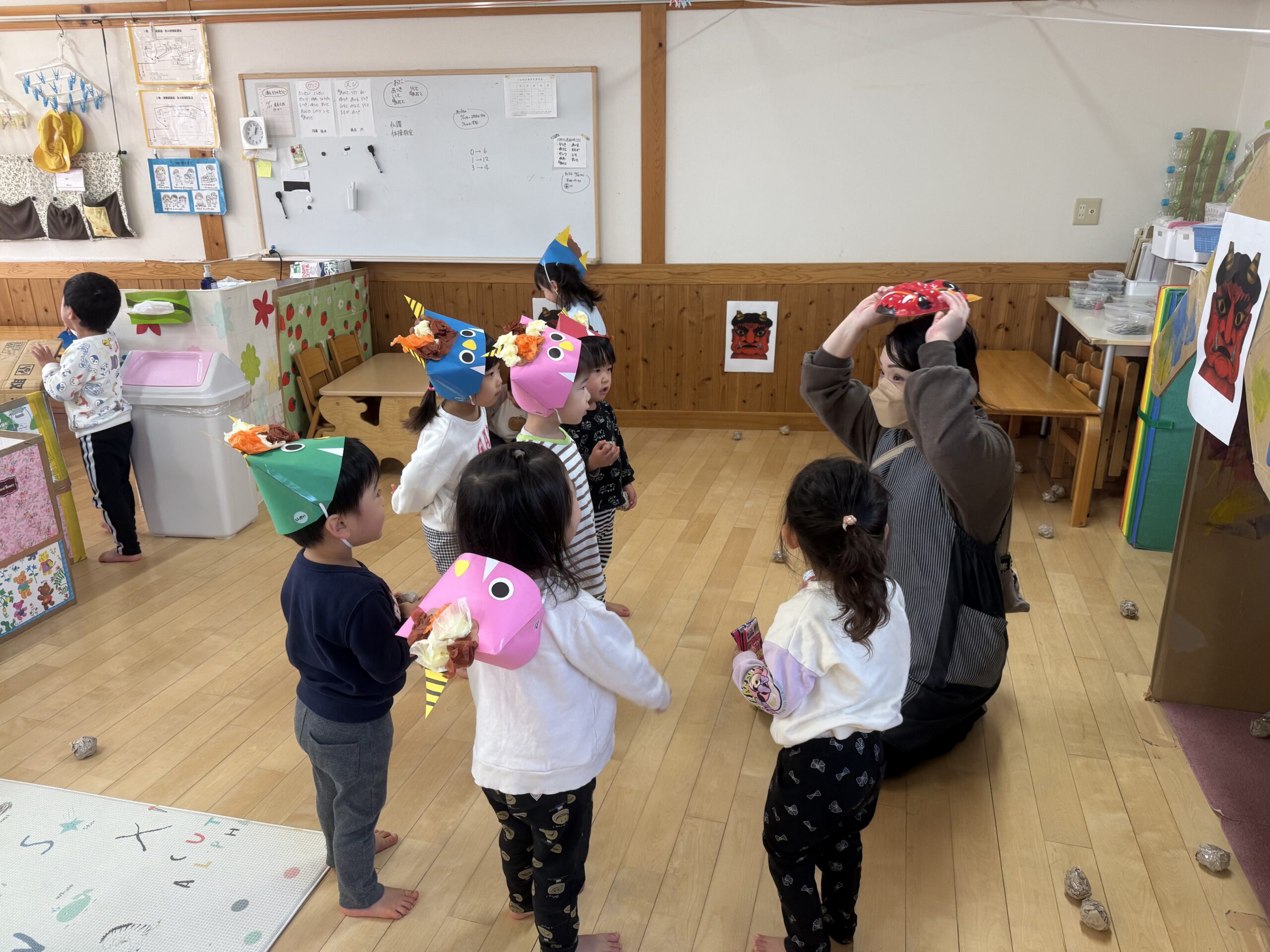 自分で作った鬼のお面を被って、心の中の弱虫鬼を退治したり、保育者が鬼の役をして豆をまいて楽しみました♪