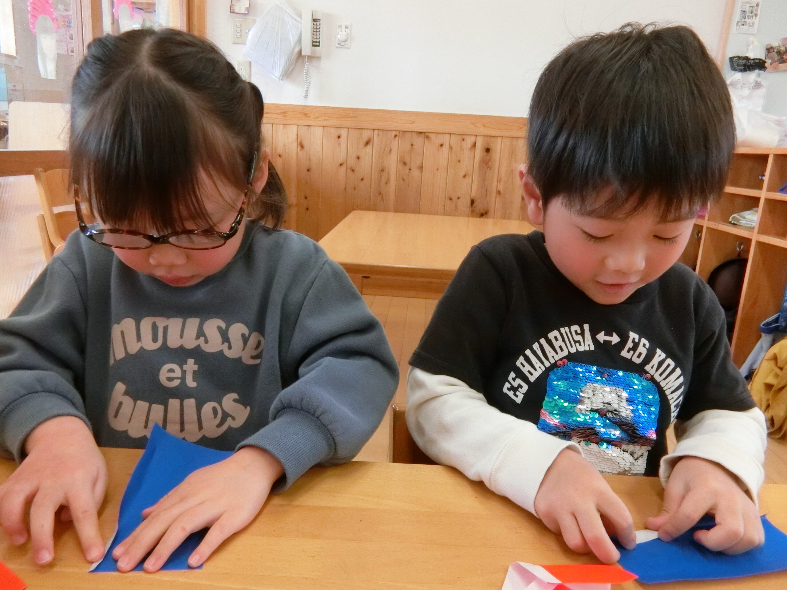 2つ目を折っていてわからなくなってしまった時には「さっきどうやったっけ?」と1つ目のを見返したり、友だちと確認し合ったりと、自分でじっくりと考えている子どもたちでした。
