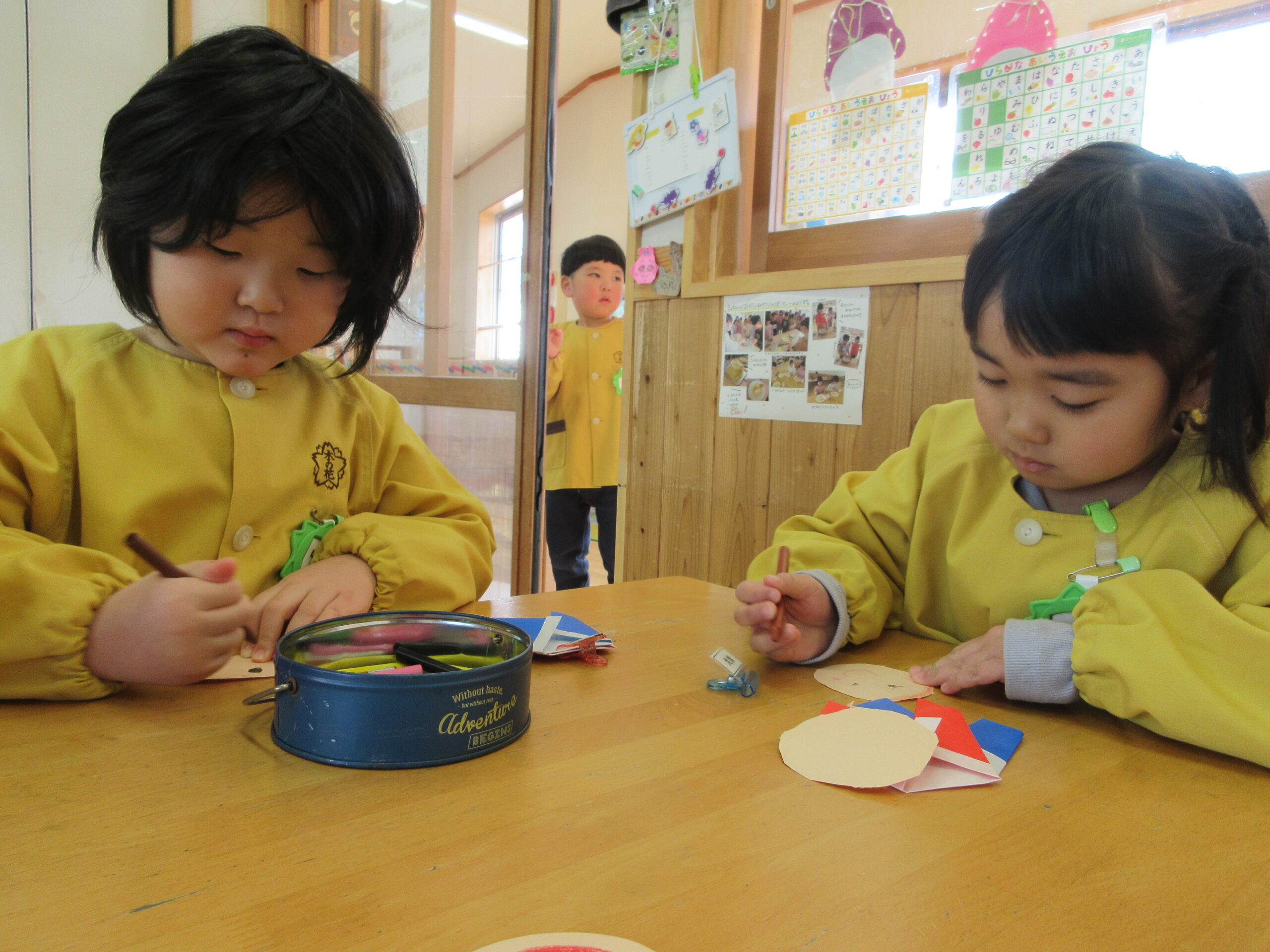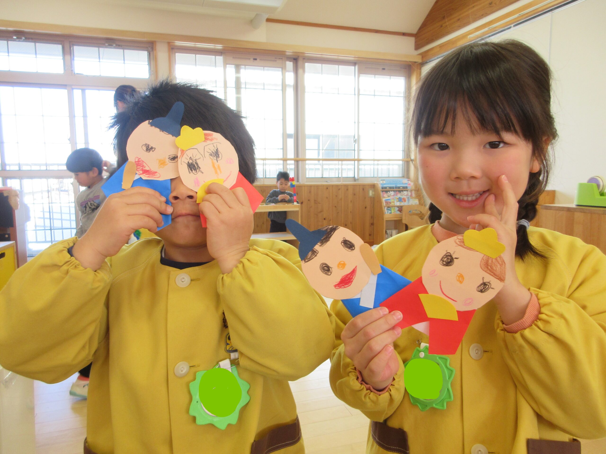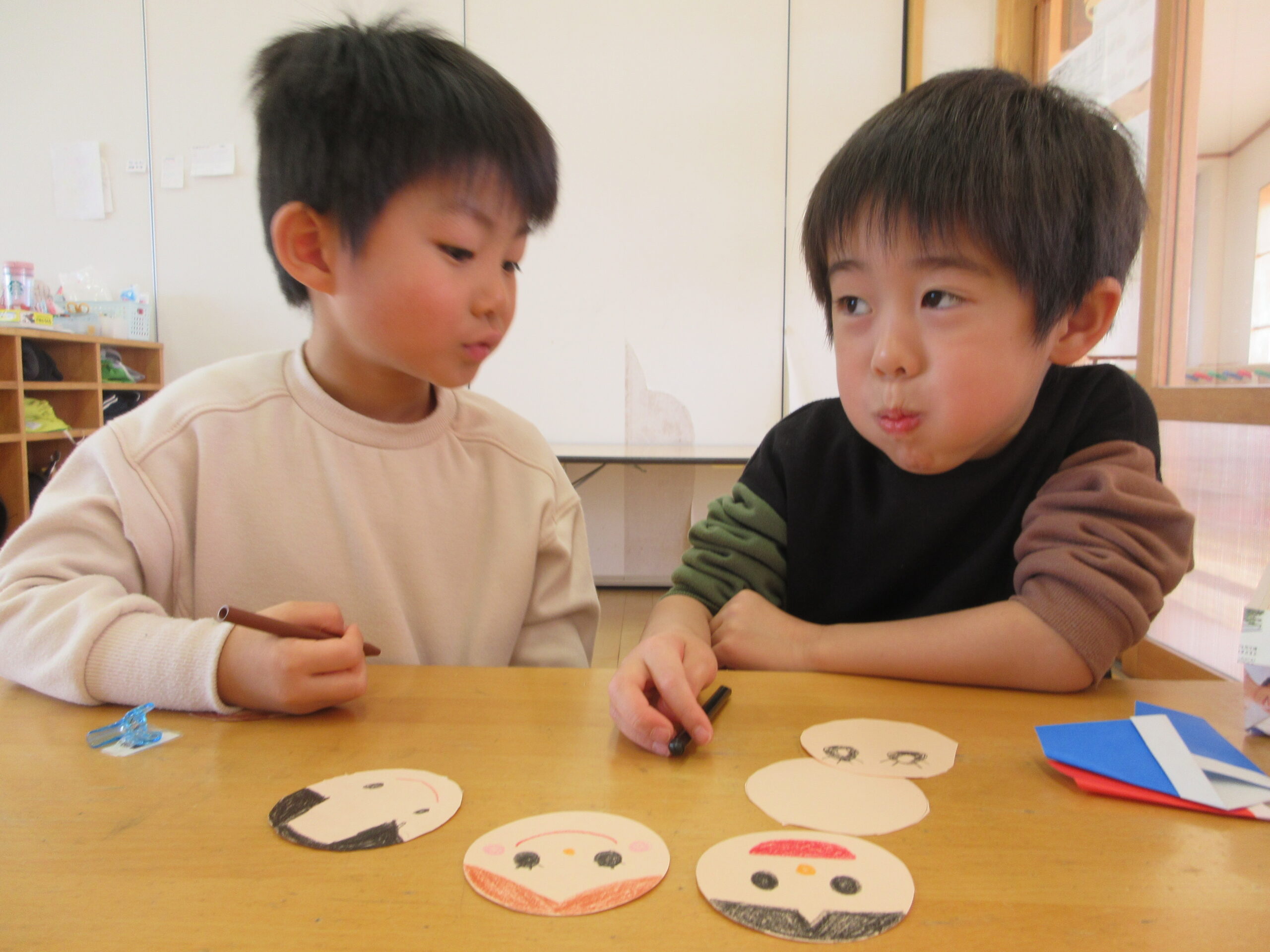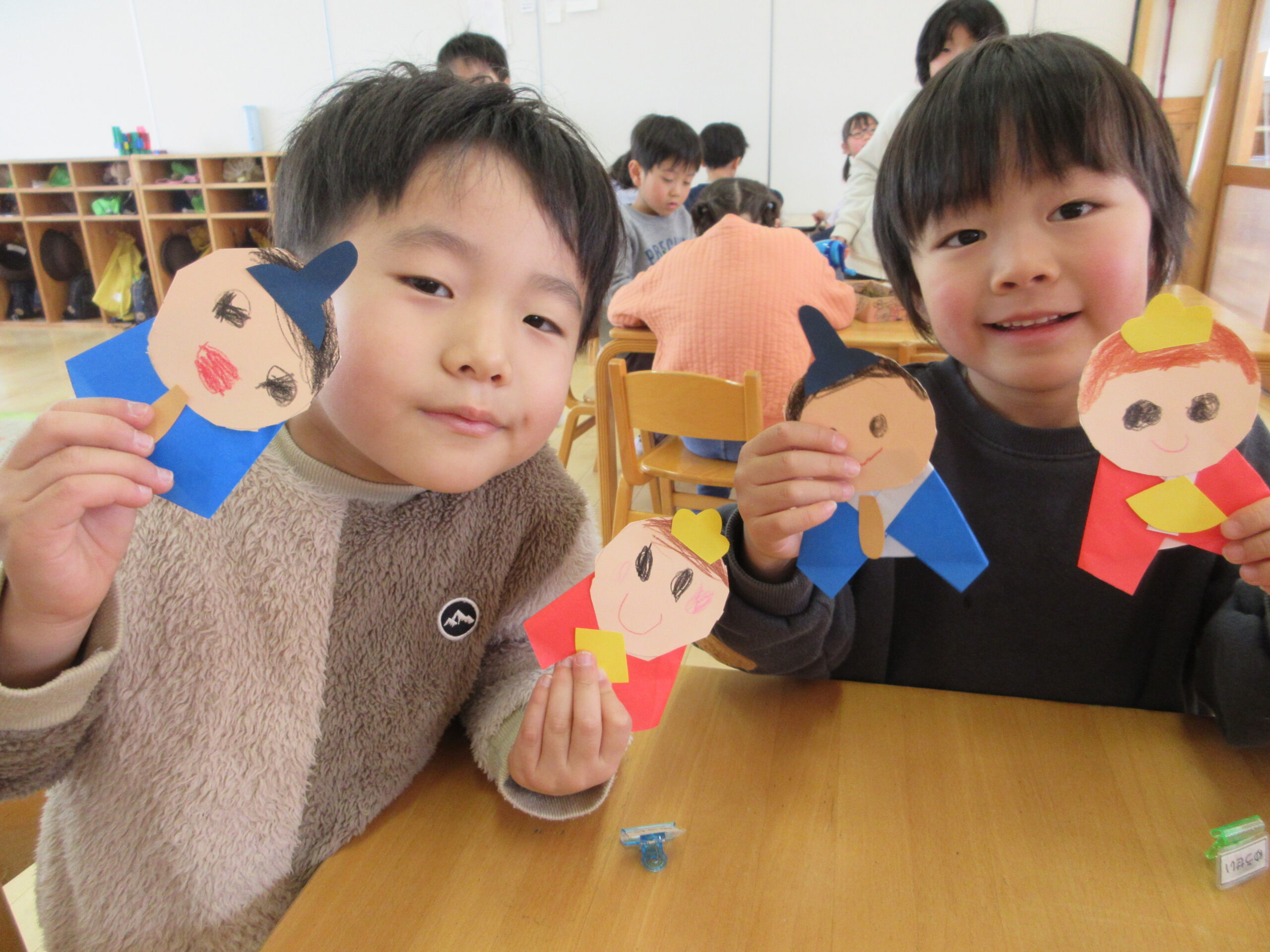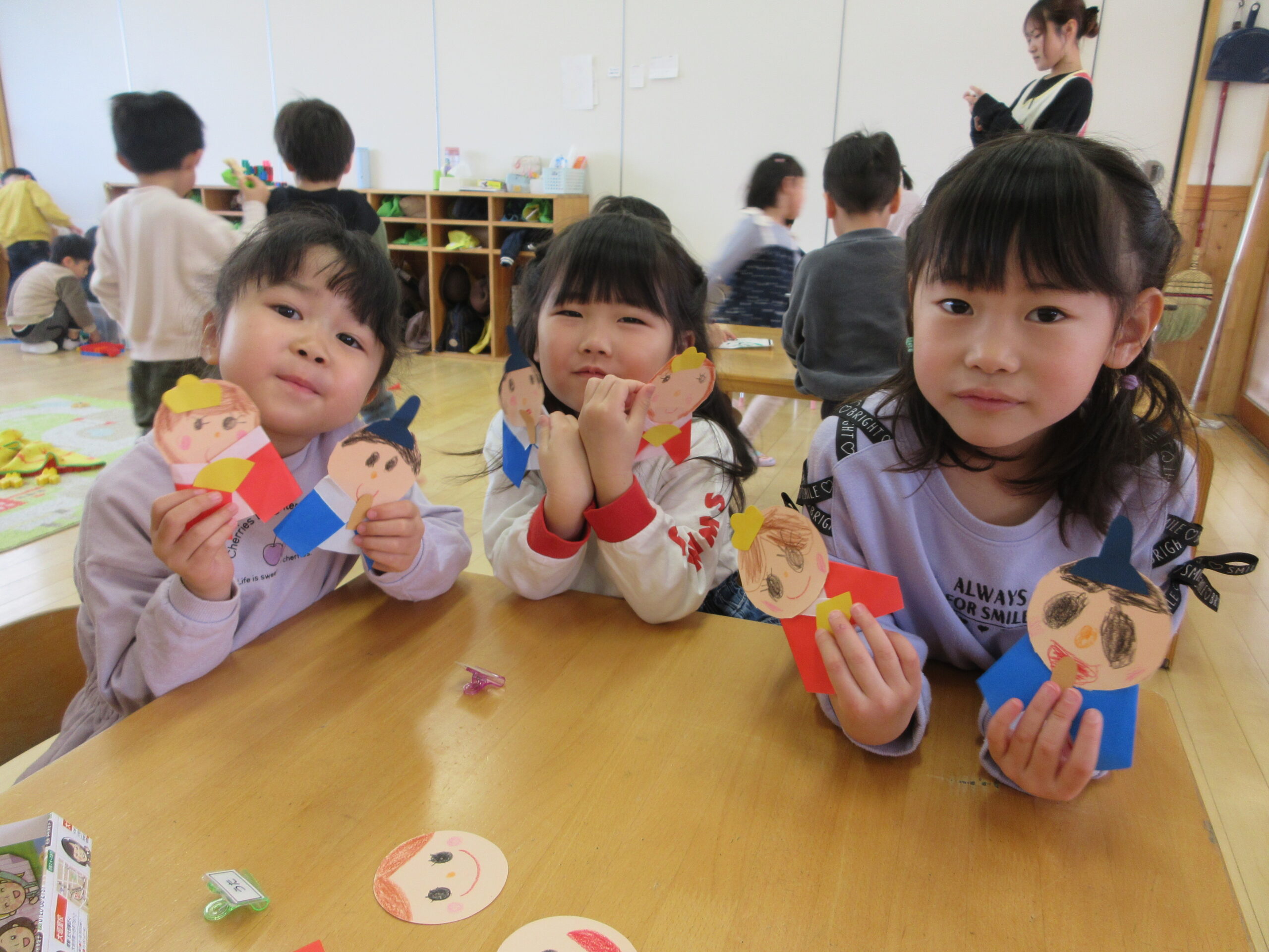 「おだいりさまっておとこのこだよね?どんな髪型なのかなぁ?」「おひなさまは女の子だから可愛い目(まつげつき)にしようかな!」と子どもたちそれぞれの想像するおひなさまを、表現したり・友だちと話し合ったりする姿が見られましたよ😊