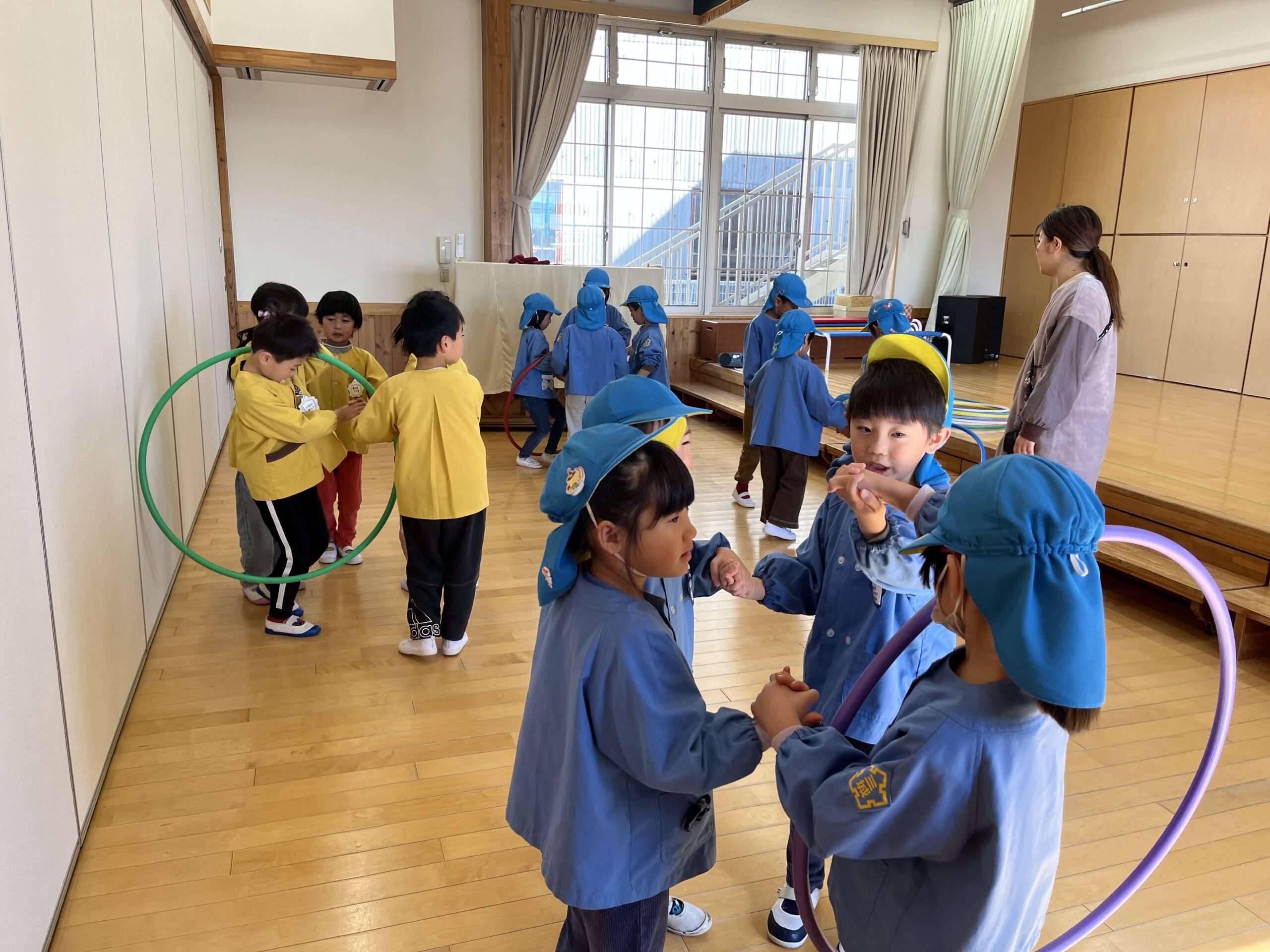 ホールでフラフープ遊びをしたり・・・