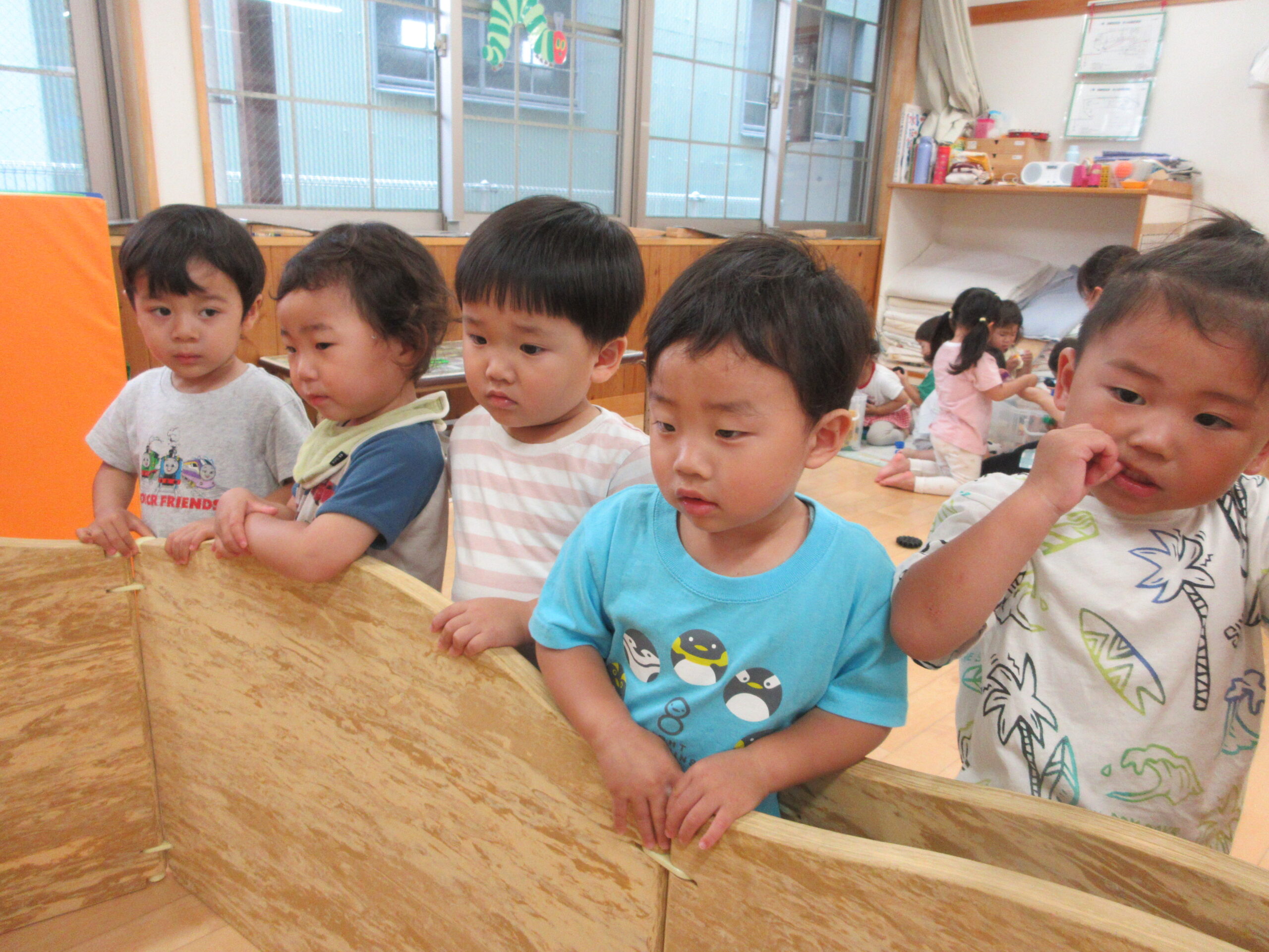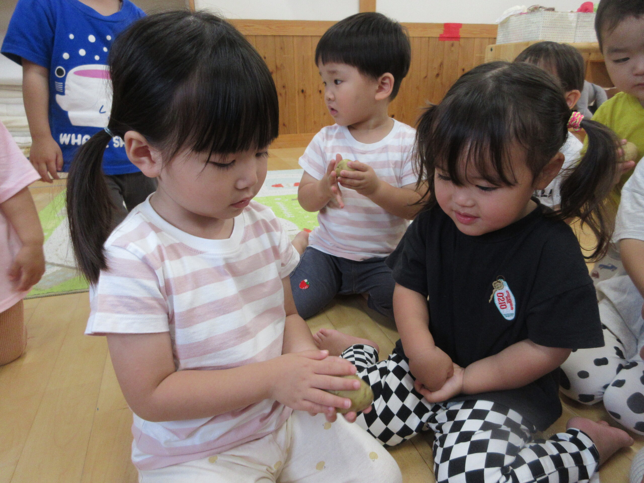 「つるつるしてる!」「砂(土)ついてるよ~」と感じたことを教えてくれる子どもたち。どれくらいすべすべなんだろう?とほっぺにすりすりして感触を確かめる子もいて、可愛らしかったです💕