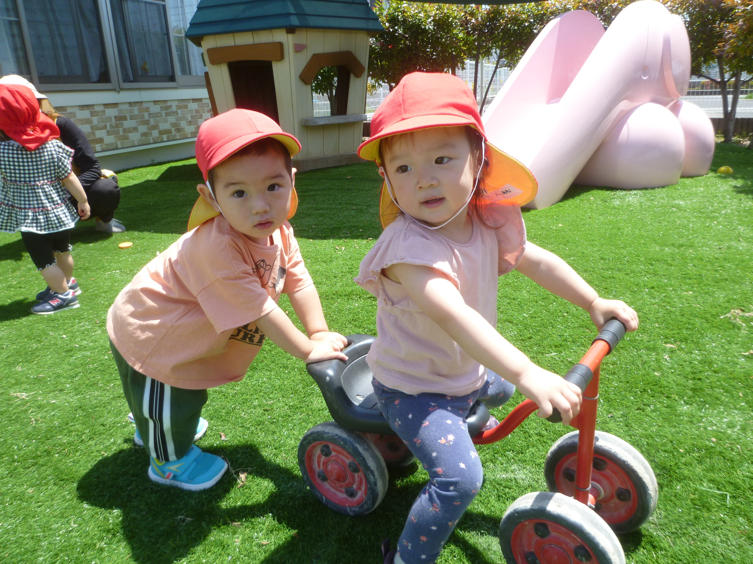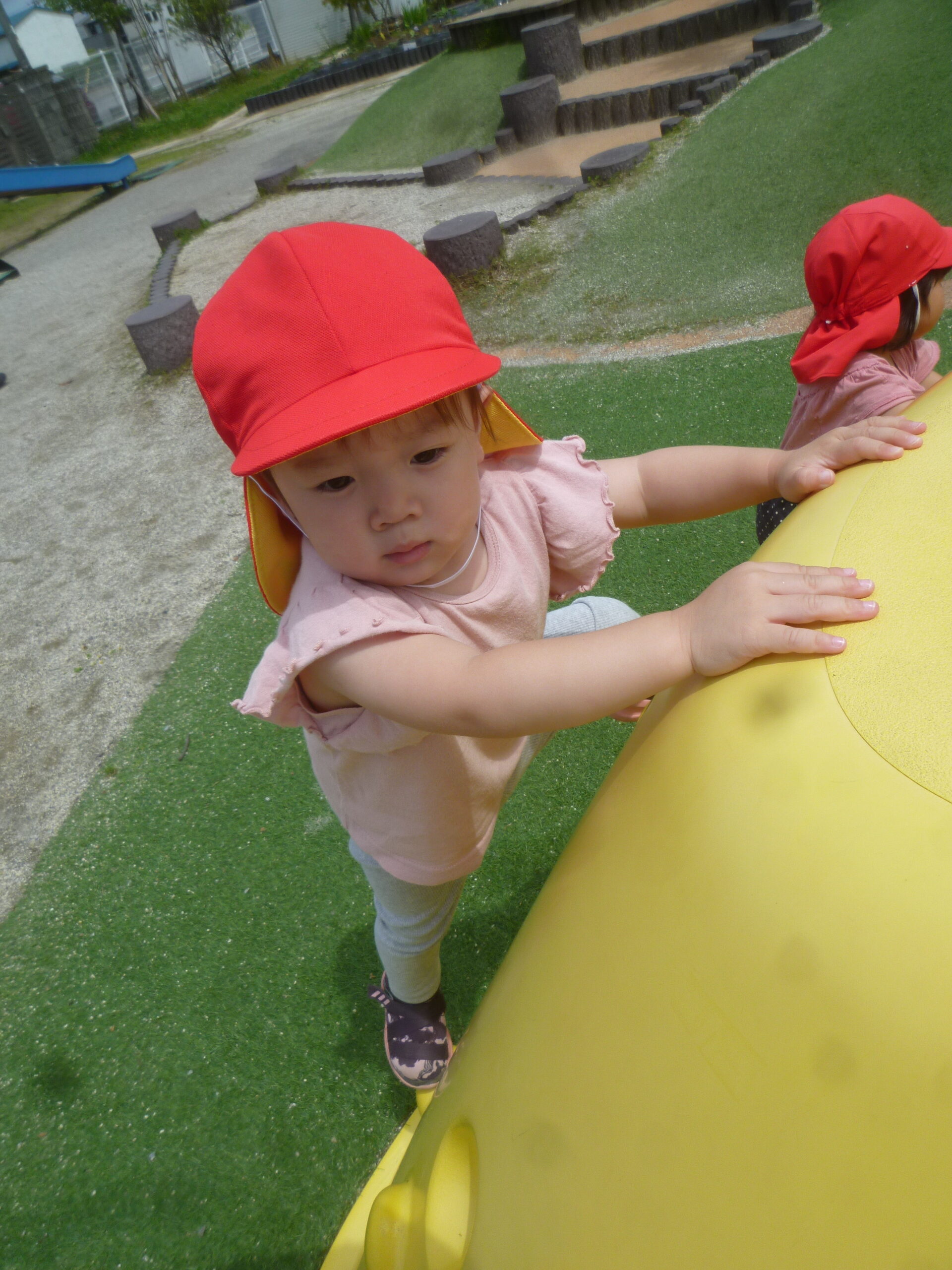 広い園庭に大きな黄色い滑り台があるんですが、挑戦していました!
