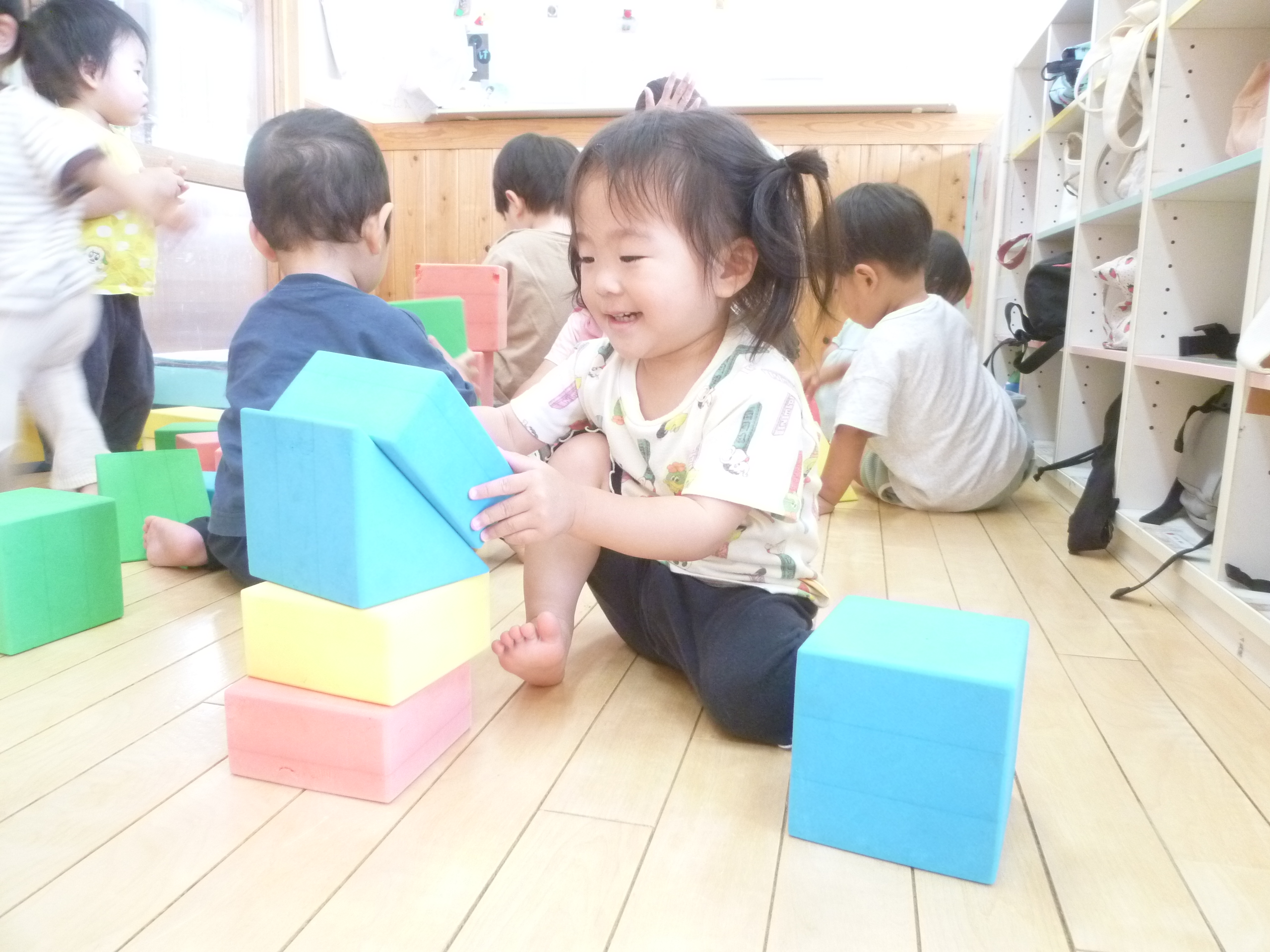 6月は梅雨期に入る時期でもありますが、天気のいい日は戸外遊びを楽しんでいます。また、雨の日は室内で思う存分楽しんでいますよ♪