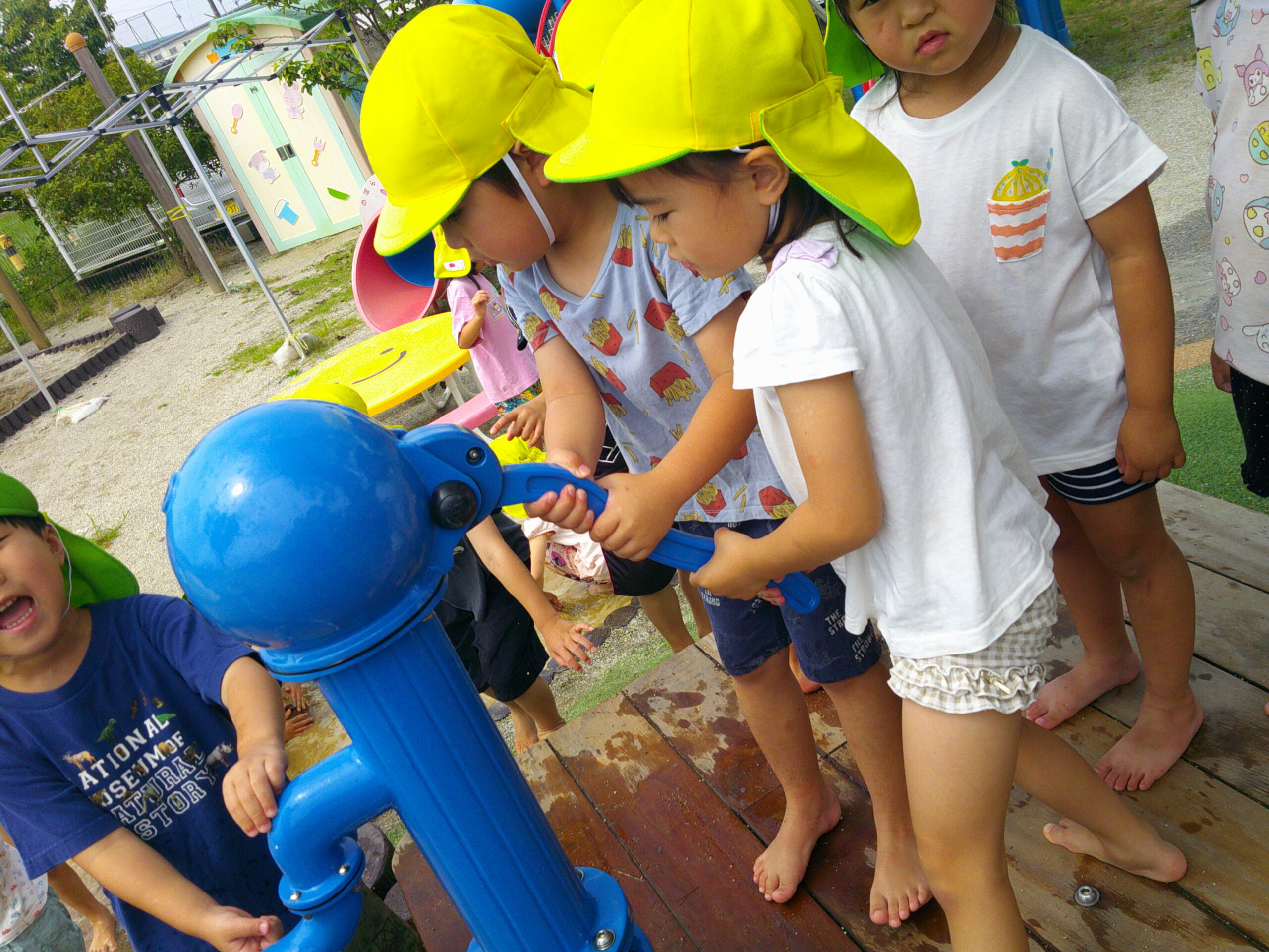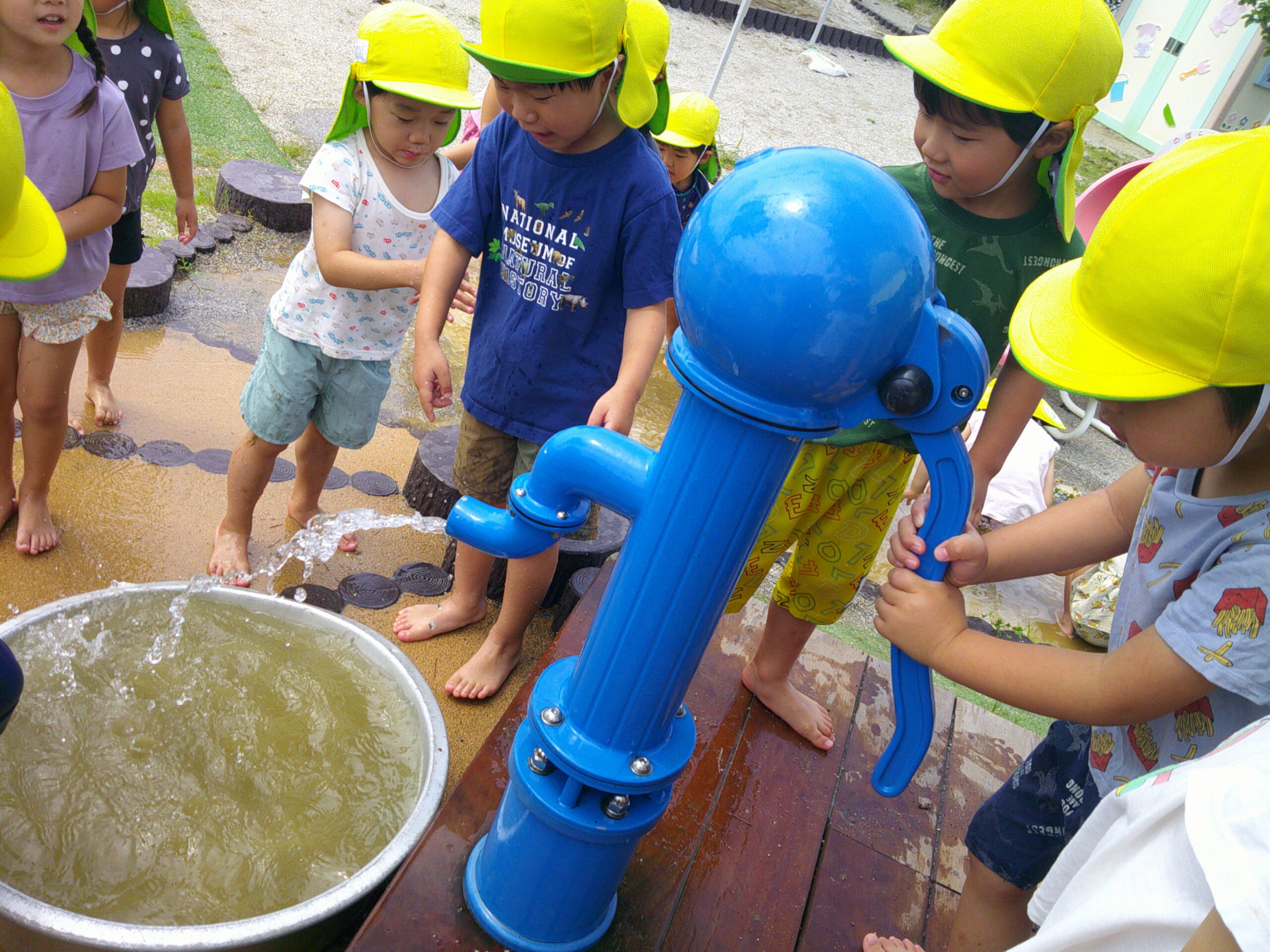 園庭に設置されたポンプを使い、冷たい水を出します😄