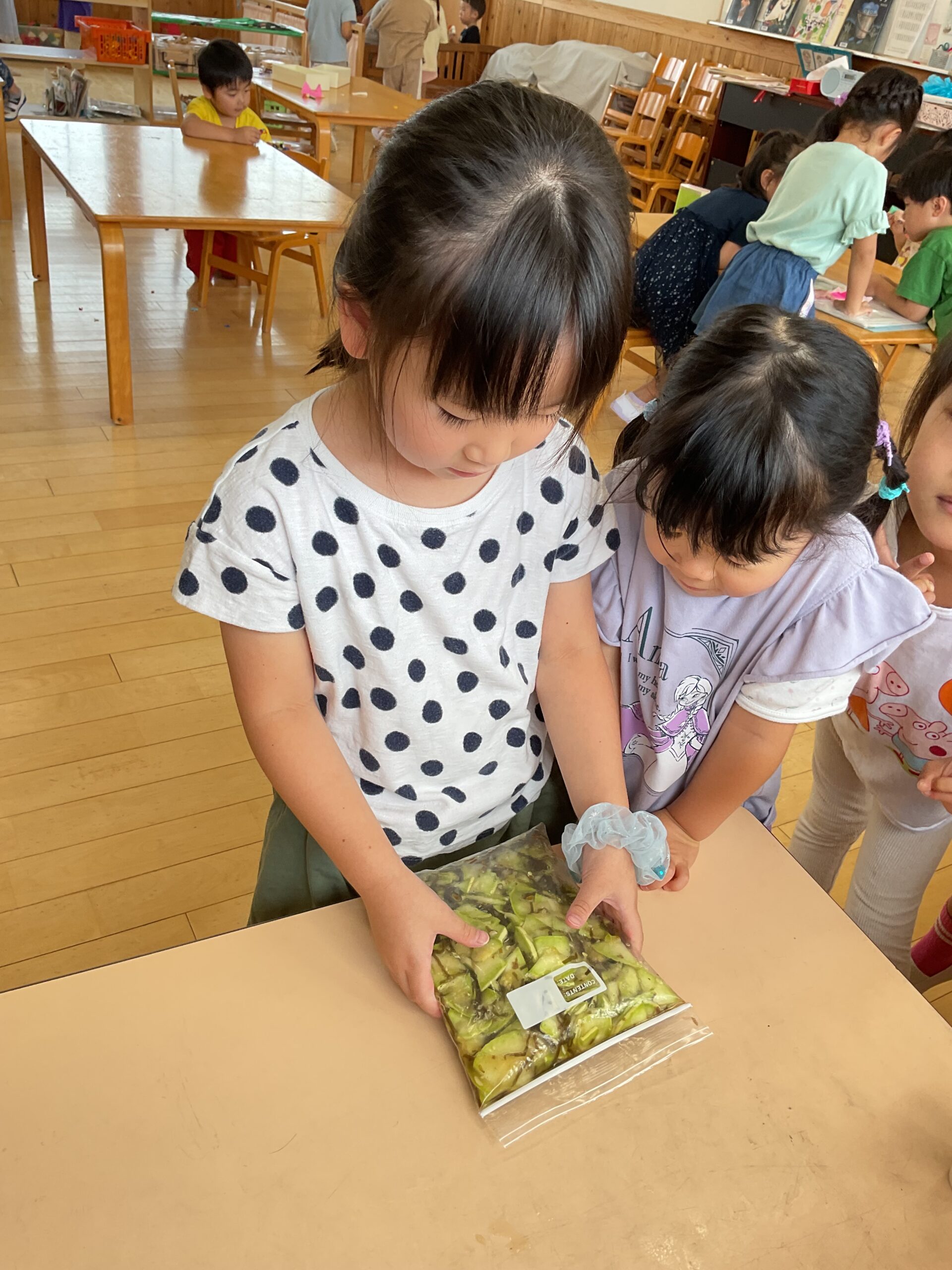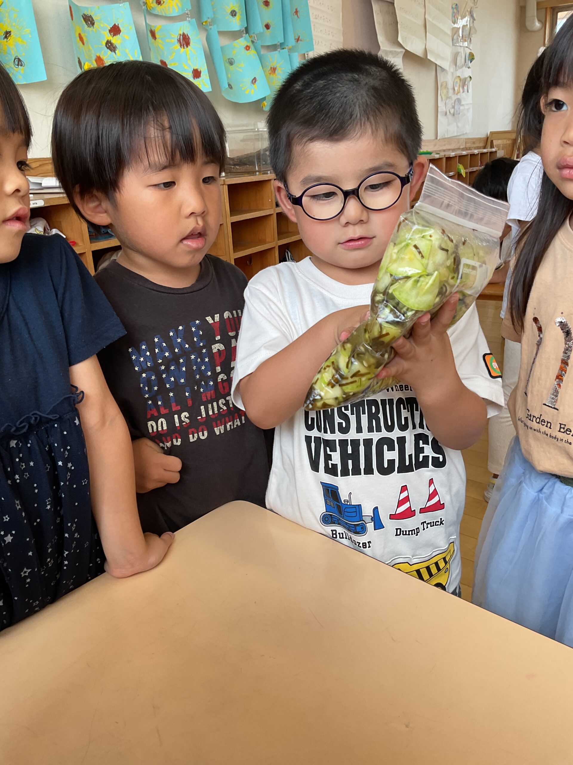 「白い‼️」「大根みたい」と口々に言う子どもたち。少し切ったズッキーニを手に取ると、匂いを嗅いでみようとする子の姿もありましたよ😊