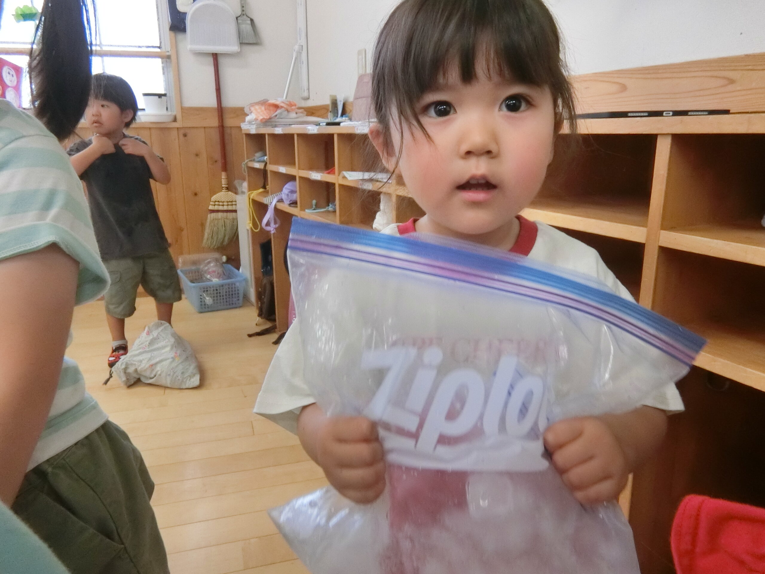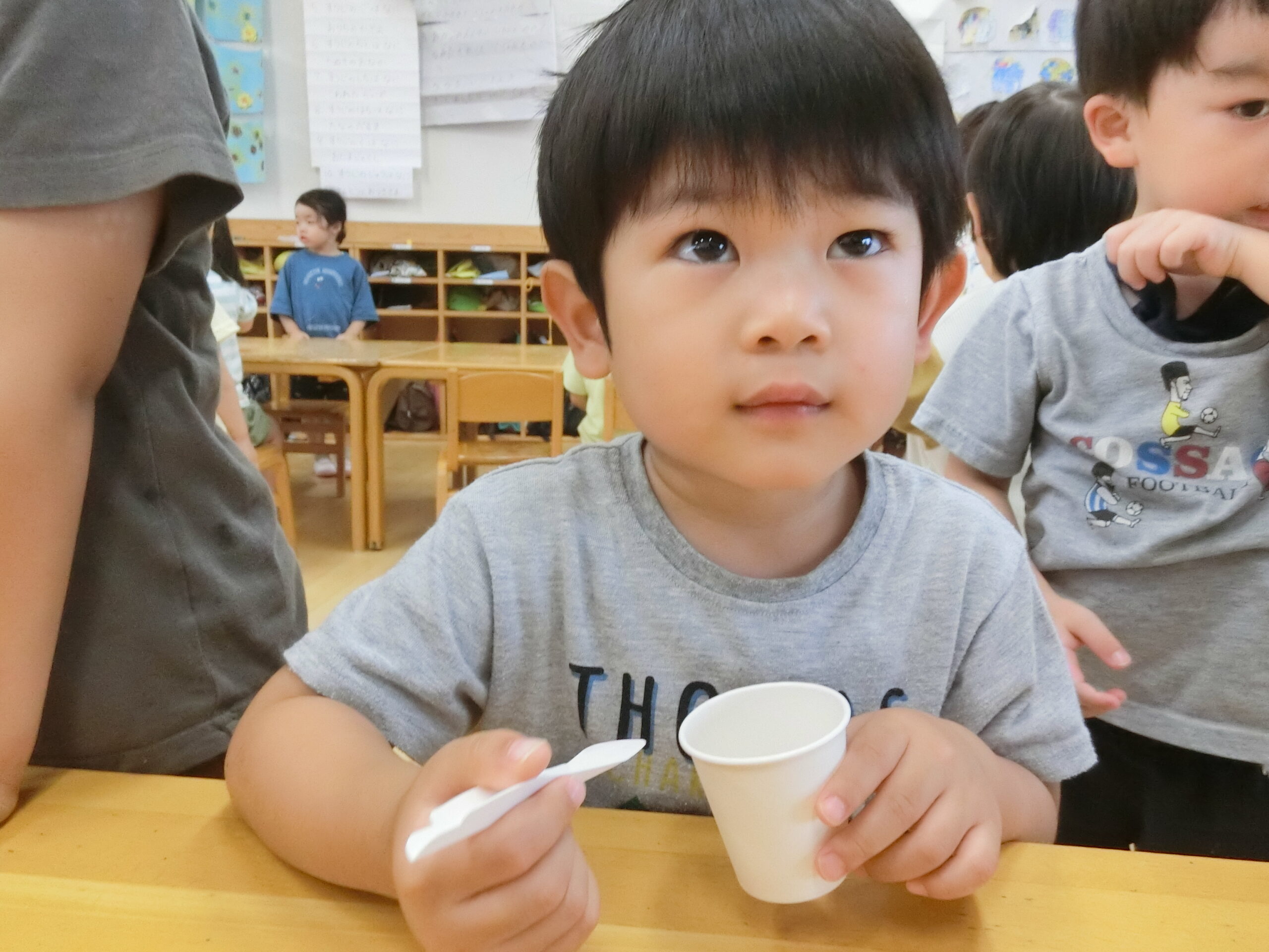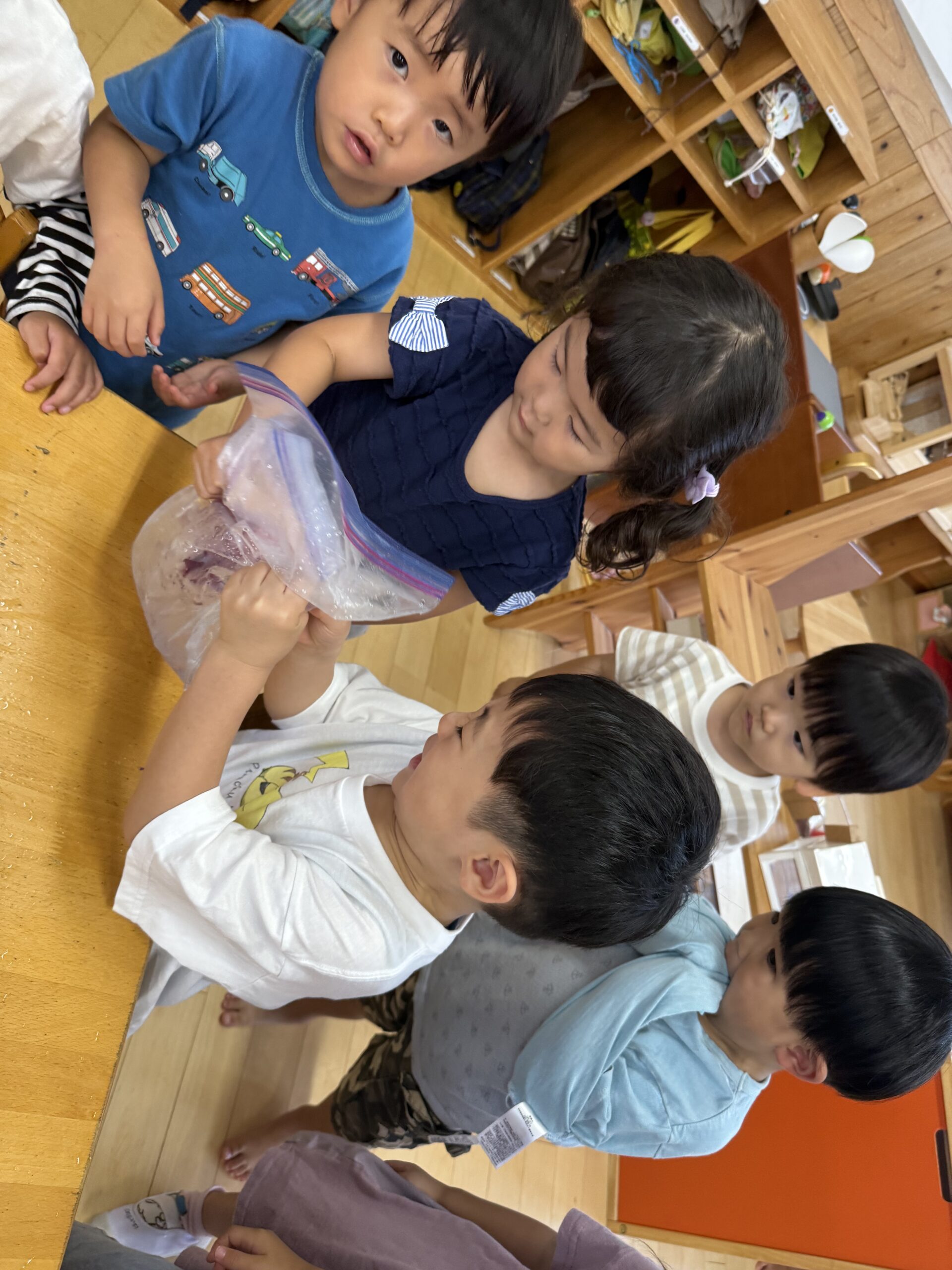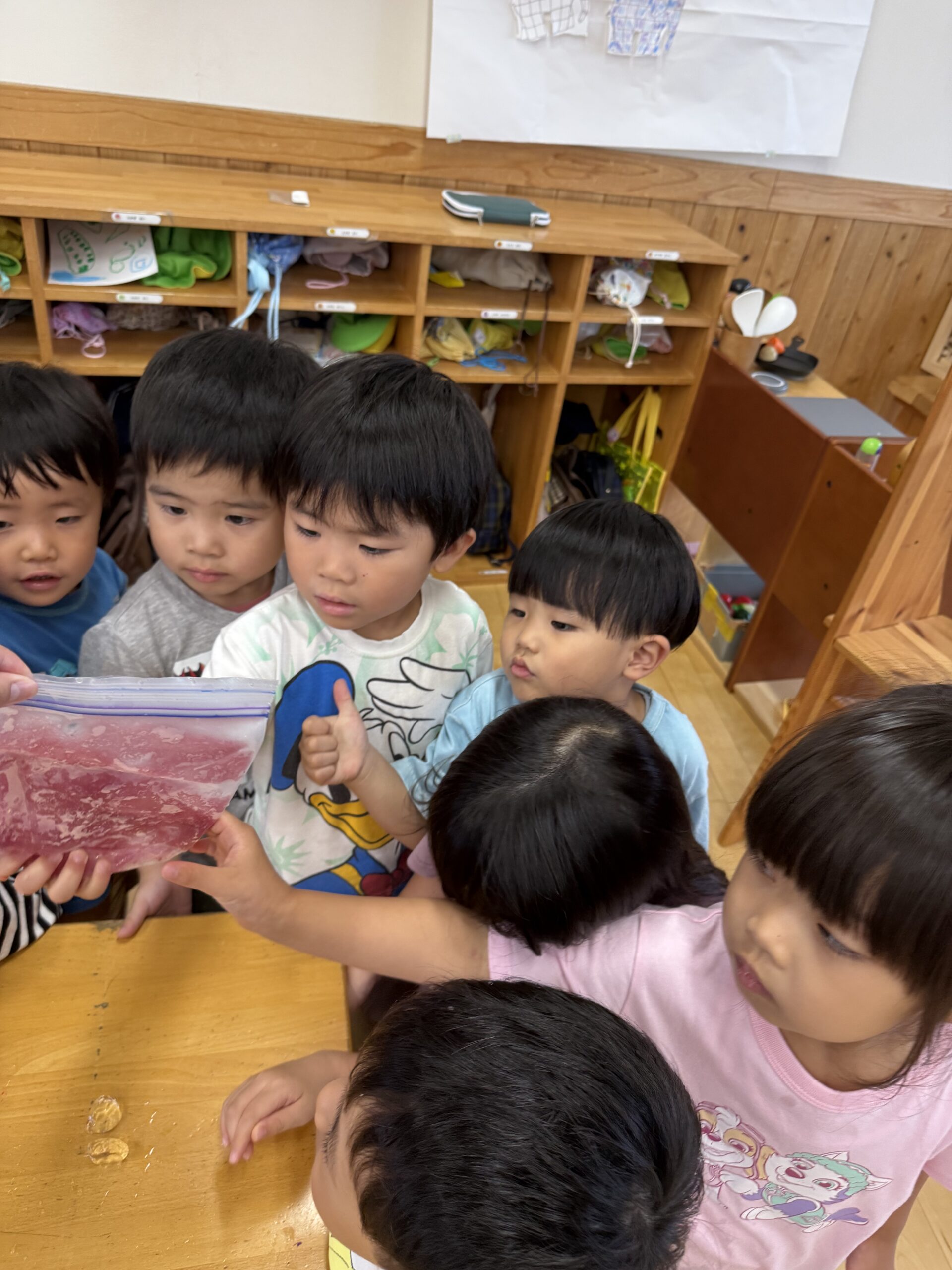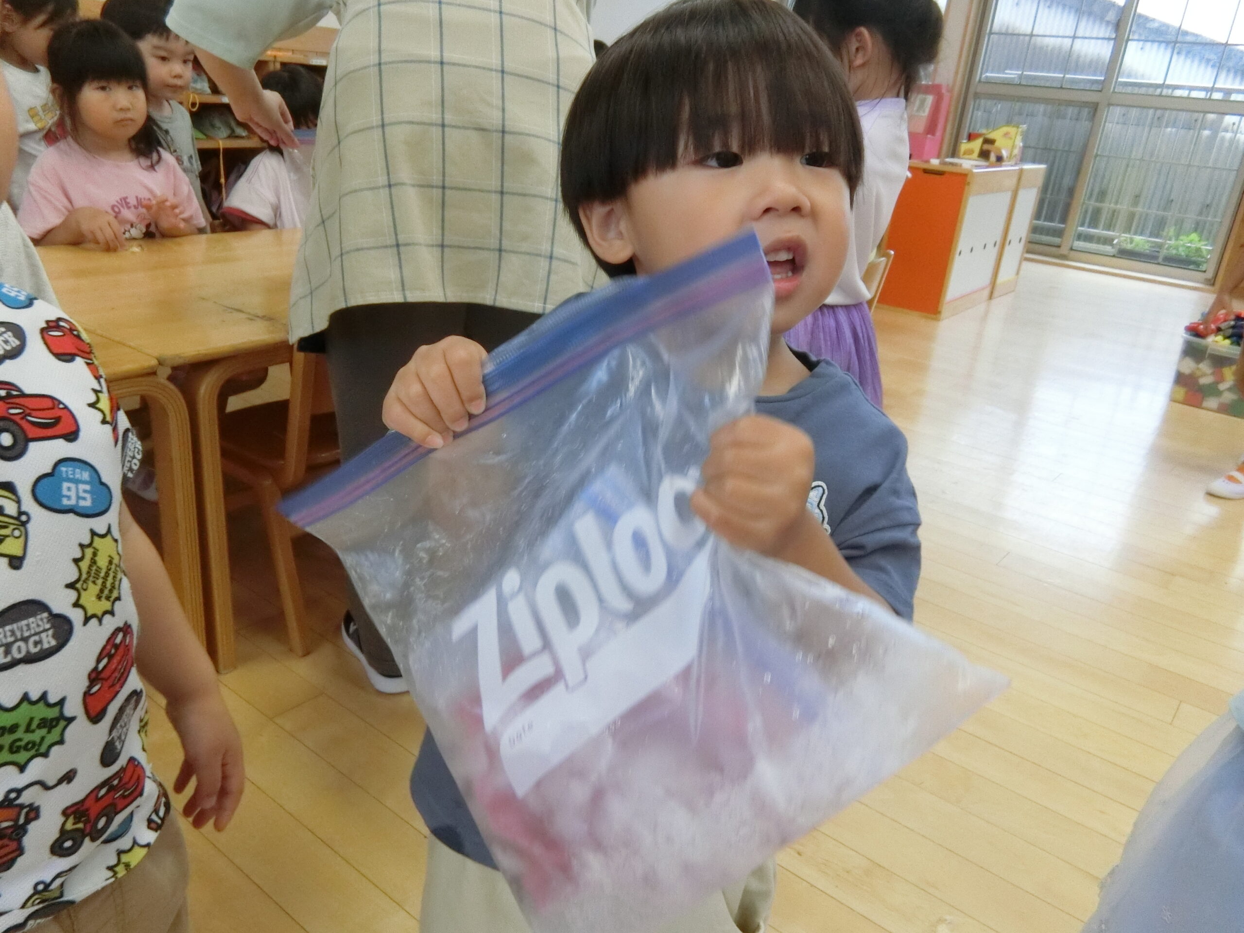 りす組さん、ぺんぎん組さん、ぱんだ組さんが集まってシャーベット作りを楽しみました!