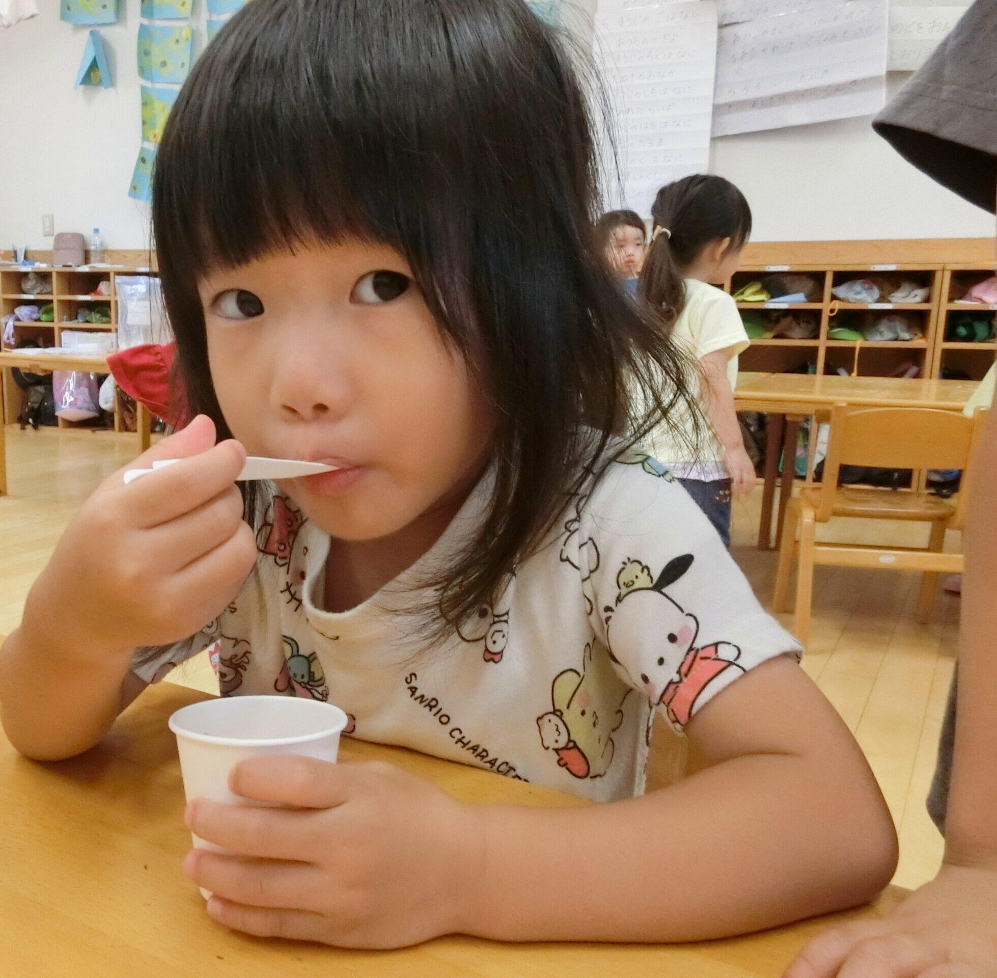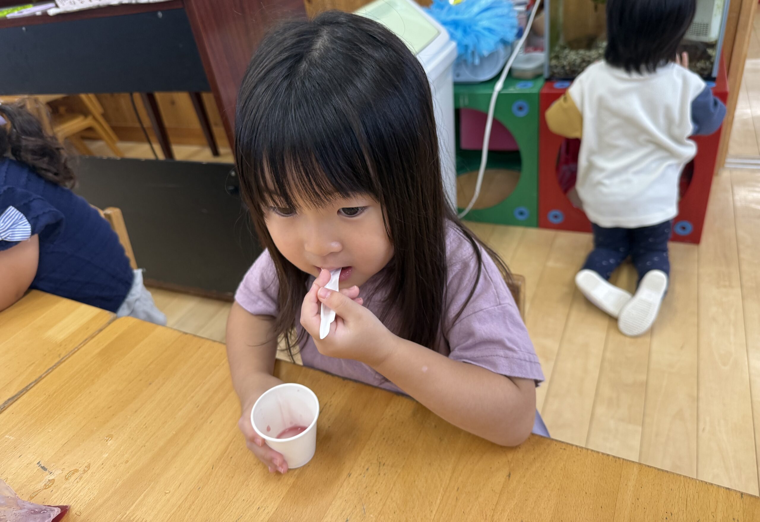 「あっ!固まった!これ、何!?」と出来てきたシャーベットにびっくり顔のりす組さんたち😆