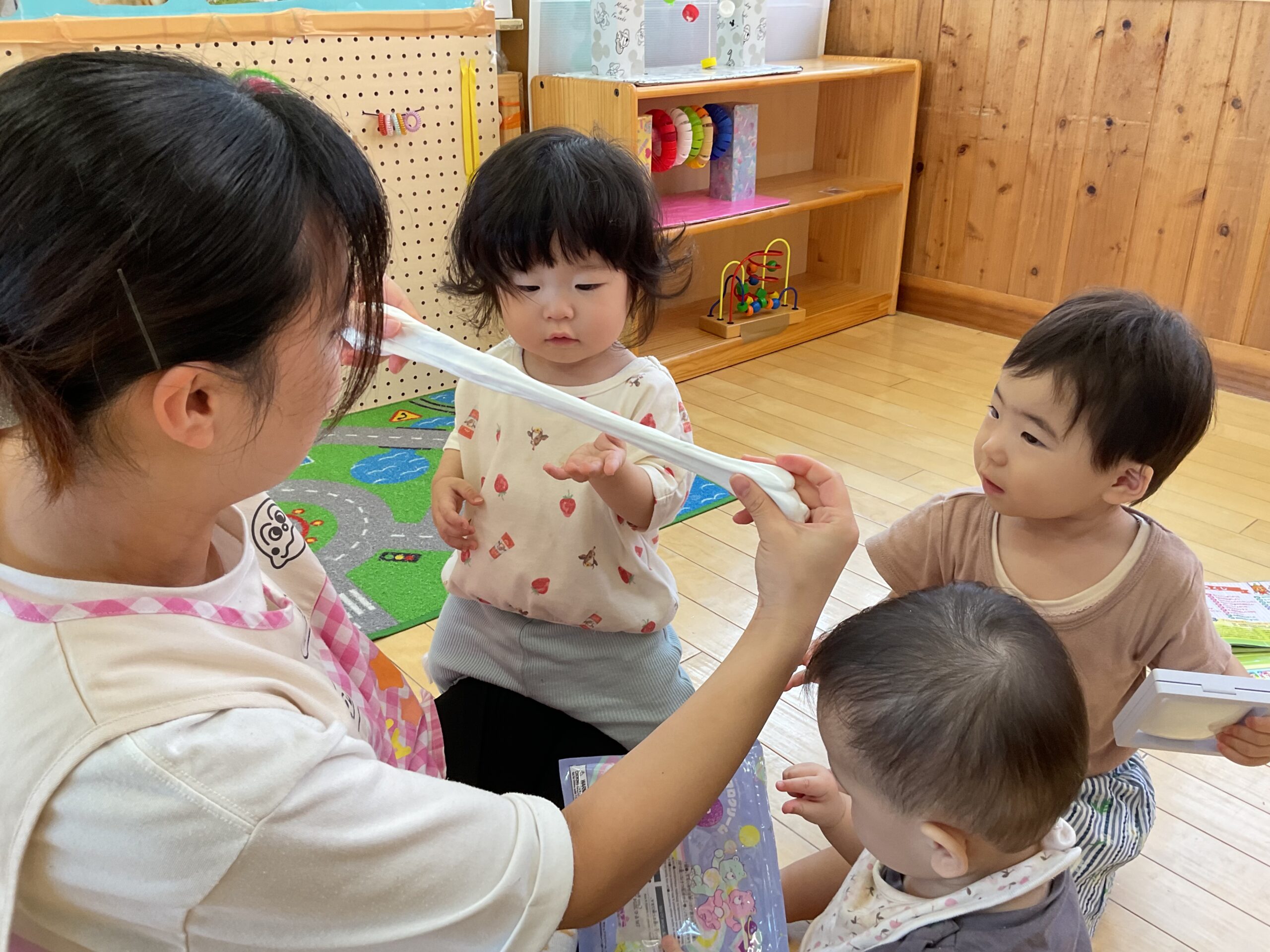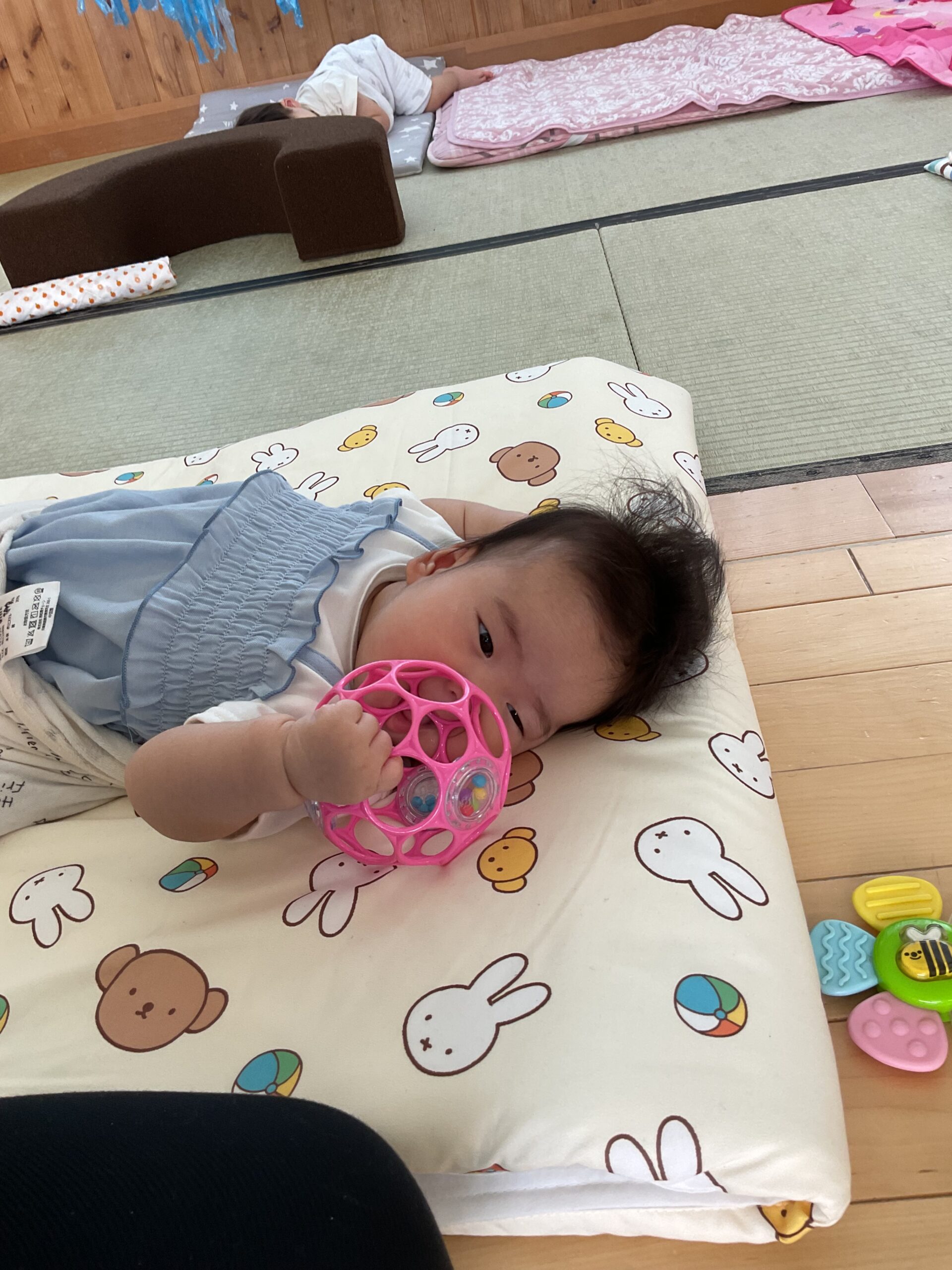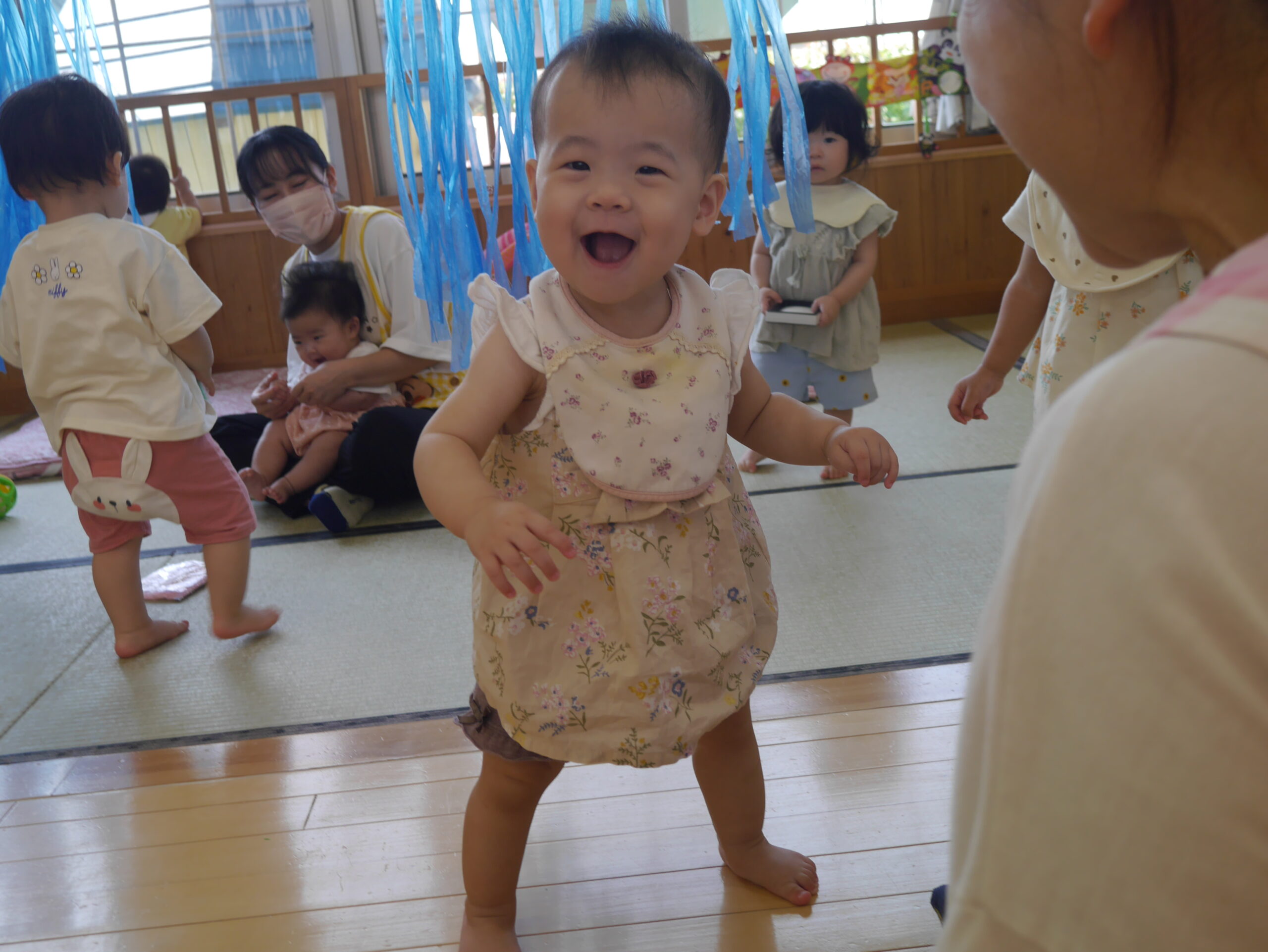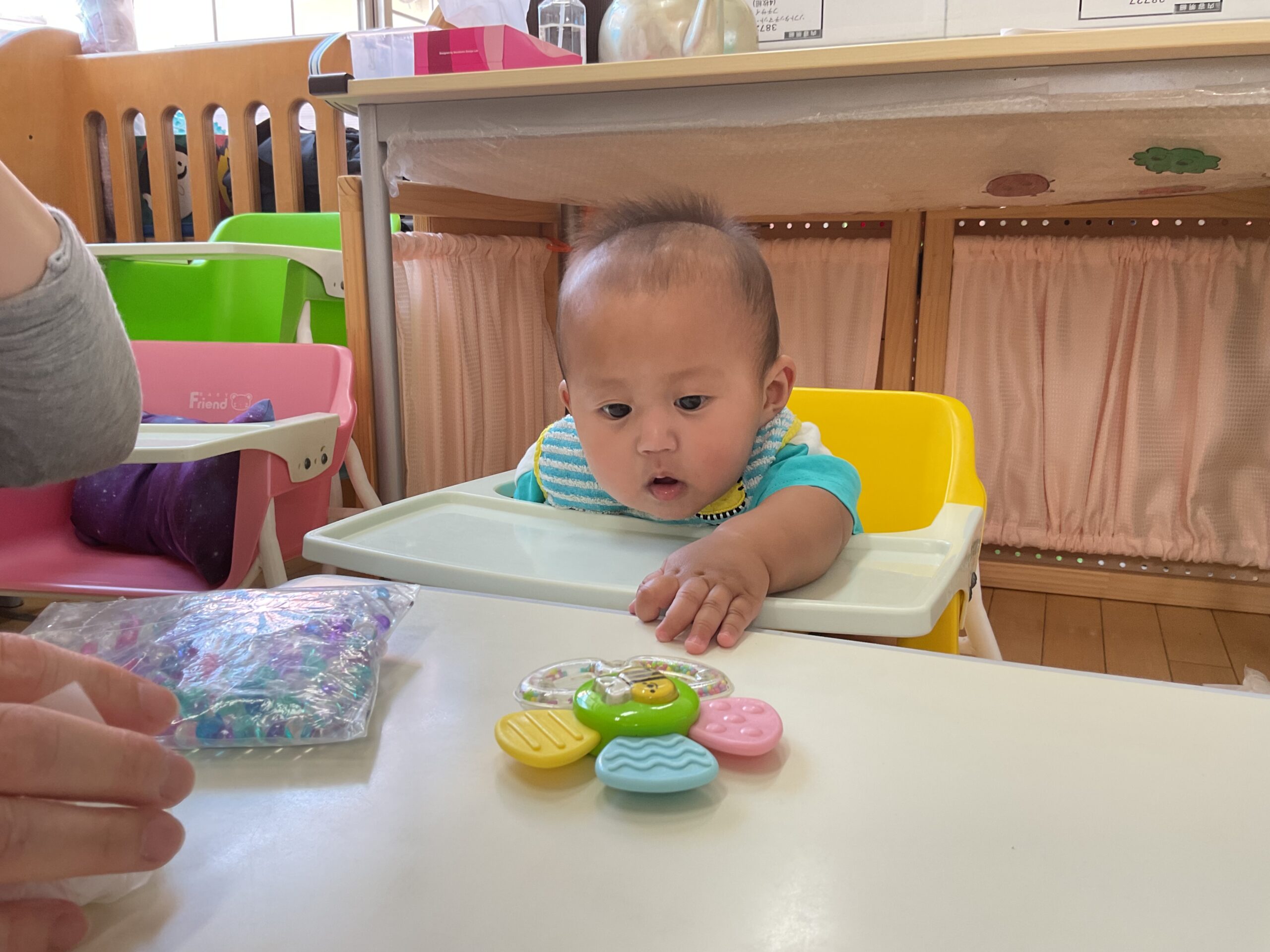 低月齢のお友だちも保育者と一緒に触れ合い遊びをしたり、音がなる遊びを目で追ったり・・目を輝かせて全身で喜んでくれる姿が可愛いです☺️