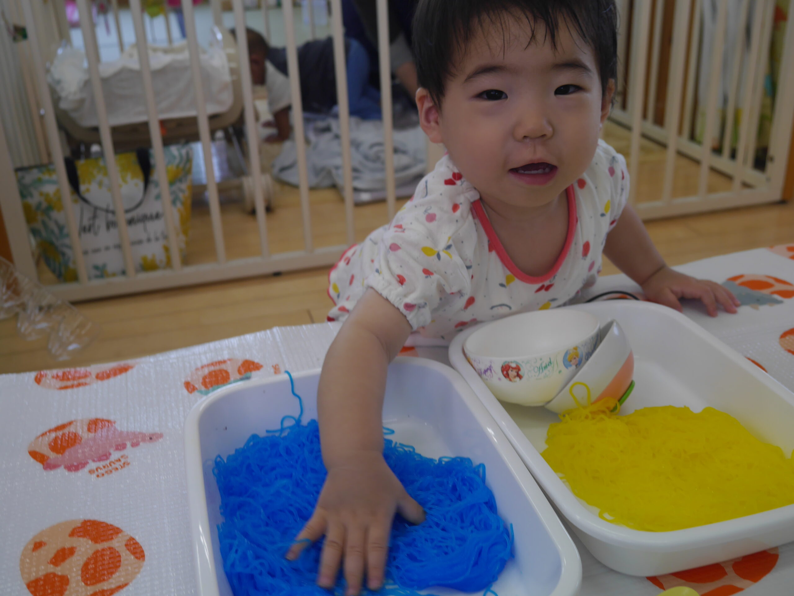最近てんとうむし組では、お部屋の中で春雨・氷・寒天などの感触遊びで遊ぶことが増えました。