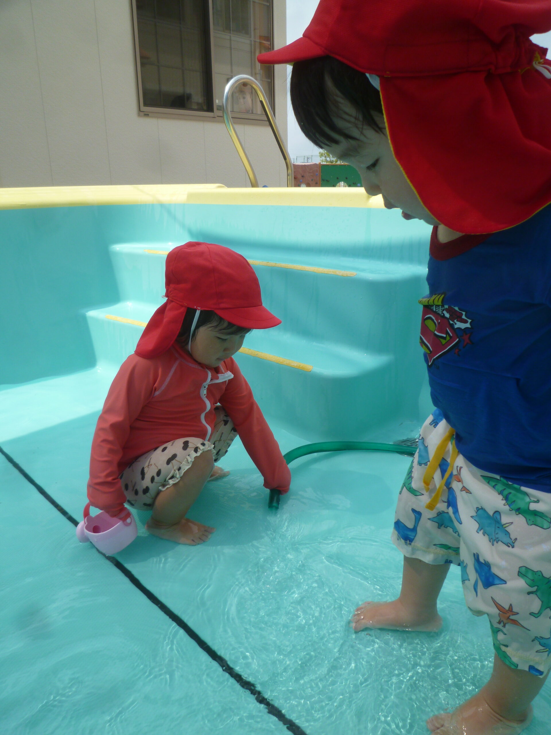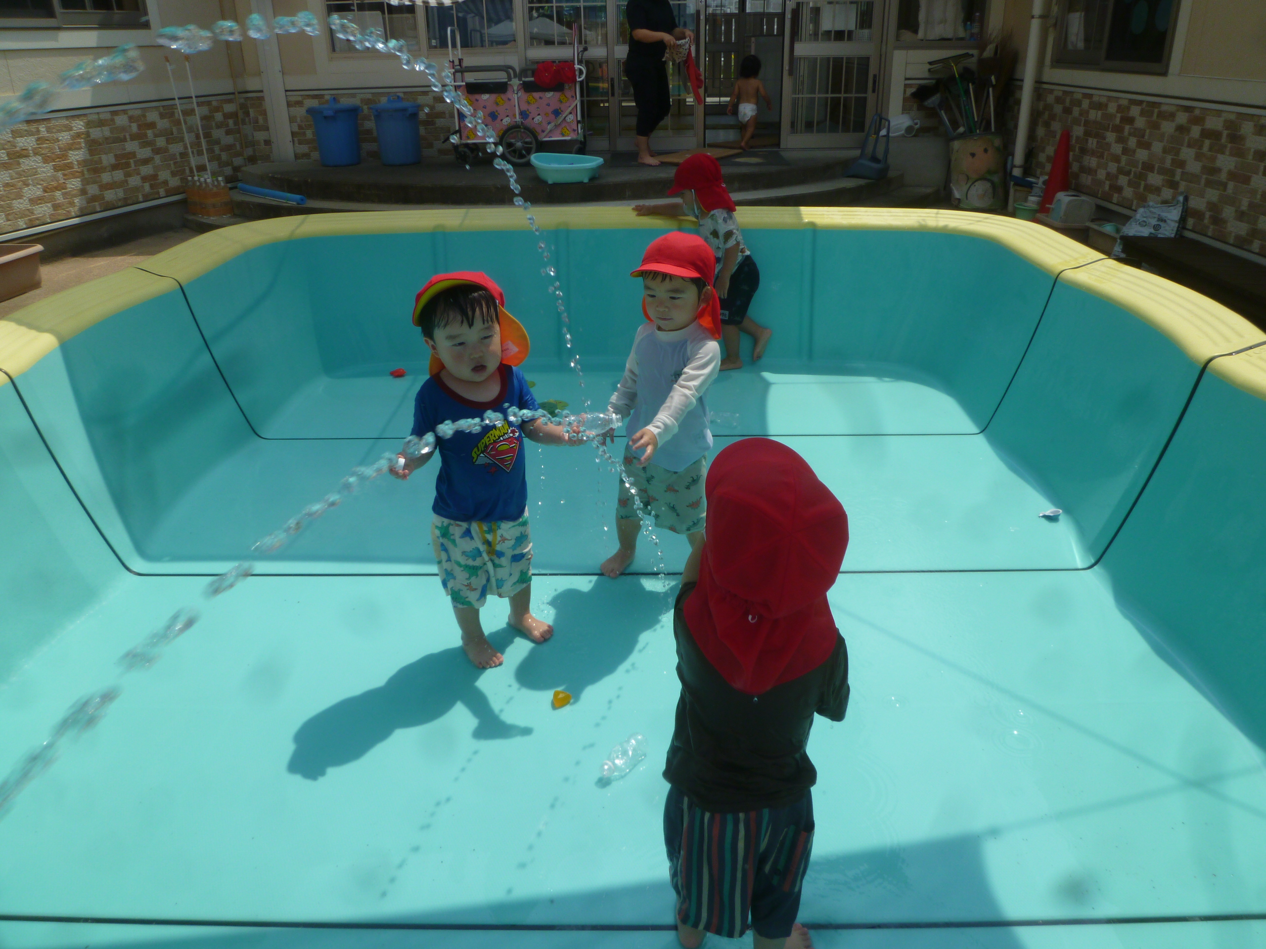 ビニールプールで遊ぶことが多いんですが、チャンスがあるときはお兄さんお姉さん達の大きいプールで遊ばせてもらったり、プールスティックに穴をあけてホースを通して水を流すとポタポタと雨のように降らせてみたり・・・😆