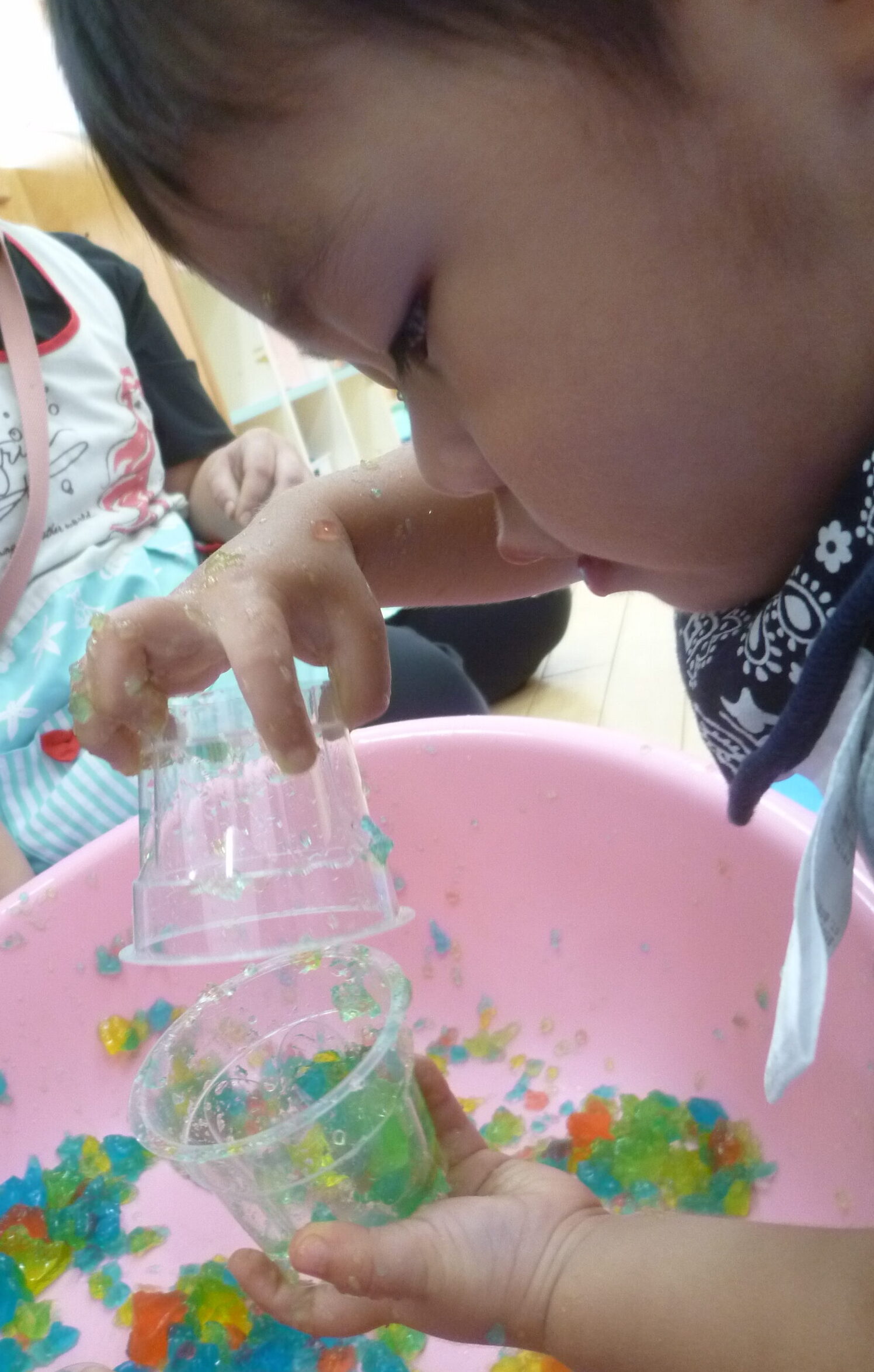 感触遊びは指先を使うだけでなく、色への興味、リラックス効果、目で見る、触る等や触っていくことで次はどうなるのかな?と考える力も育っていきますよ。