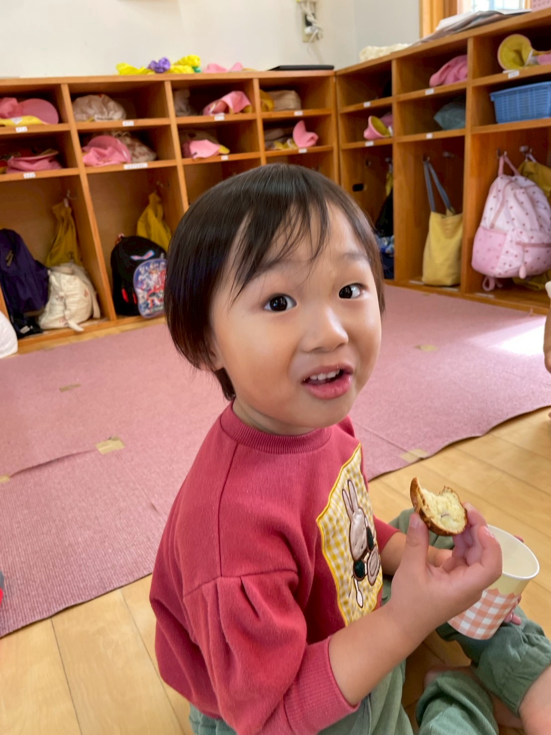 「うわ~おいもじゃん!おっきいね」「うんとこしょってしておいもとったね!」「先生がんばれ~」と保育士がさつまいもを細かく切る様子を見つめる子どもたちでしたよ☺