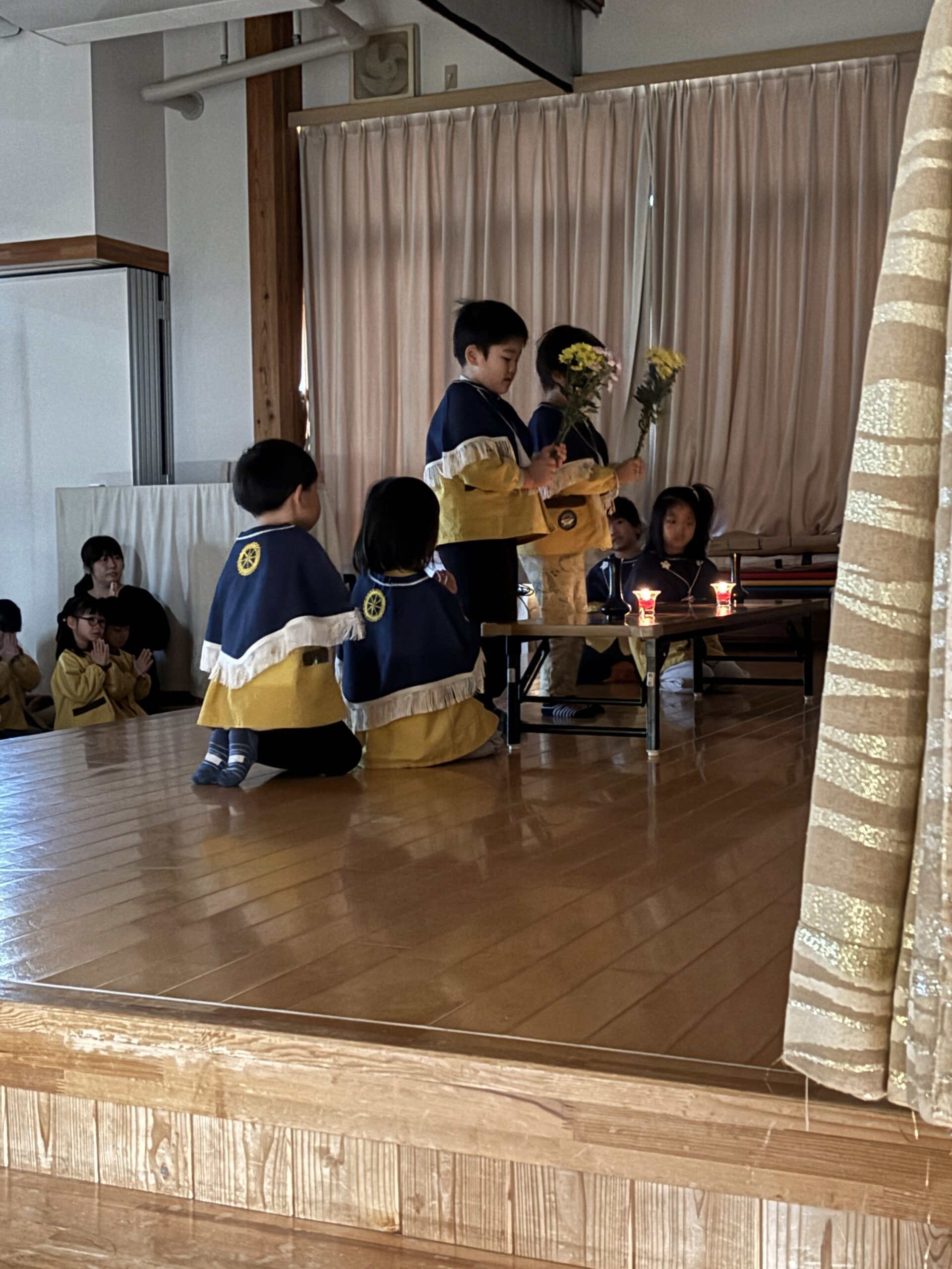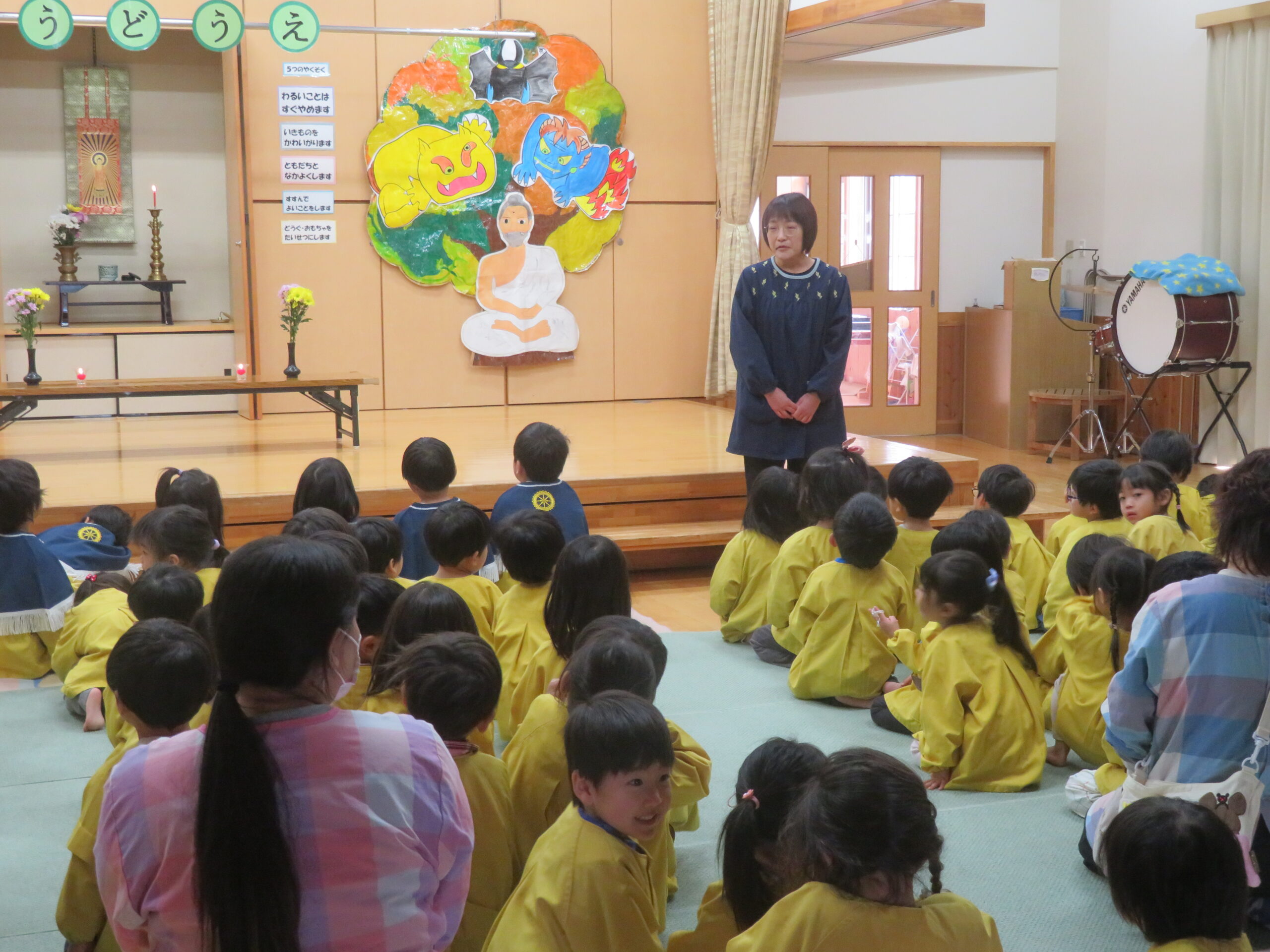 仏教行事を通して、みんなと共に生きていることの喜びを感じたり、周りに支えられていることへの感謝の気持ちを大切にしながら、今後も日々の保育において様々な思いに寄り添いながら関わっていきたいと改めて感じました。