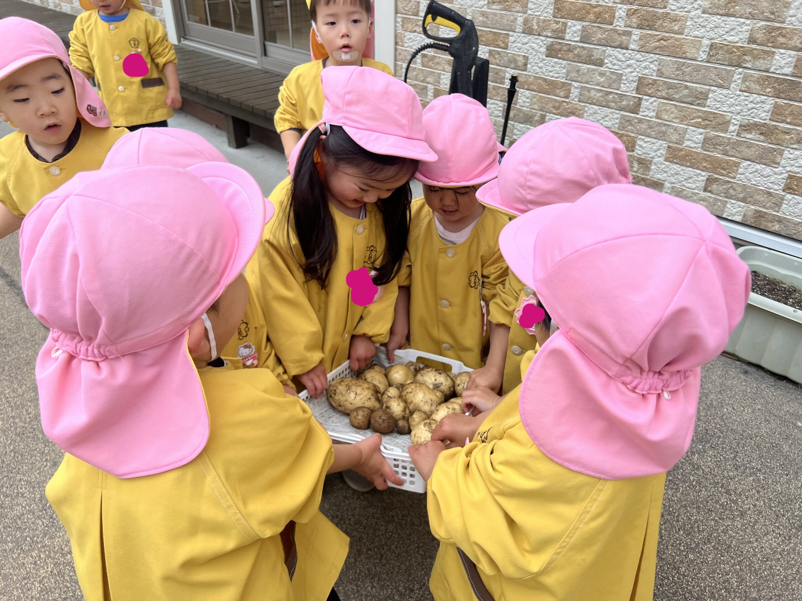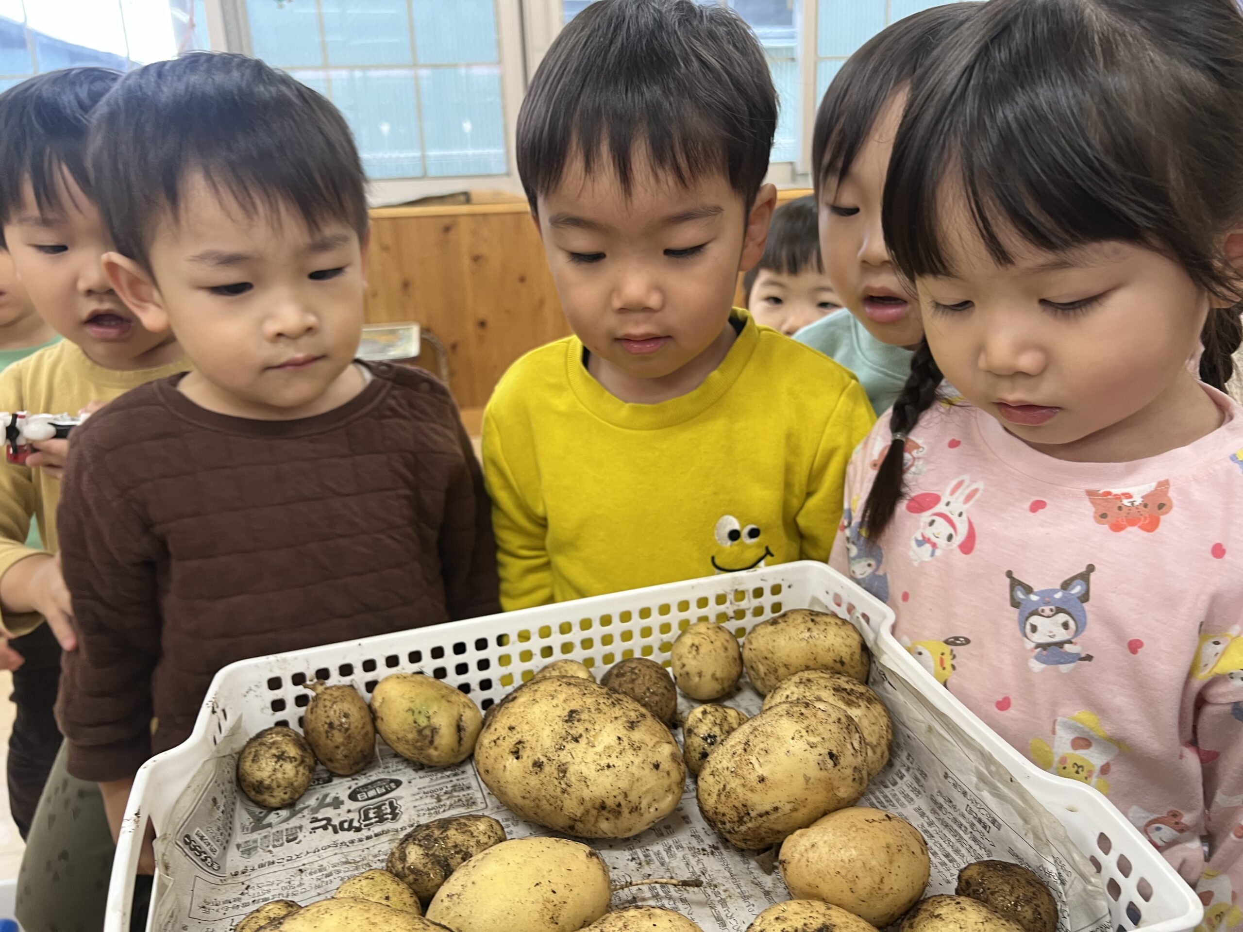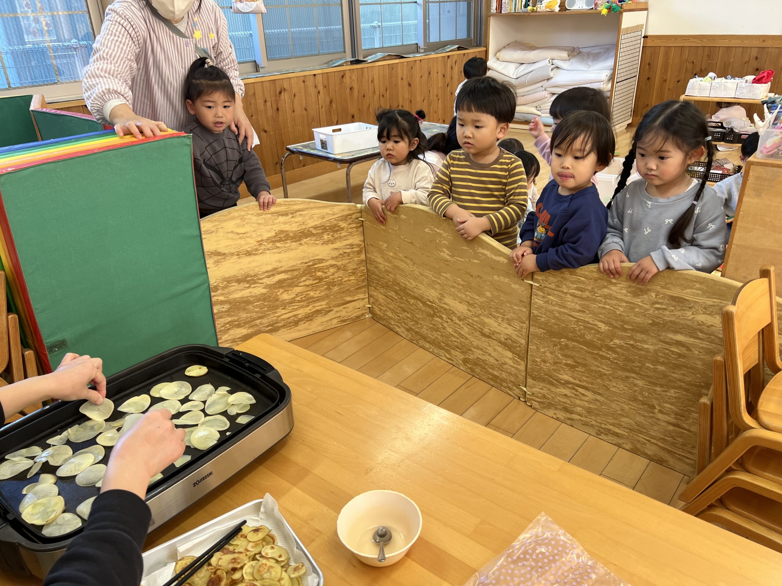 焼く前のじゃがいもにみんなで少し触ってみます。「つめたいね」「ぺらぺらだぁ」「なんかにおいするね」と感じたことをお話ししてくれましたよ😊