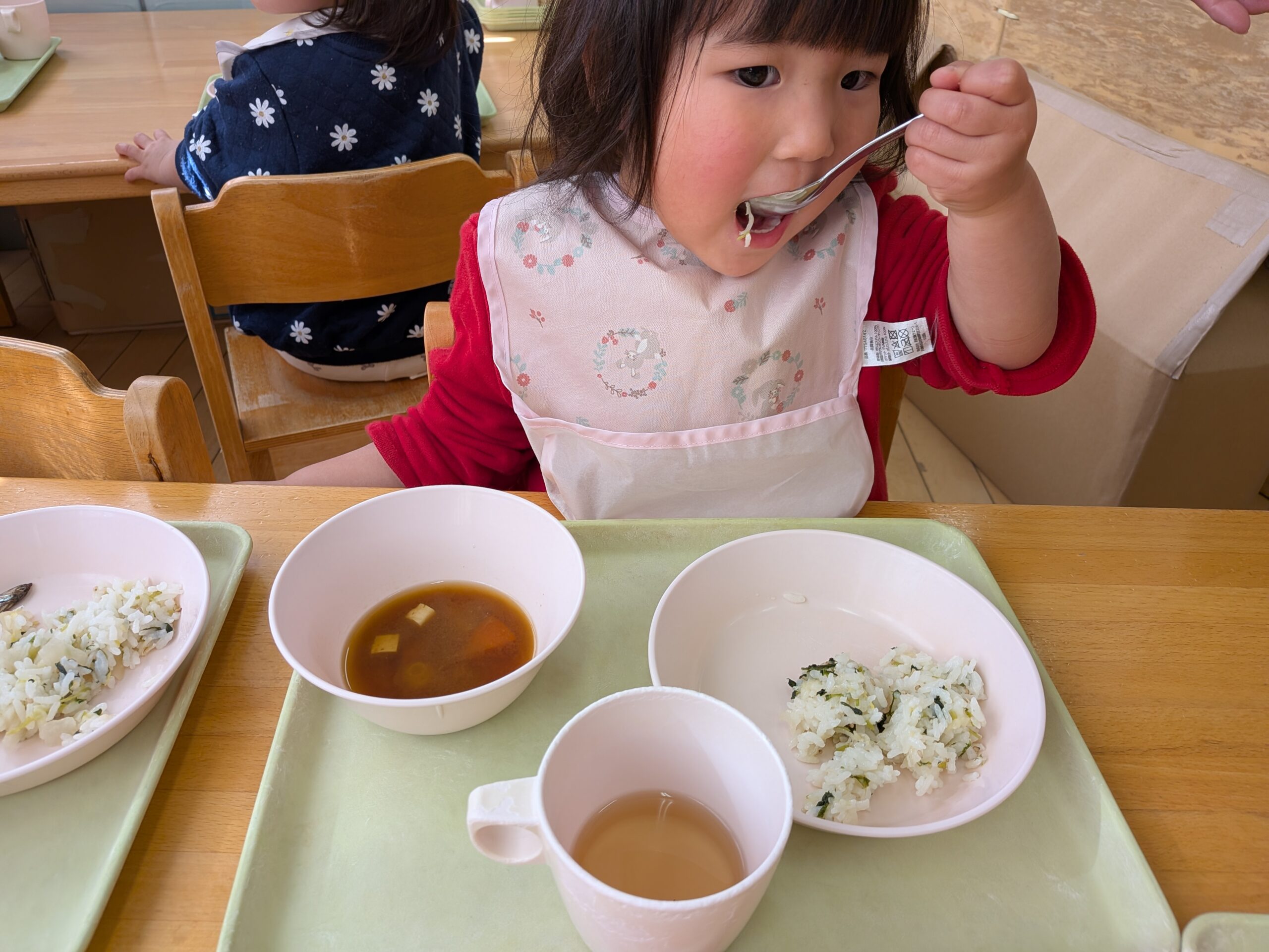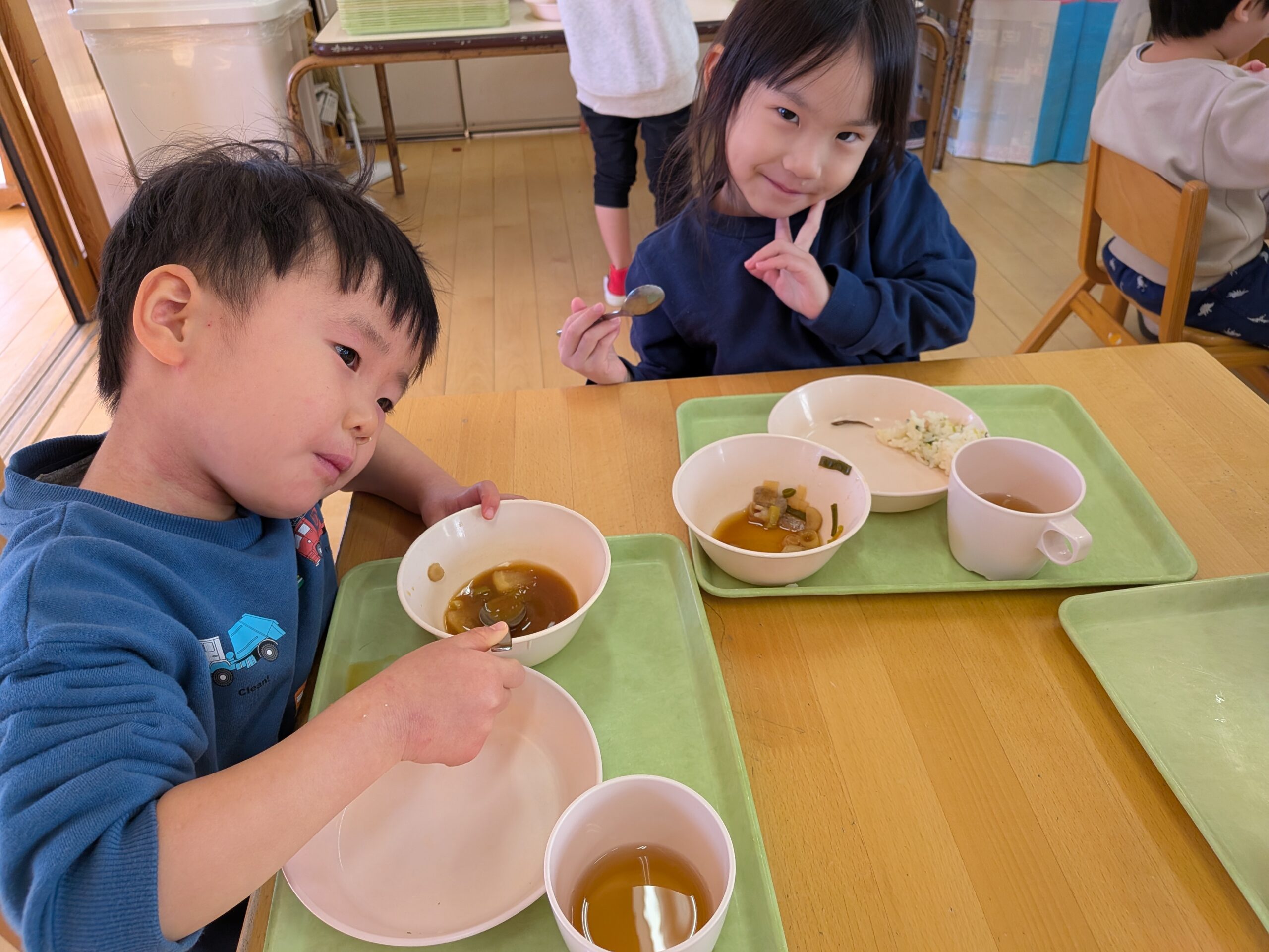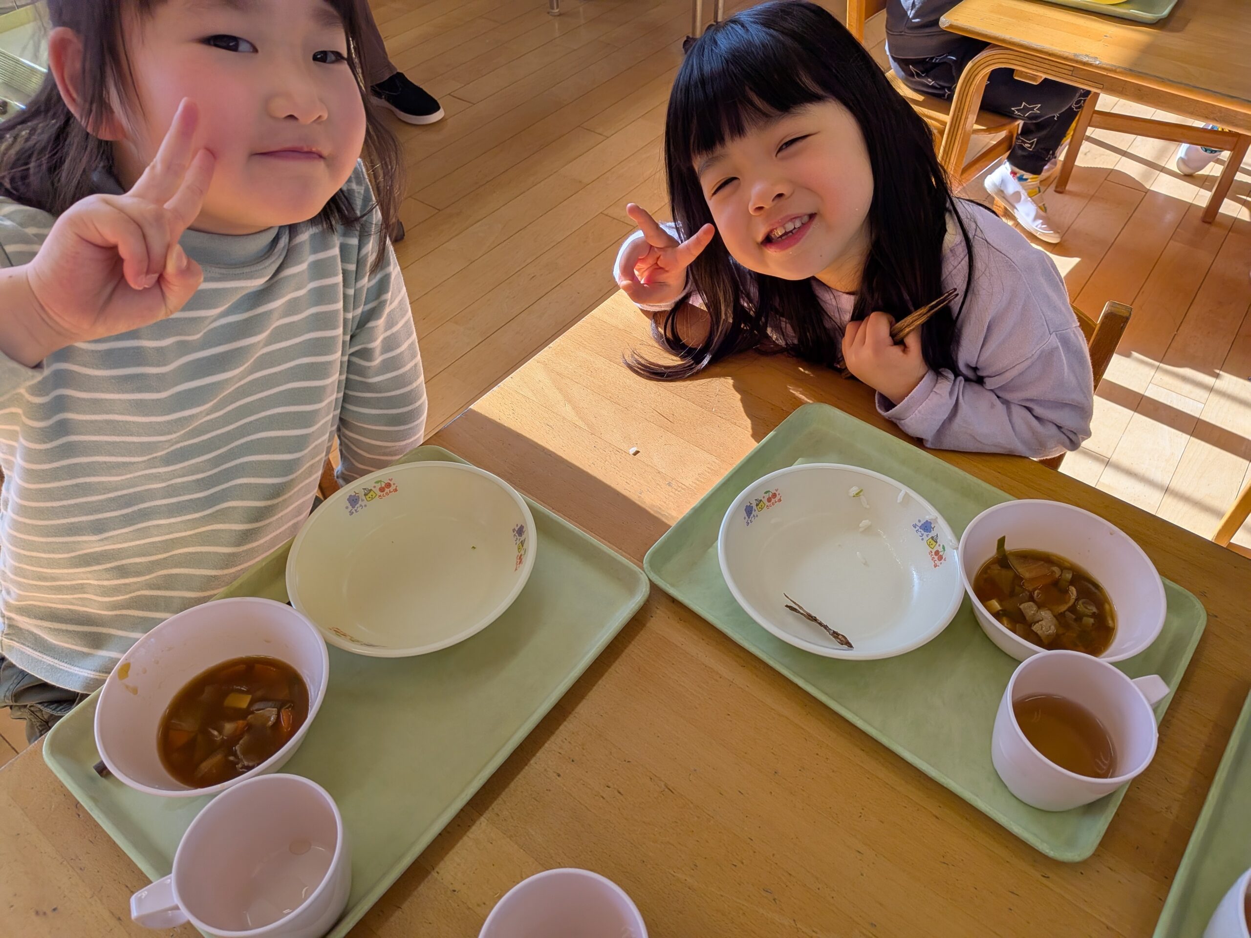 季節の給食🍚 2026.01.08 あけましておめでとうございます。 2026年、最初の季節の給食は、 七草風ごはん、豚汁、田つくりでした😄 早速子どもたちのところに!! 田つくりぱく!! お野菜もぱく!! 美味しいポーズ✌ ご飯美味しい🍚 ピカピカなお皿になっていました! 意外と田つくりが人気でした🐟️ 一年に一度の日。 七草を食べ、この一年健康で、 笑顔で元気に過ごせますように😌 < >