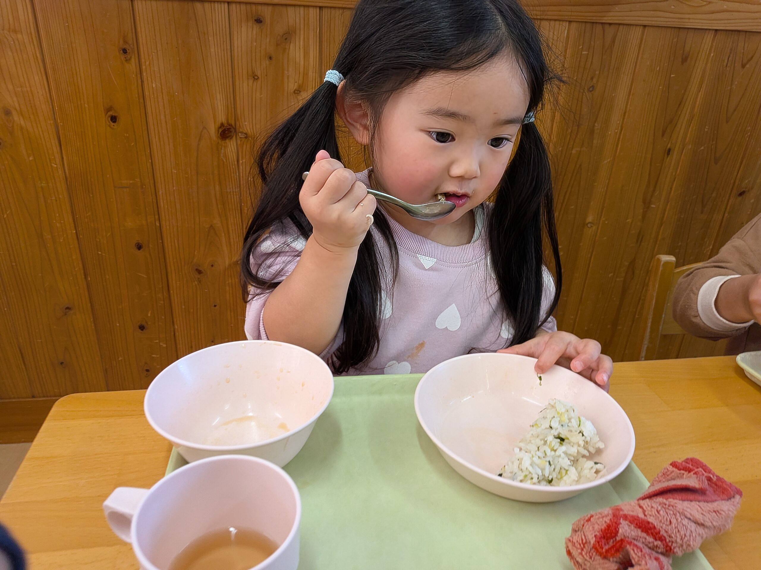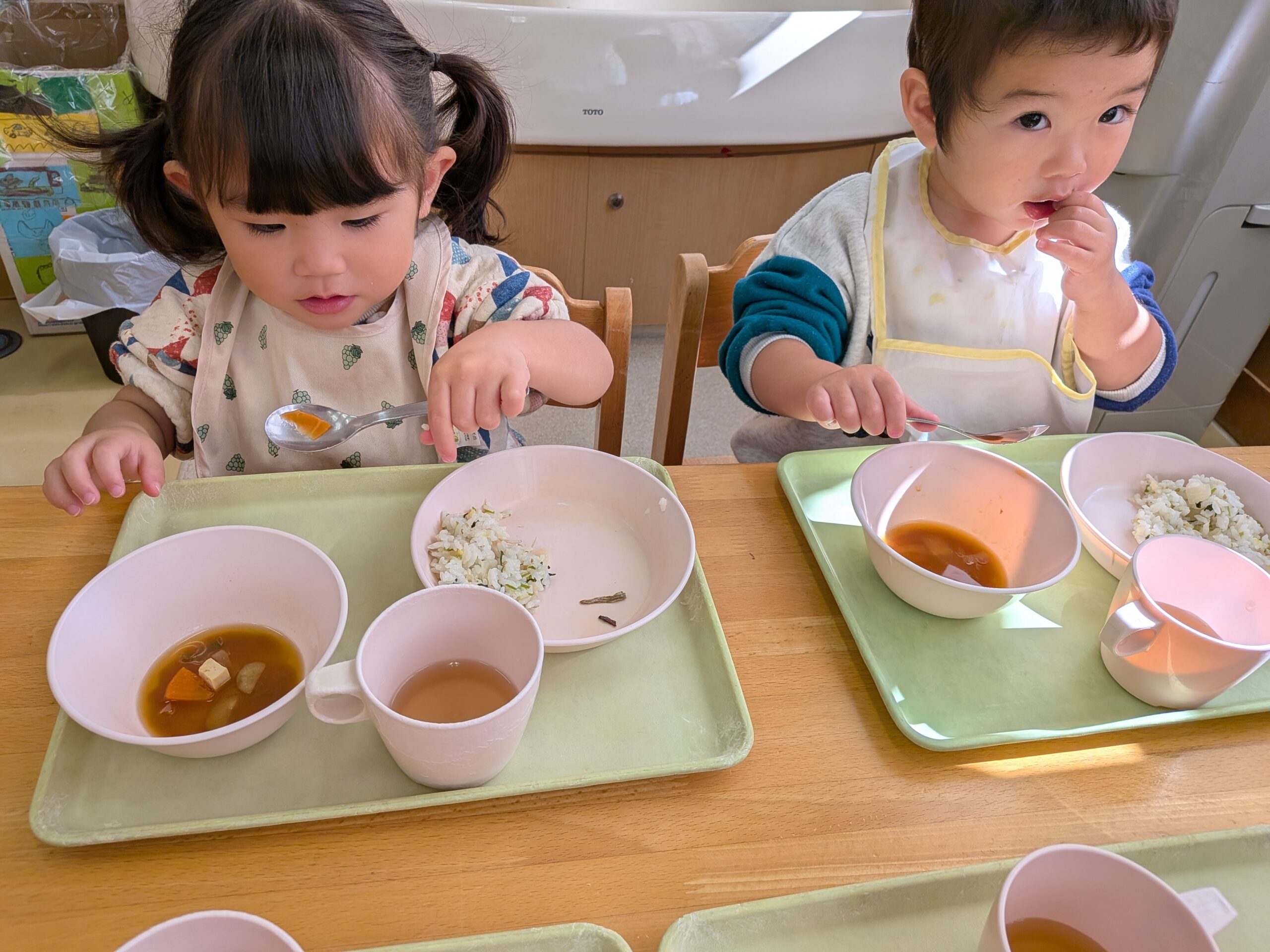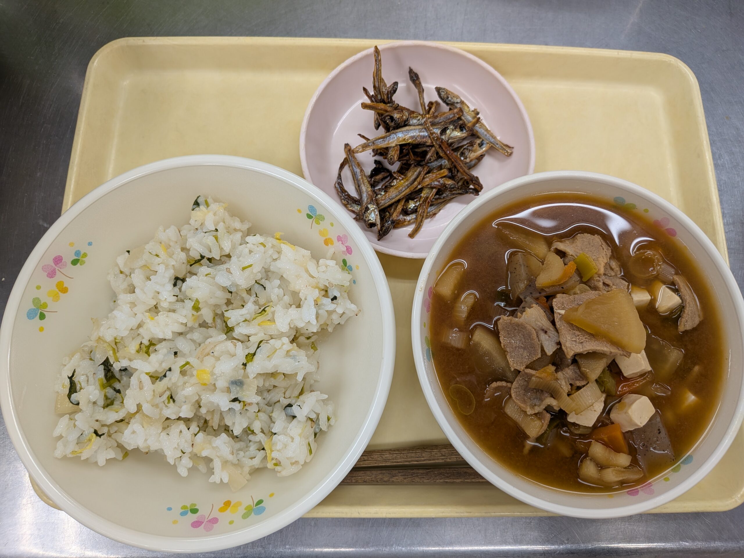 季節の給食🍚 2026.01.08 あけましておめでとうございます。 2026年、最初の季節の給食は、 七草風ごはん、豚汁、田つくりでした😄 早速子どもたちのところに!! 田つくりぱく!! お野菜もぱく!! 美味しいポーズ✌ ご飯美味しい🍚 ピカピカなお皿になっていました! 意外と田つくりが人気でした🐟️ 一年に一度の日。 七草を食べ、この一年健康で、 笑顔で元気に過ごせますように😌 < >