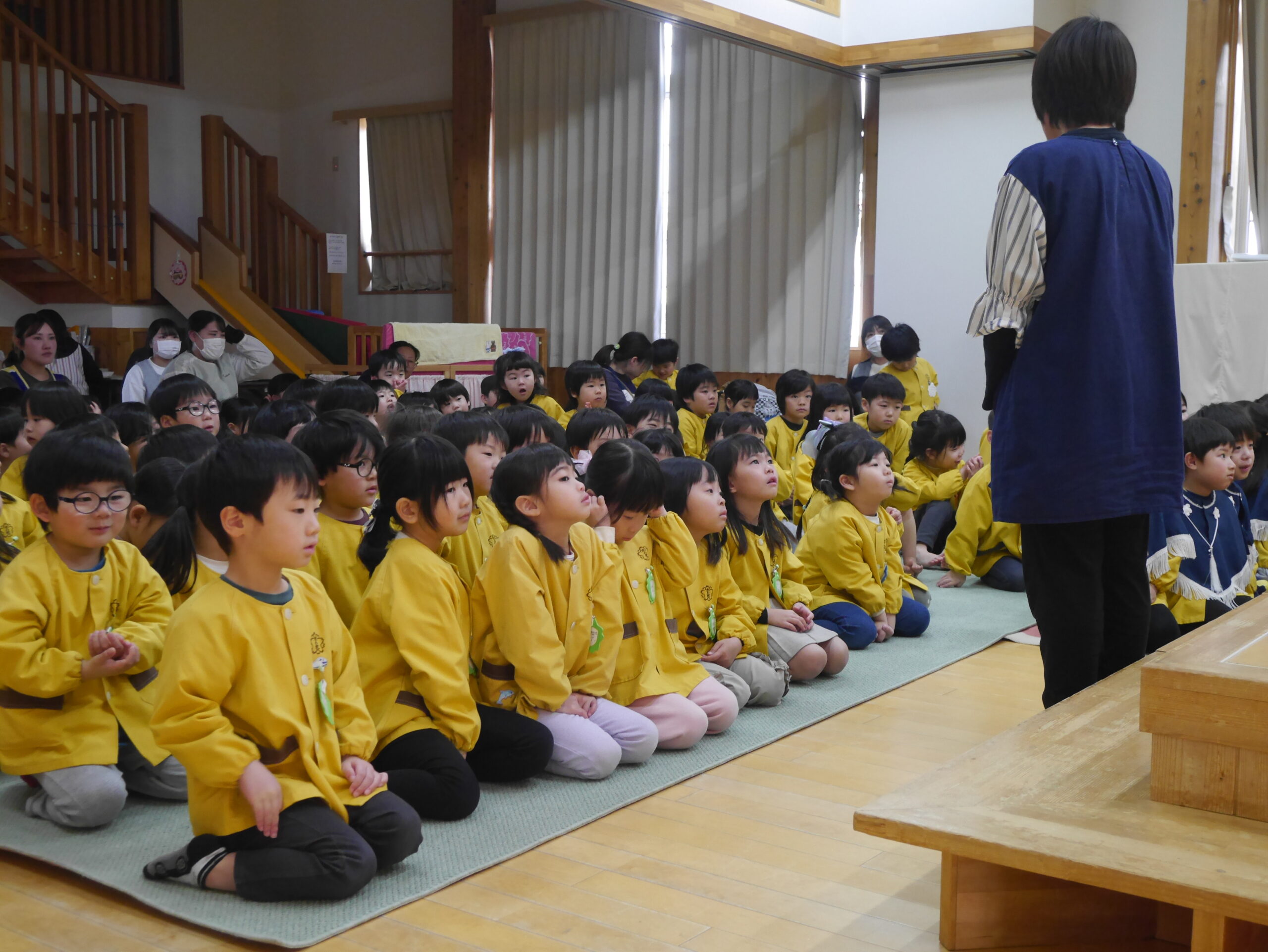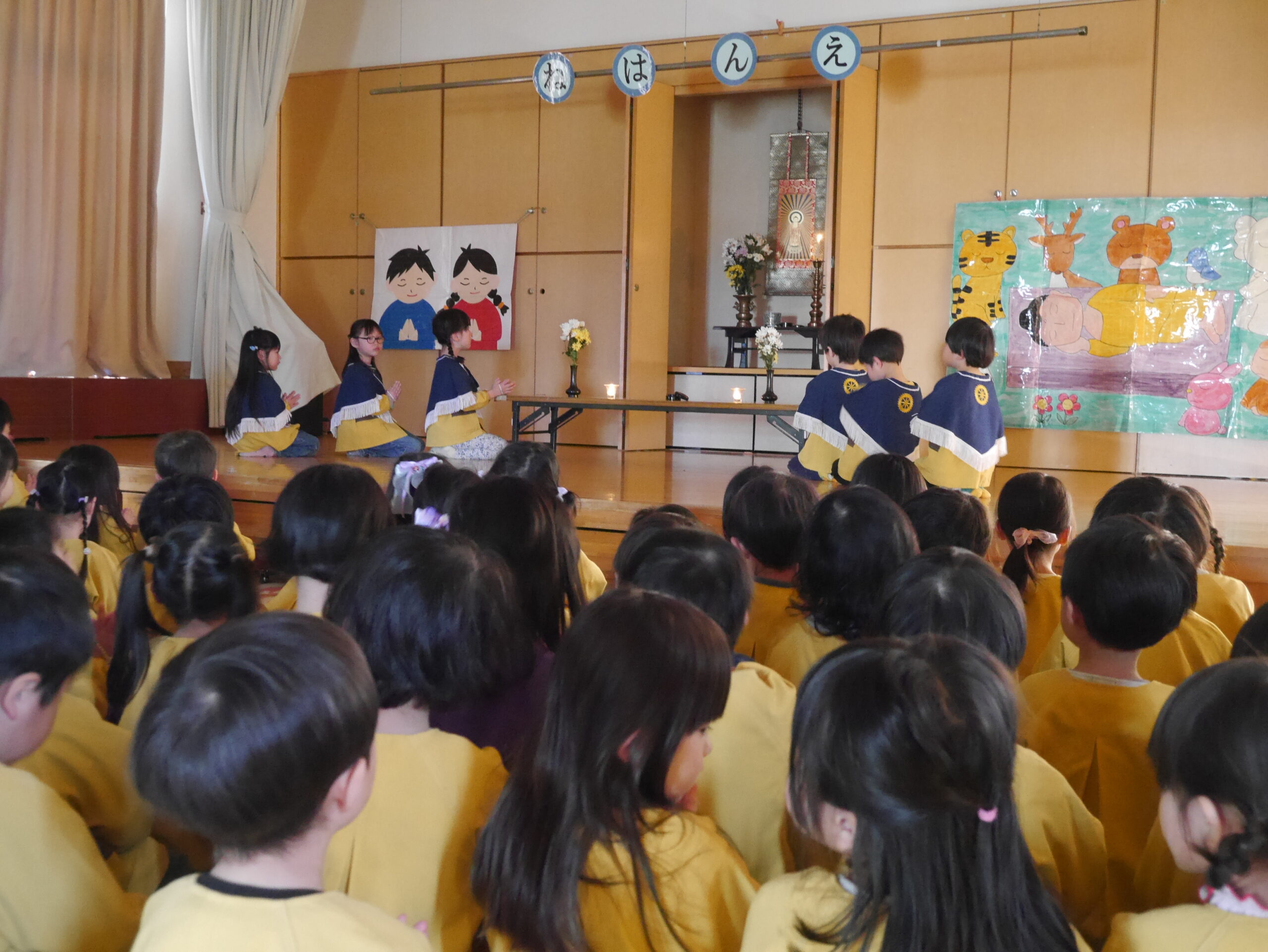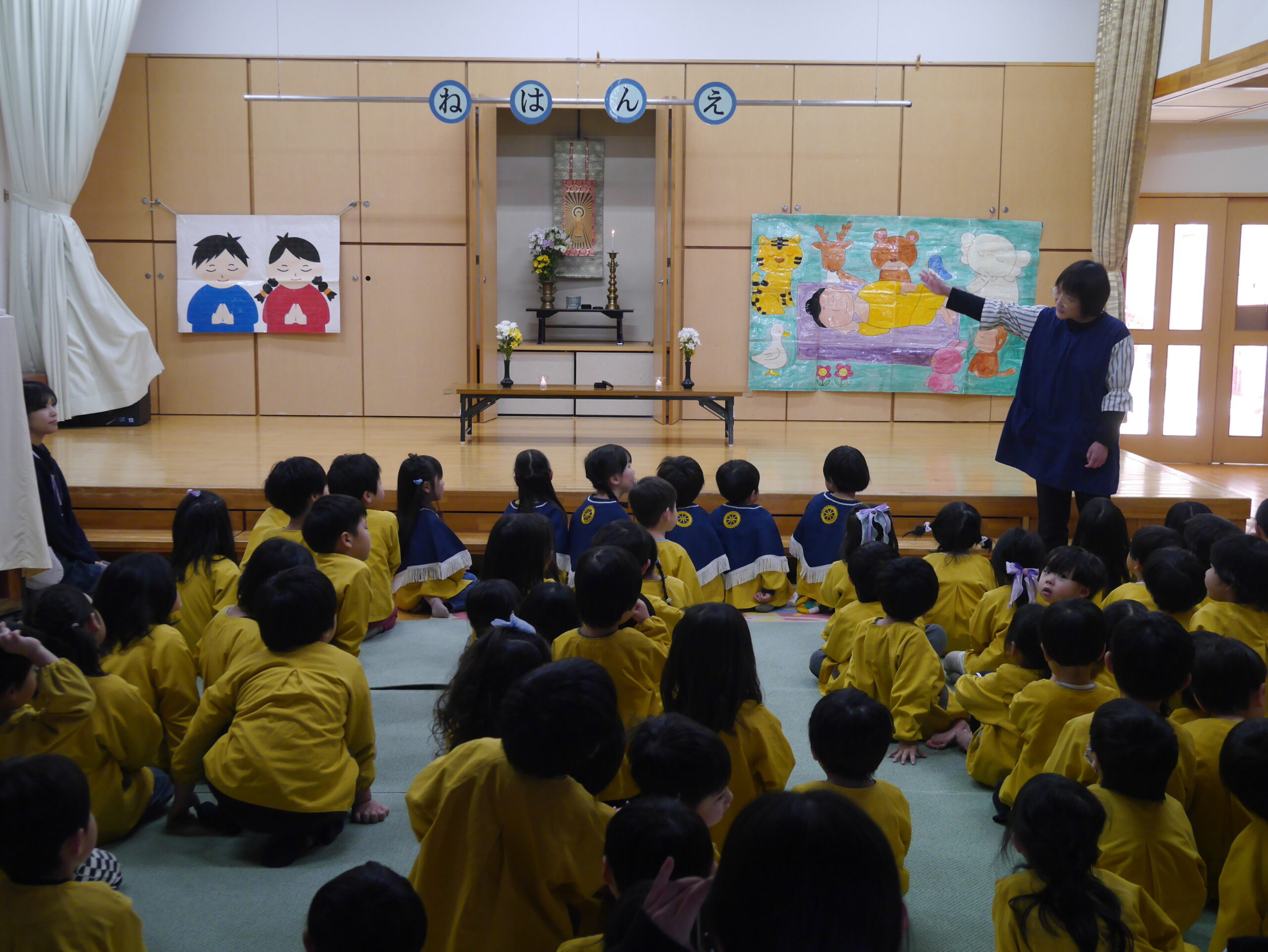 園長先生からのお話を聞きました。涅槃会ってどんな日なんだろう・・お釈迦様が亡くなられて、周りのみんな、動物たちも集まってきて悲しい気持ちだったことなどを教えてもらいました。