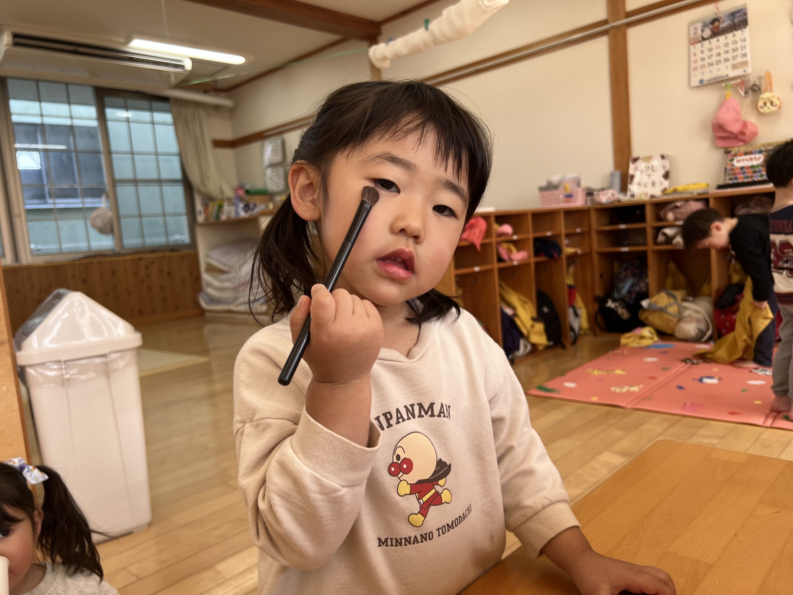 こちらが説明しなくてもチークはほっぺに、アイシャドウはまぶたに、しかもそれぞれちゃんと専用のブラシを使ってお化粧していて、お家の人がやっているのをよくみているのだなぁと感心してしまいました✨
