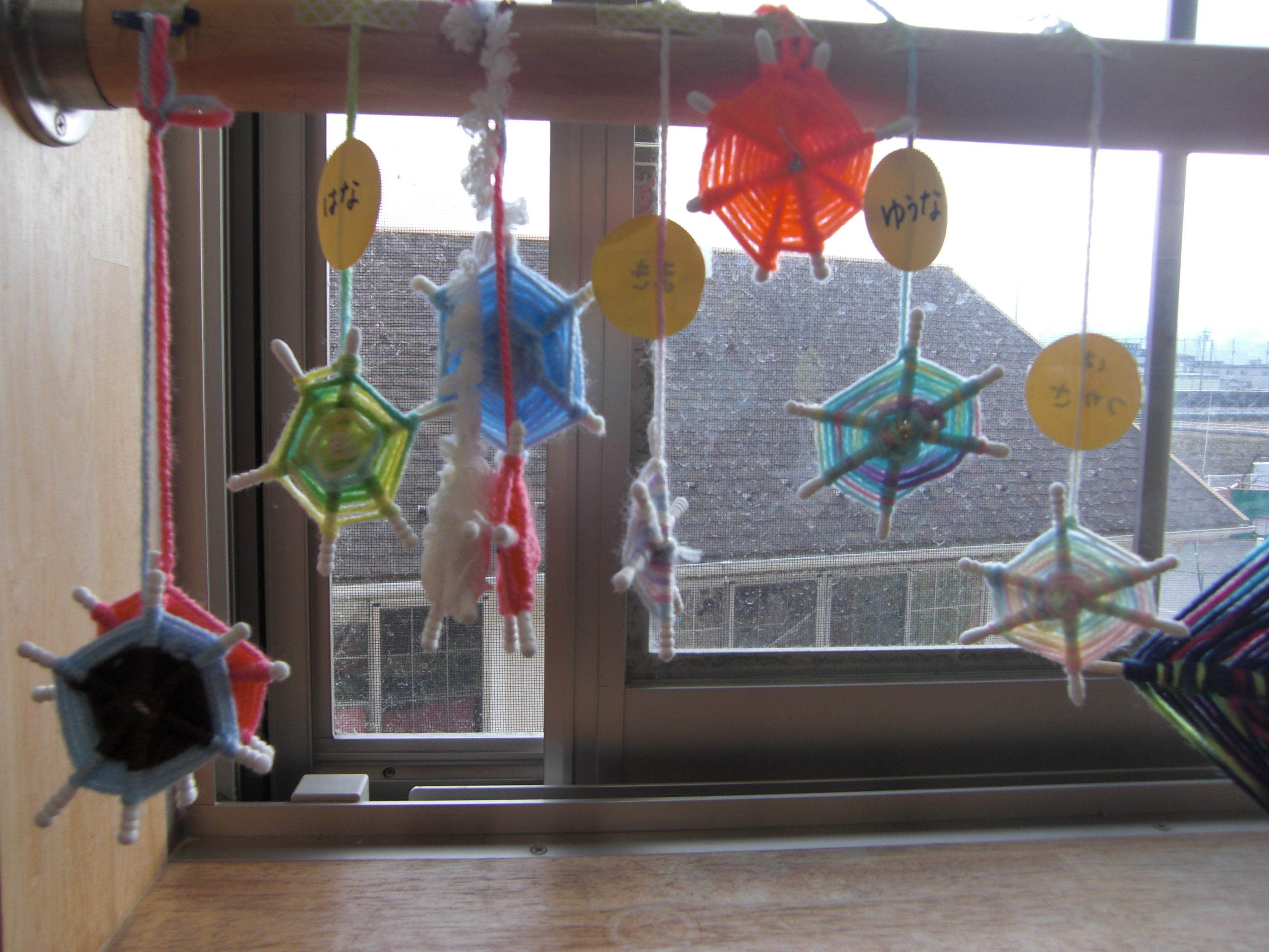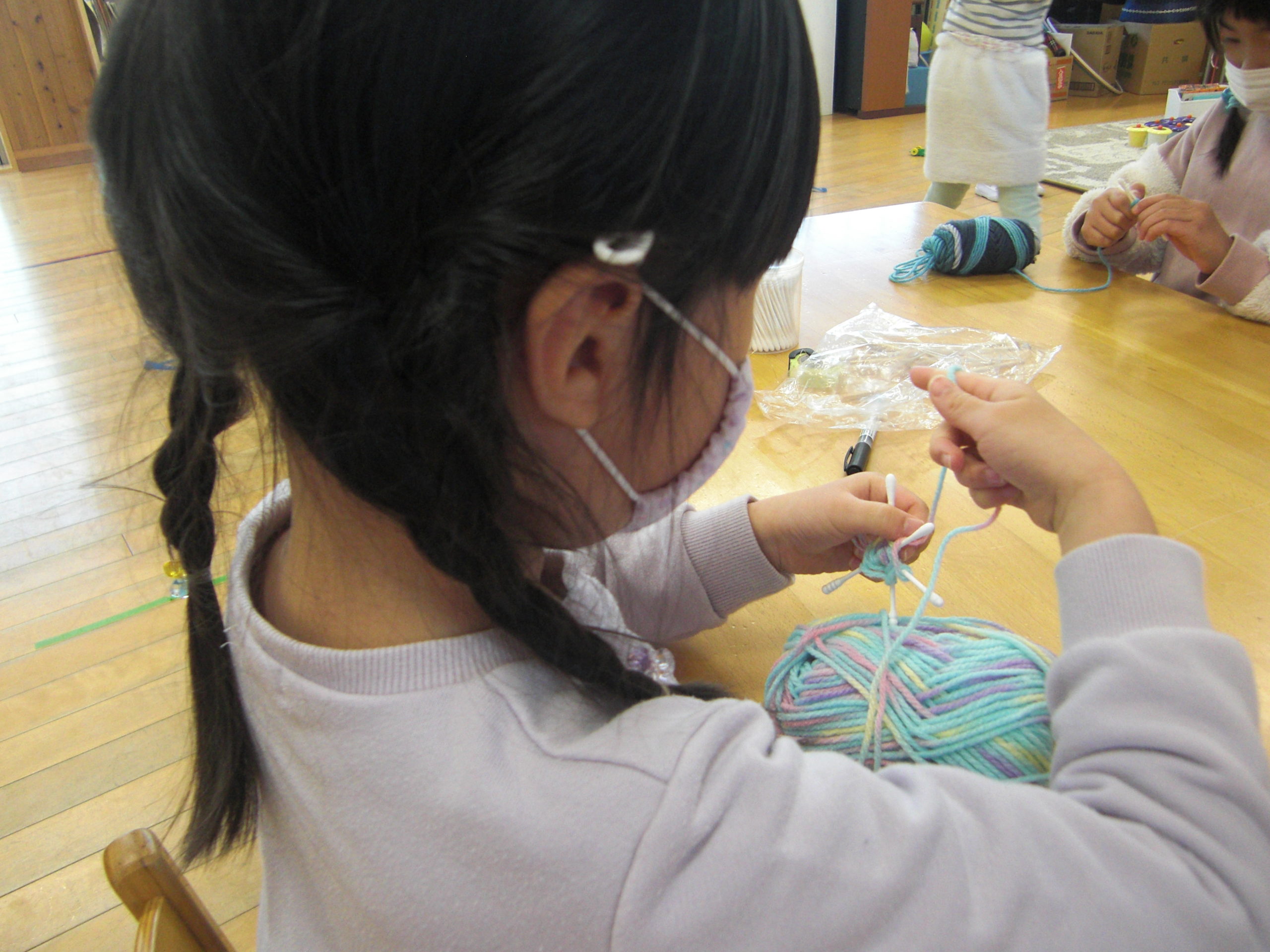 ぱんだぐみでは、毛糸を綿棒や割り箸に巻いて、雪の結晶❄を表現しました⛄