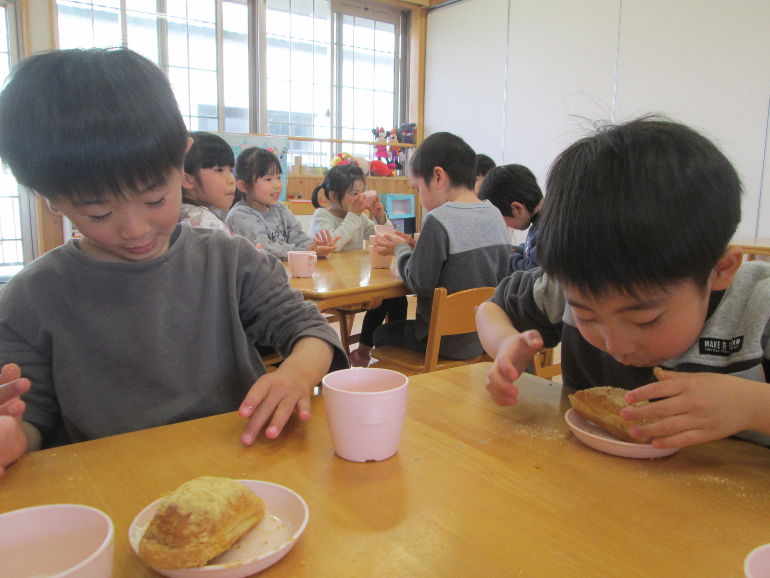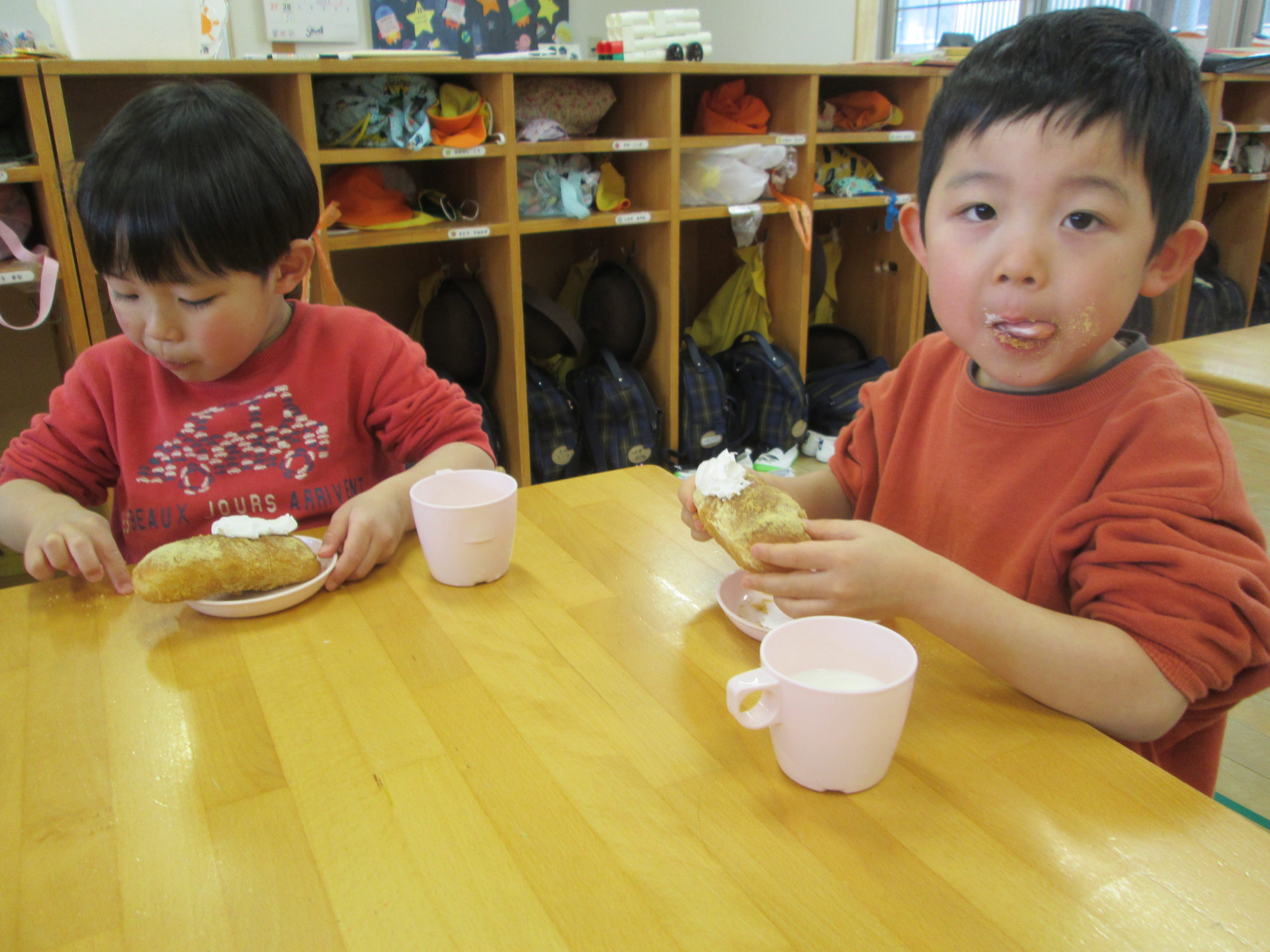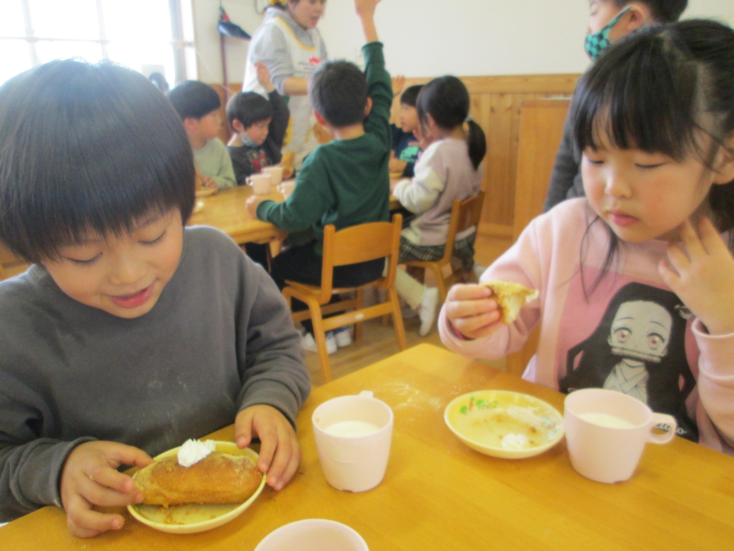 みんなお楽しみのケーキはきなこ揚げパンとホイップクリームでした!