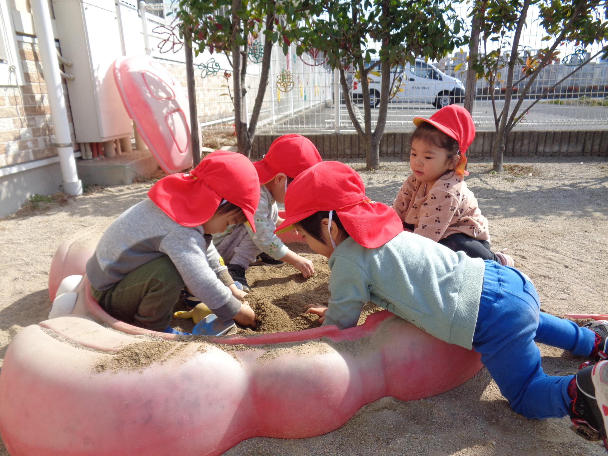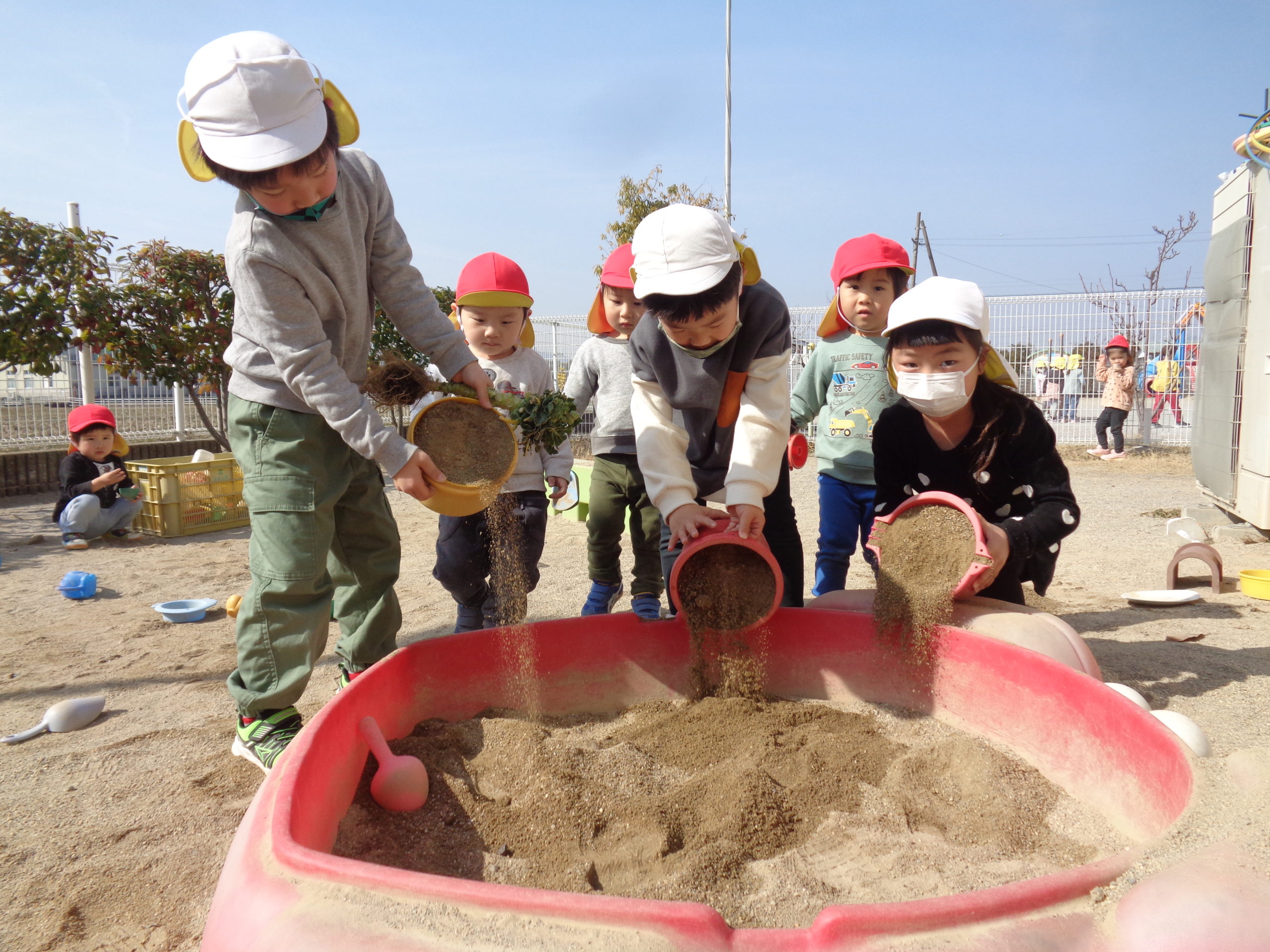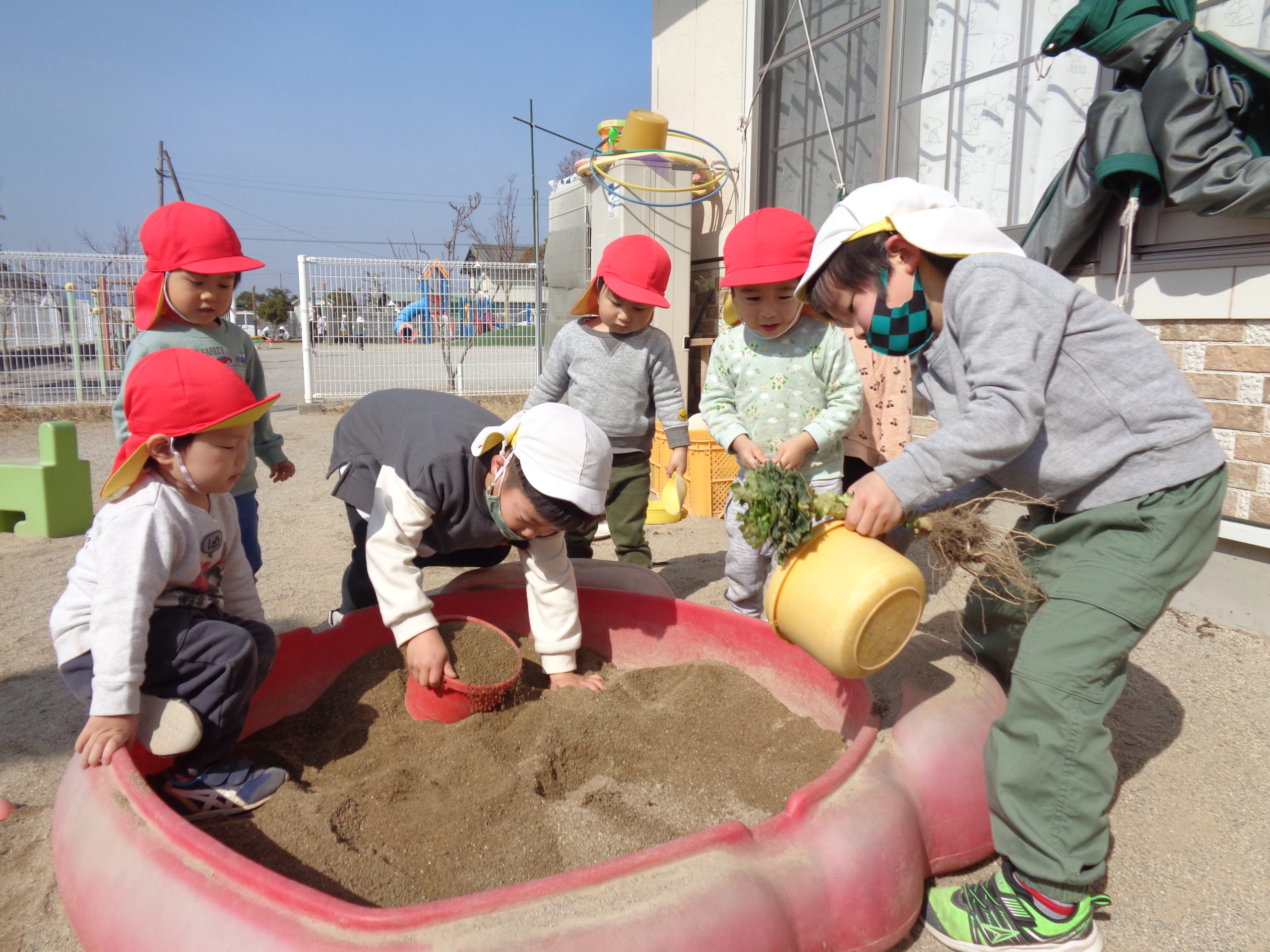 乳児園庭で砂遊びを楽しんでいたひよこ組ですが…
