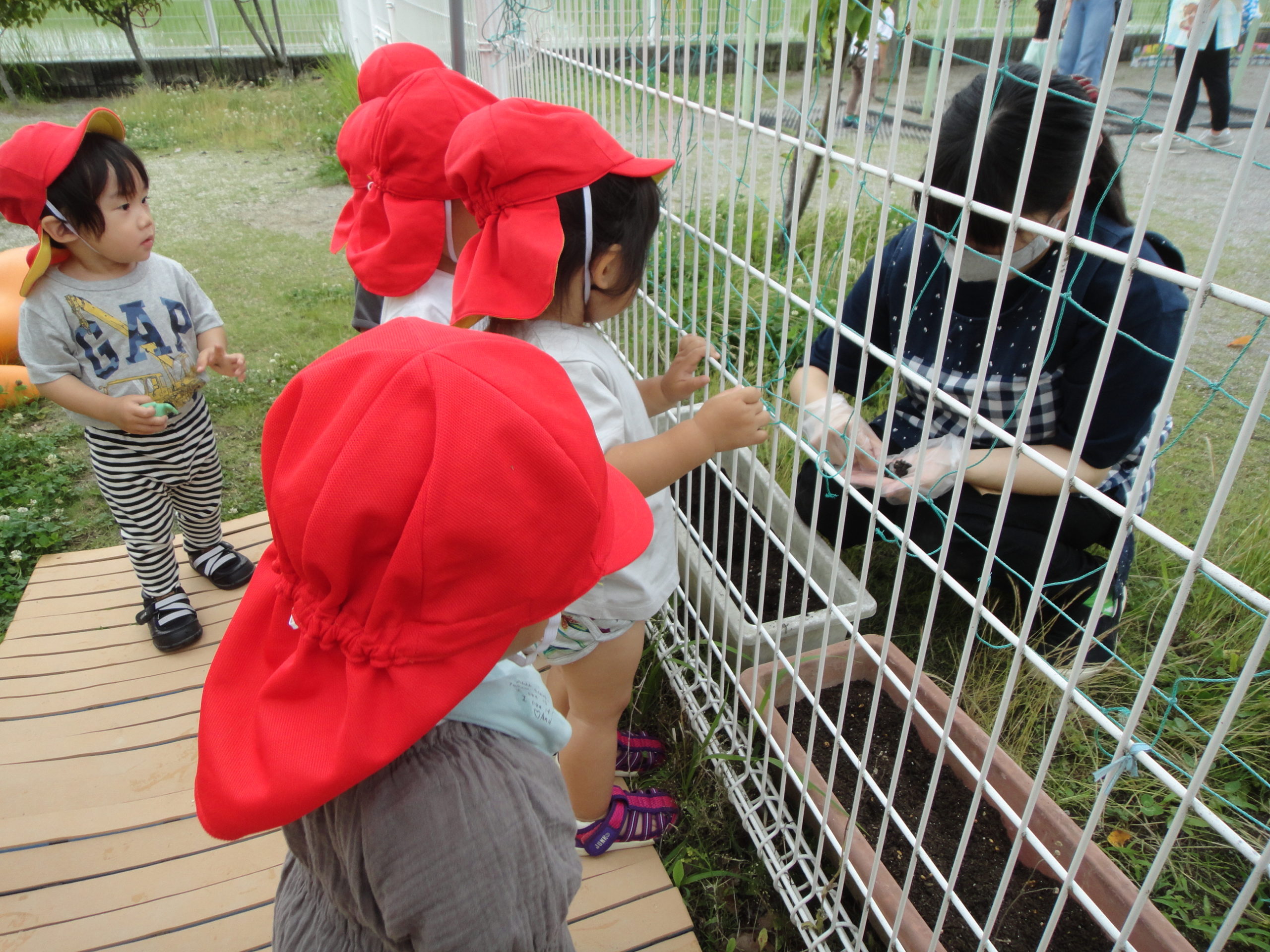 ひよこぐみ🐣 朝顔、植えたよ!! 2022.06.24 6月23日(木) ひよこぐみでは、朝顔を植えました😉 みんな、「なんだ~!!なんだ~!!」と集まり、種🌱を植えるところを観察したましたよ🤭 水もあげて、「おおー!!」と喜んでました🎵 1歳児という年齢ではありますが、お花🌼の生長を一緒に楽しみたいと思います✨ < >