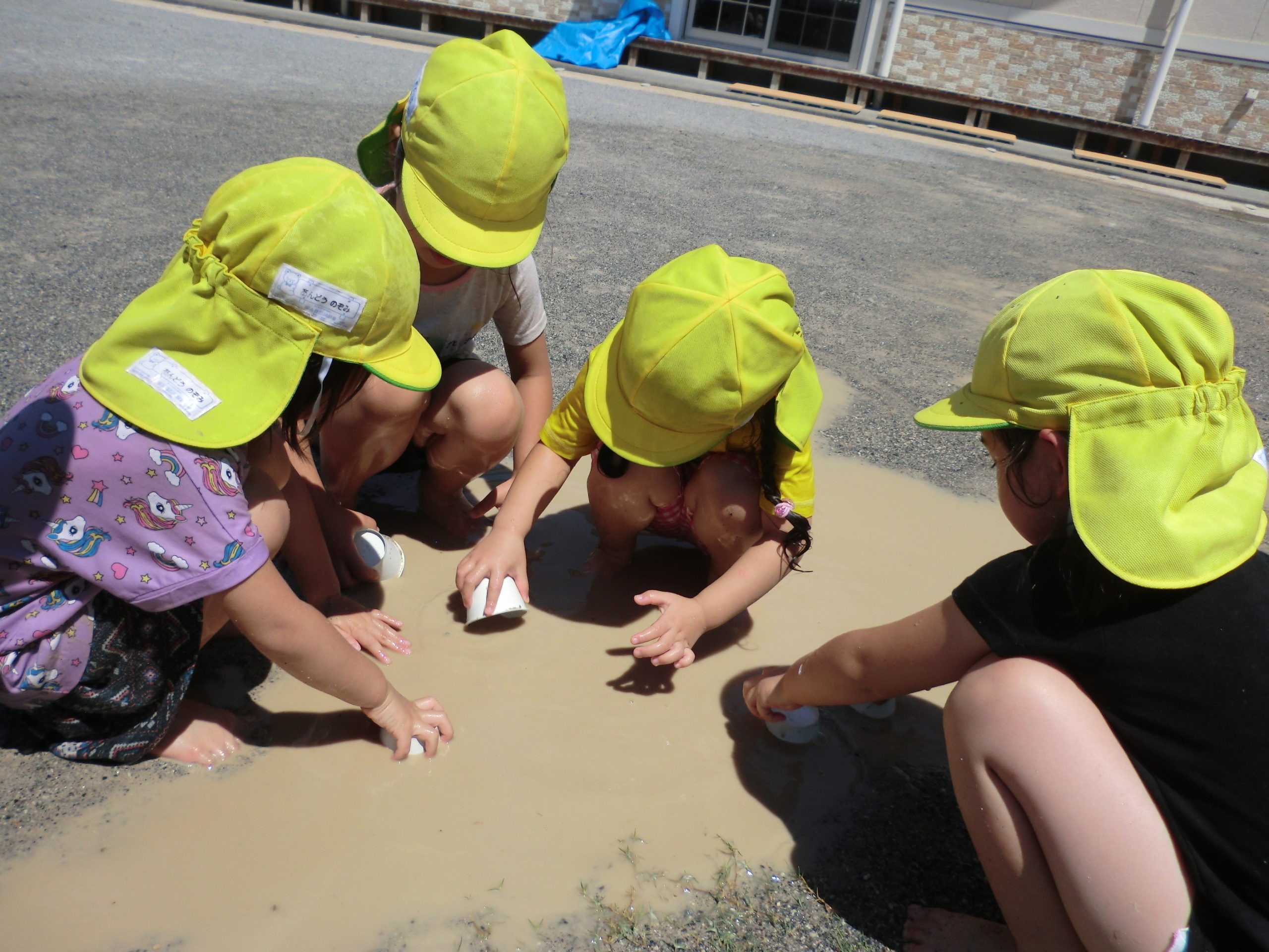 カップに泥をたくさん詰めて、満足そうににっこり☺