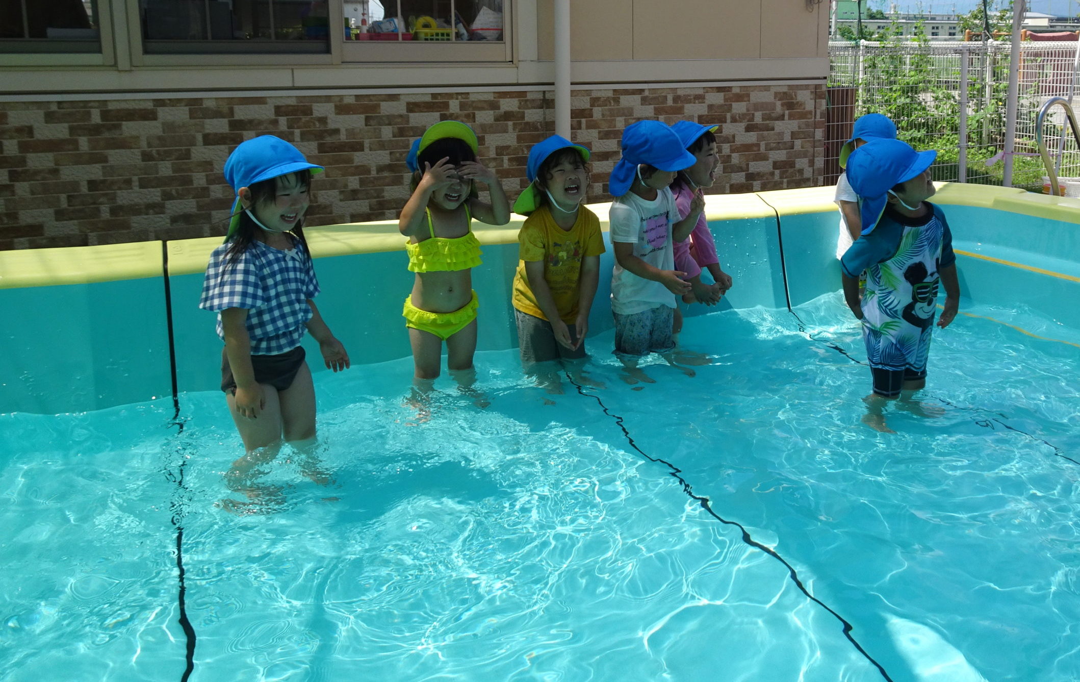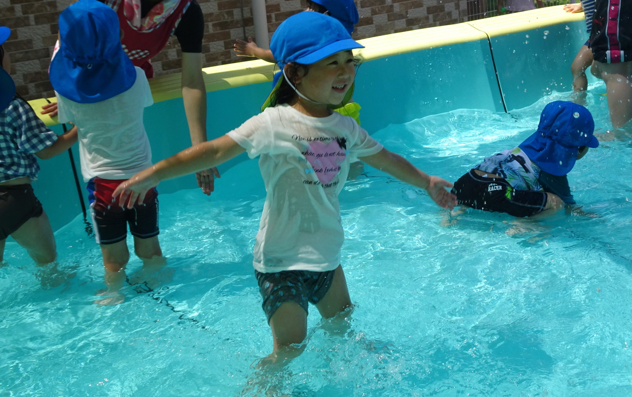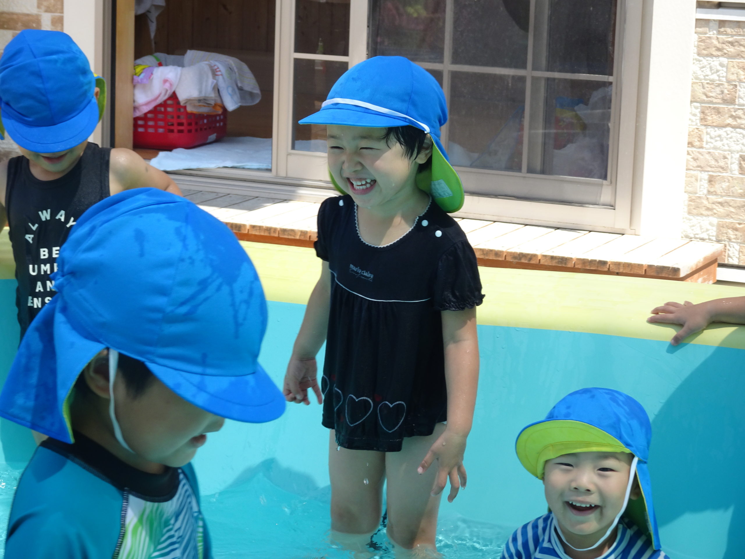 ぺんぎん組プール開き! 2022.07.06 雨天が続いていましたが、今日はいい天気になり、 ぺんぎん組の子たちも初めてプールに入ることが出来ました。 始めは少しお水冷たいな、お顔にお水つくの嫌だな…という子もいましたが、 気付けば全身で水の心地良さを感じるくらい思いきり遊んでしました。 「もう交代の時間になったからあがろうか」と声を掛けても、 中々上がってこず… それくらい楽しかったようです😊 < >