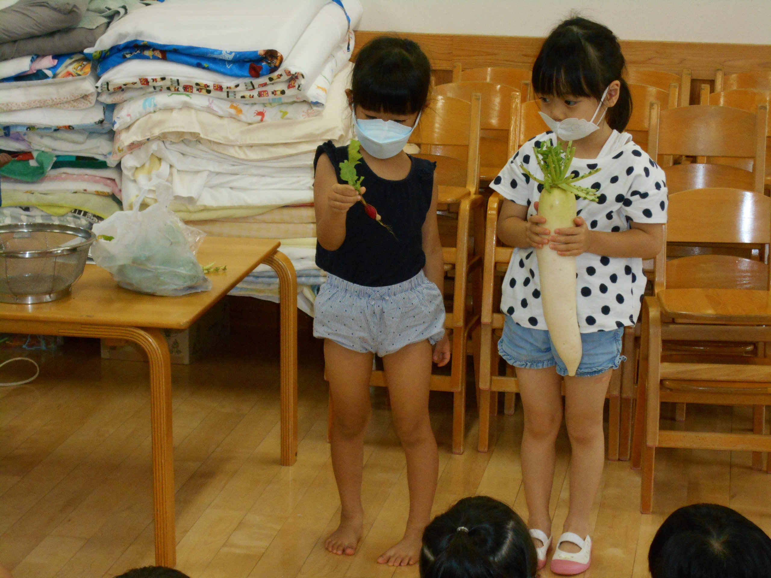 いつも食べる大根と比べ、二十日大根は「ちょっとからい!」という子もいれば、「からくないよ、おいしい」