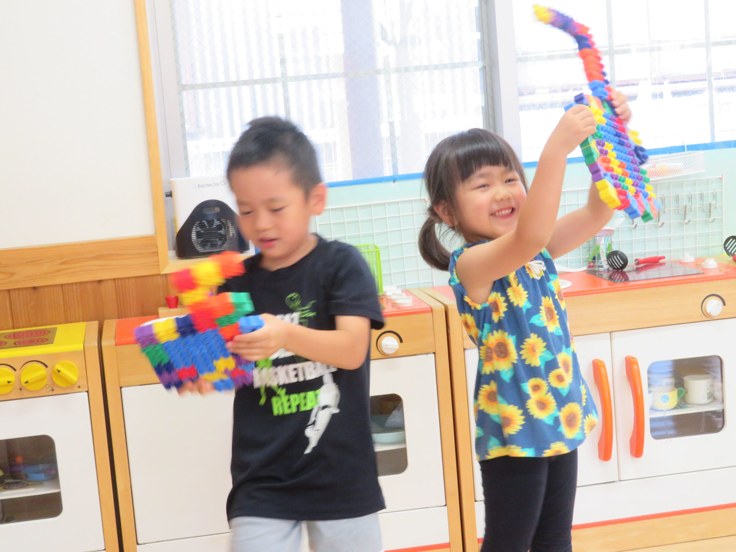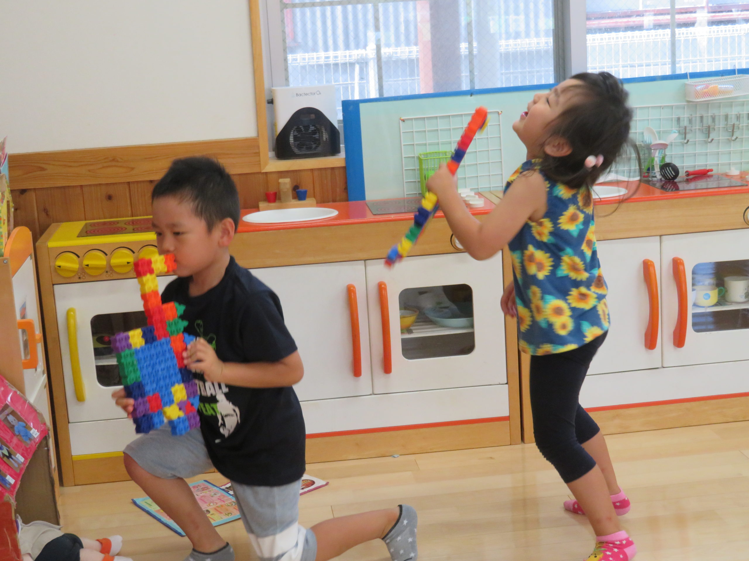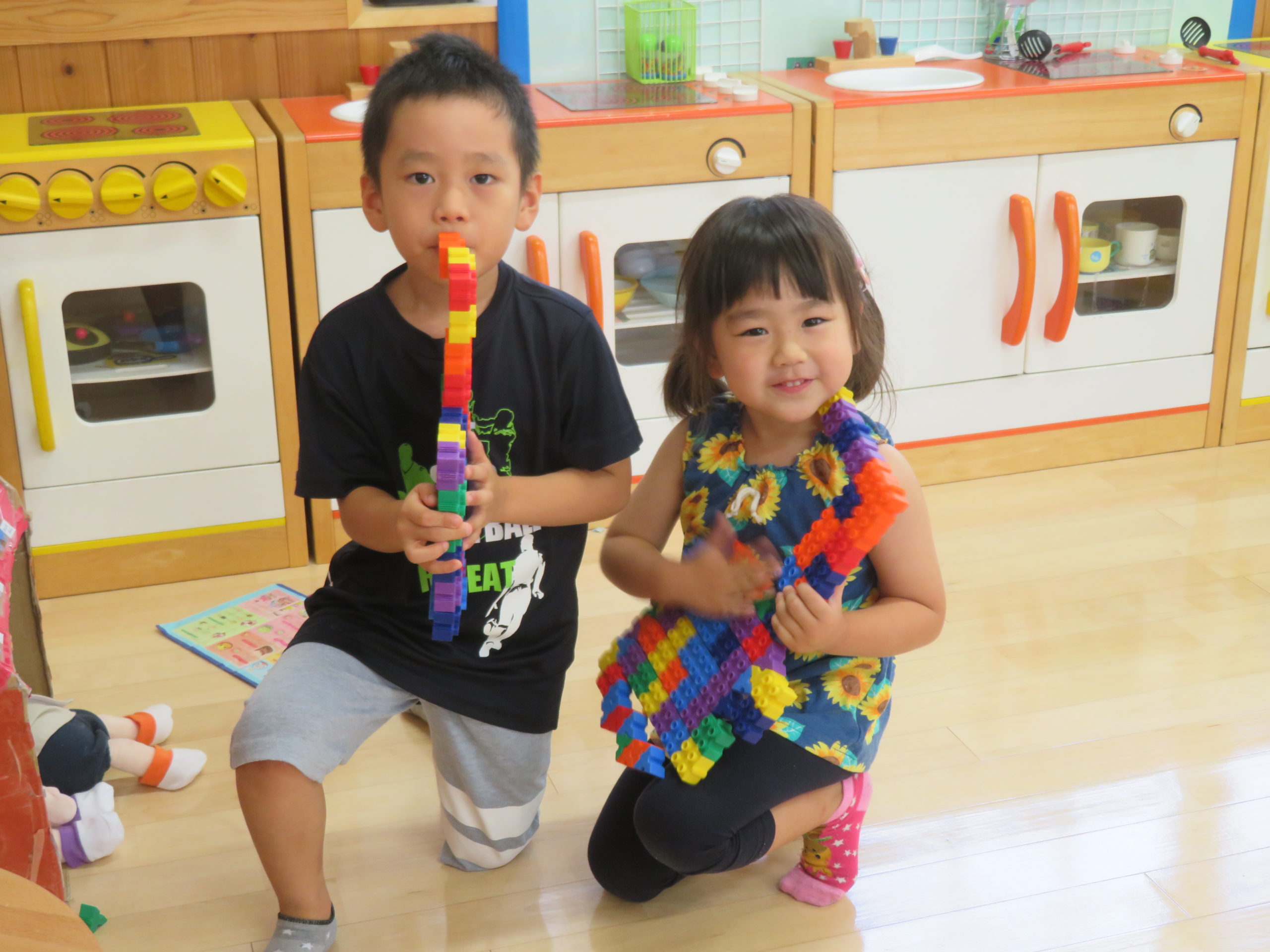 🐼バンドメンバー募集中🎶 2022.07.25 ぱんだ組をのぞくと「みてみてー、これ楽器だよ」 「こっちは、ギター🎸(写真左)、こっちはらっぱ🎺(右)」と見せてくれました。 作るだけでなく、演奏も🎶 立膝で、さまになってますよね~☆ パフォーマンスも見せてくれましたよ✨ 笑顔もキラッキラです♡ 只今、バンドメンバー募集中!!未経験者も大歓迎です! 興味のある方は、ぜひ、ぱんだ組へ。 お待ちしてま~すm(_ _)m < >