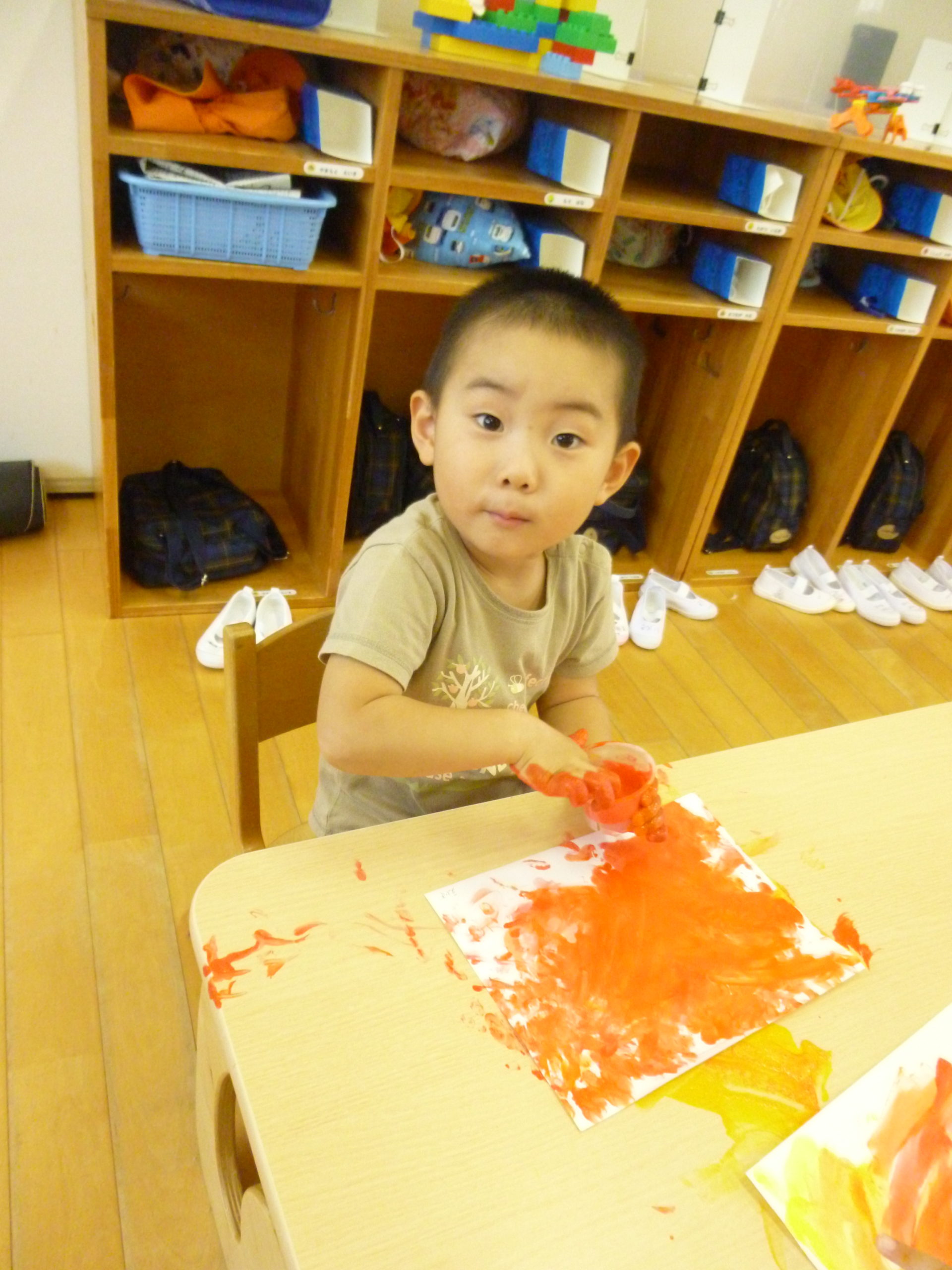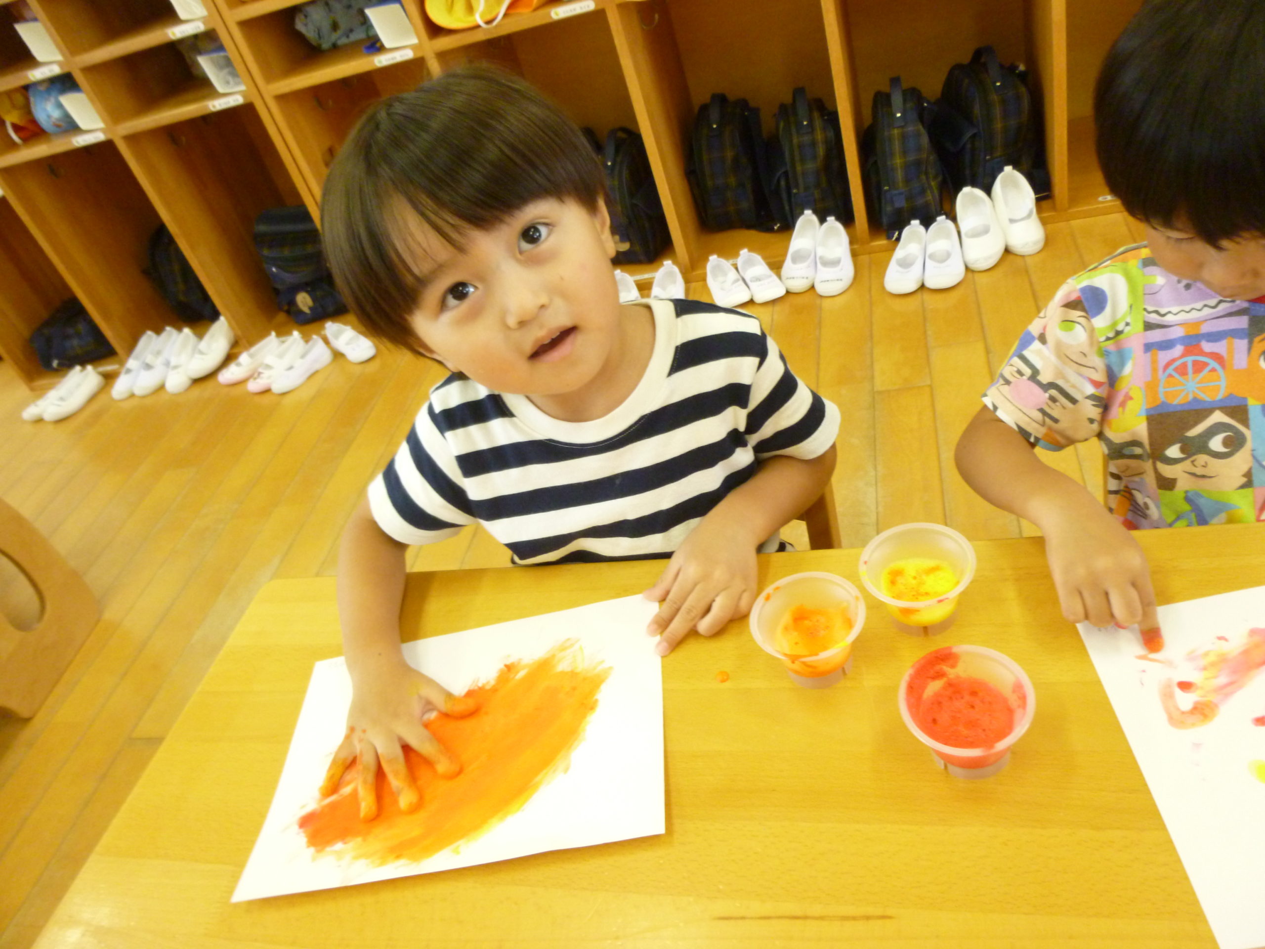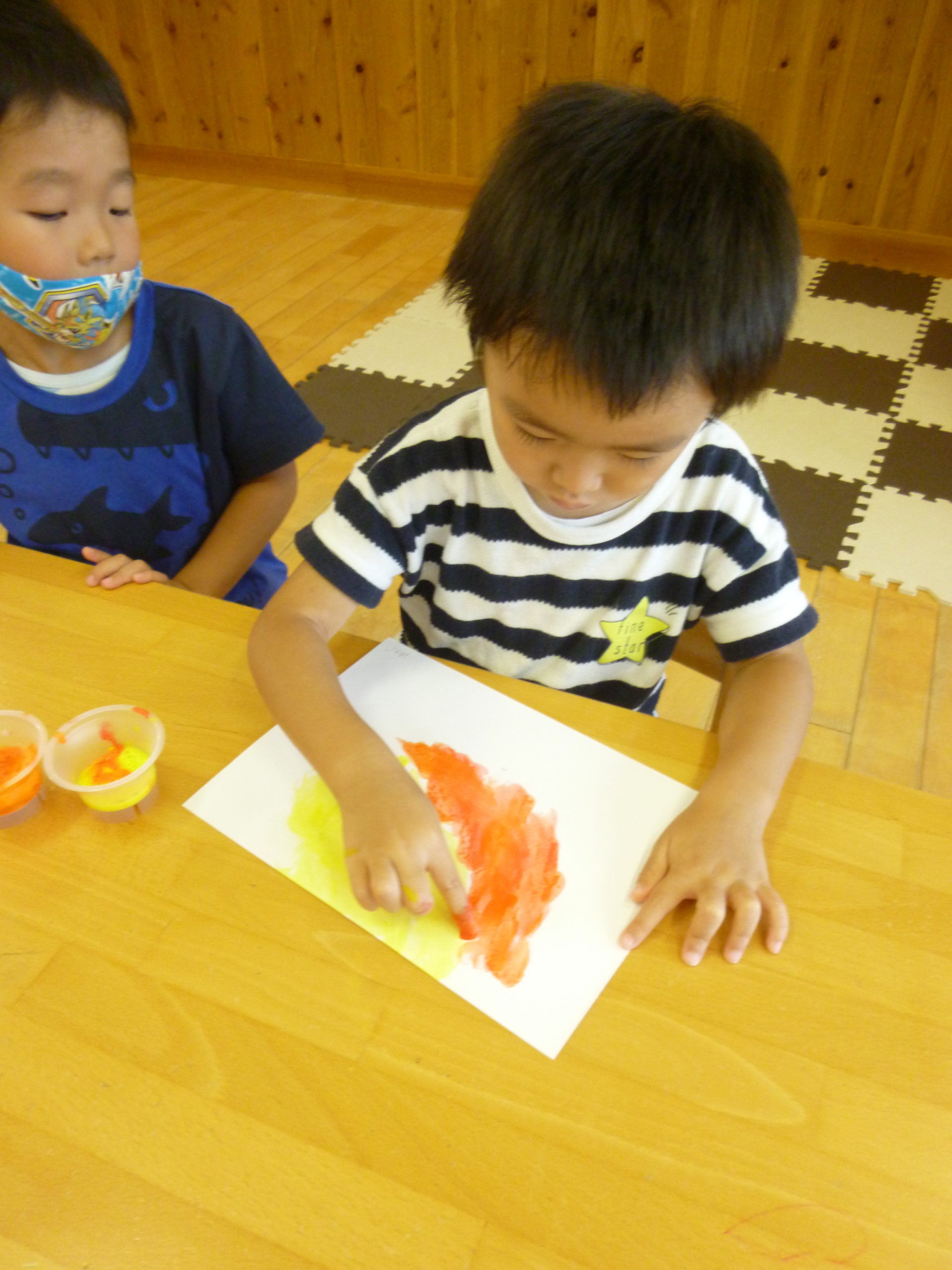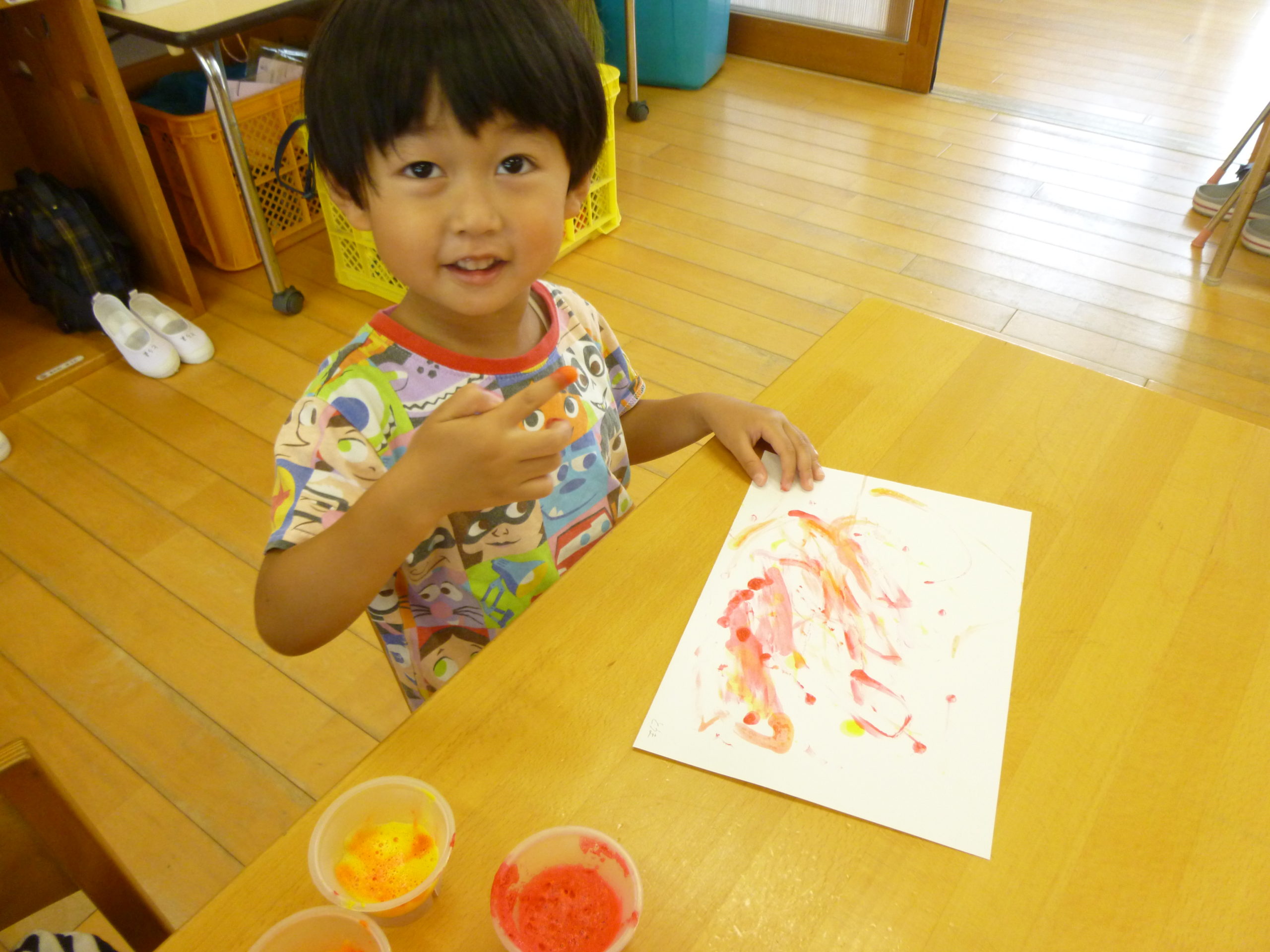 黄色・オレンジ色・赤色の絵の具に泡を入れて、感触を楽しみながらフィンガーペインティングをしました😊