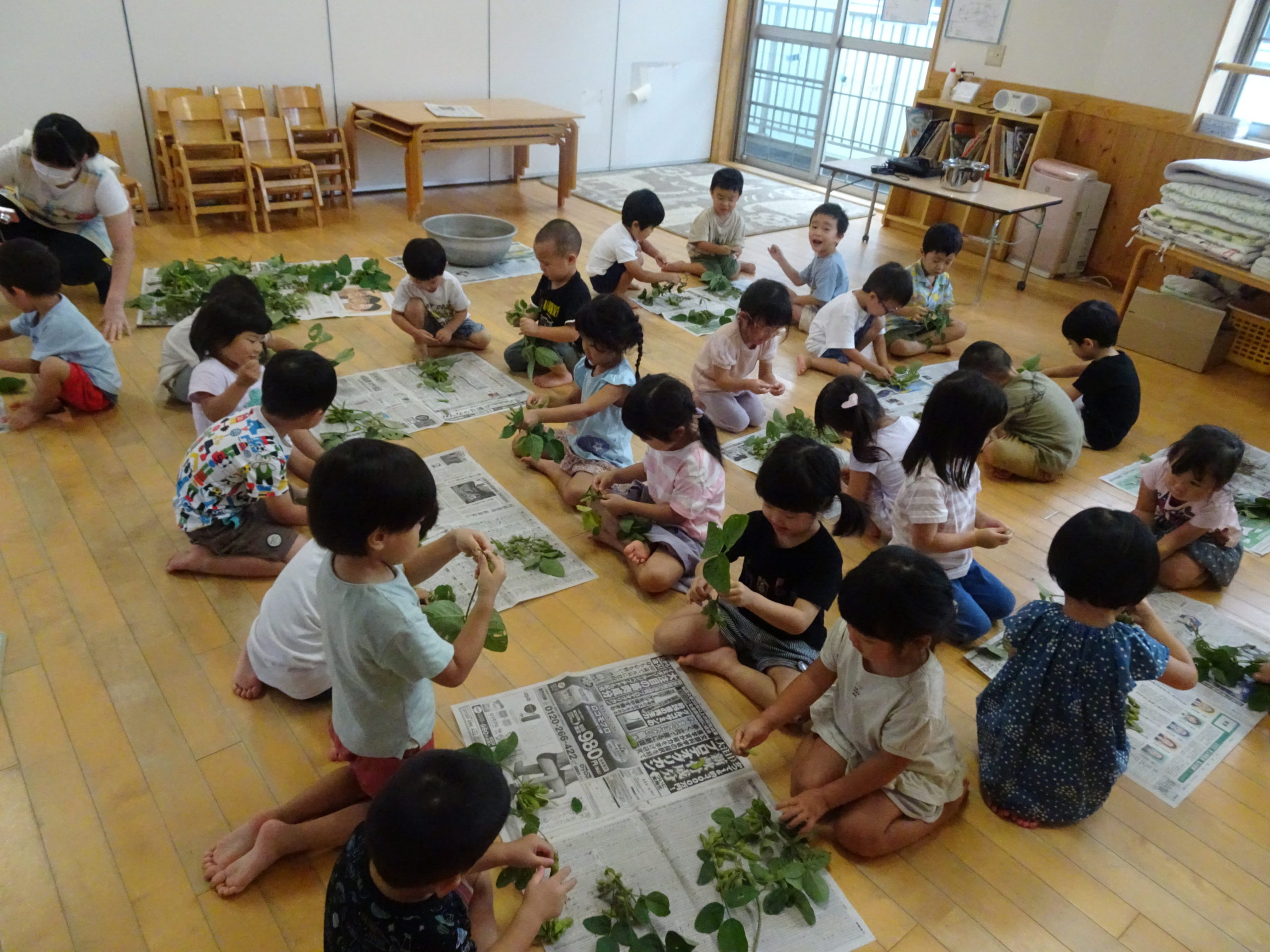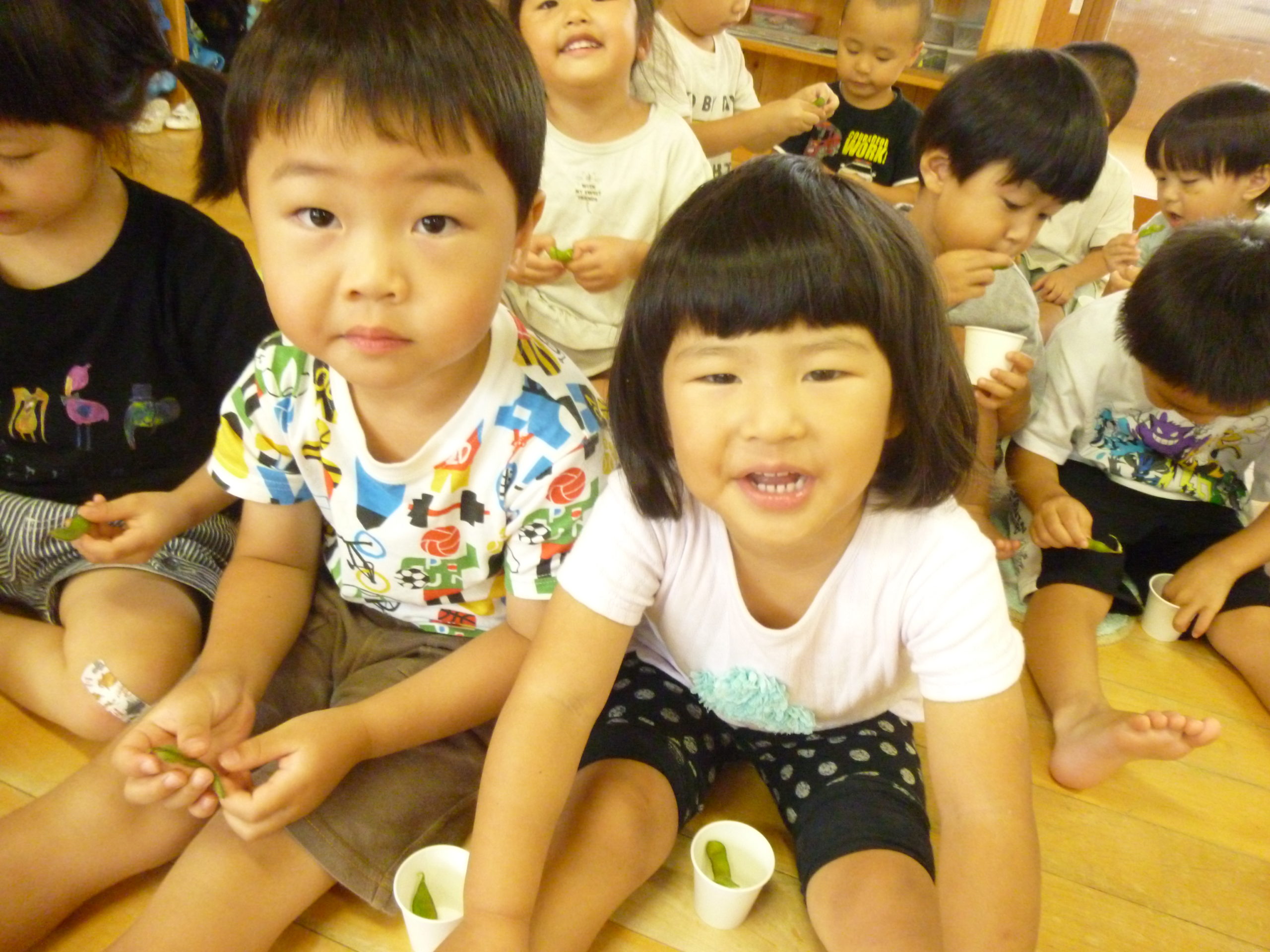 枝豆を保育士が茹でていると、「まだかなあ?」「もうすぐだよ!」とソワソワしている様子・・・。