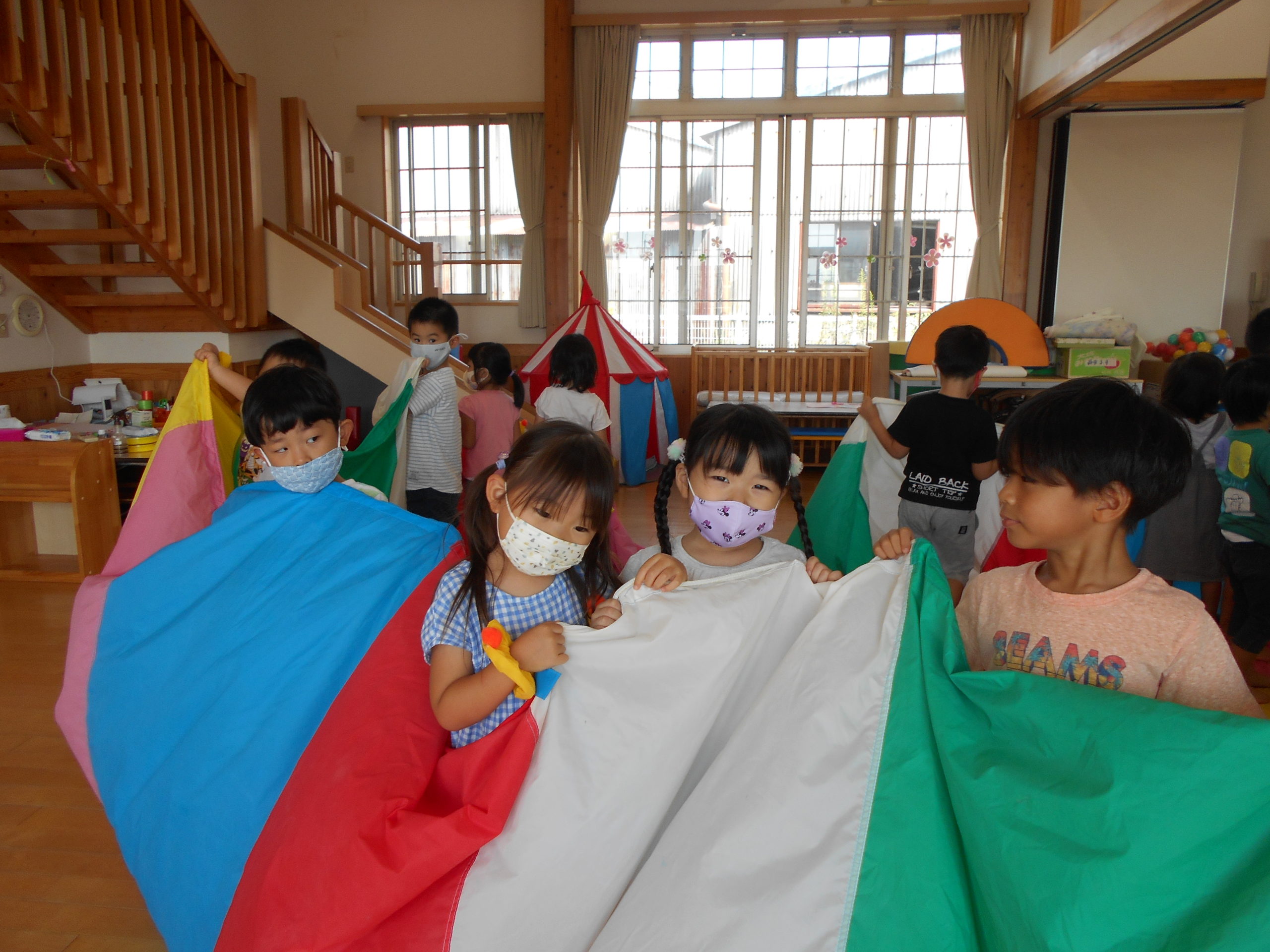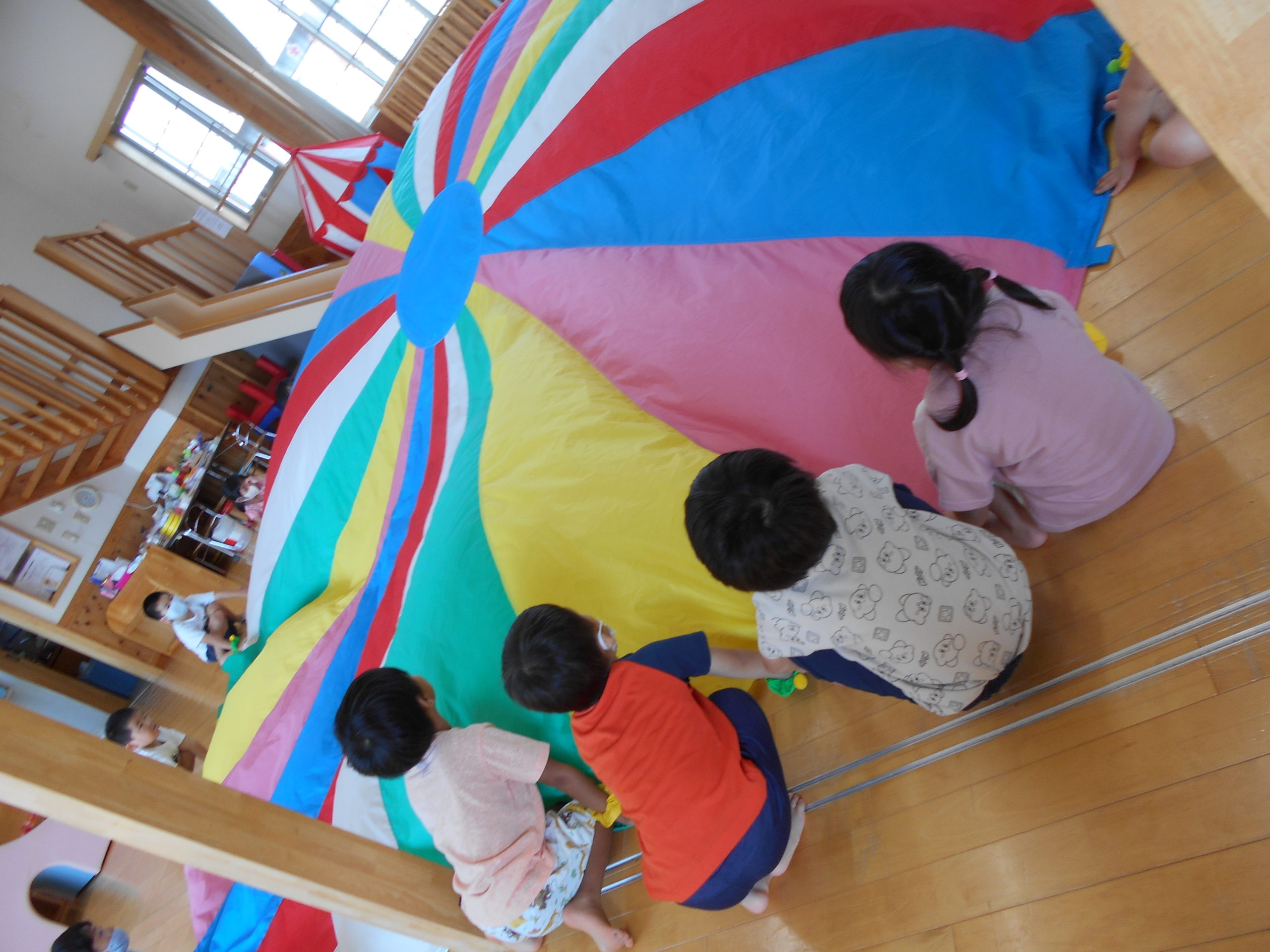 10月の運動会に向け、パラバルーンに挑戦しているぱんだ組の子どもたち!