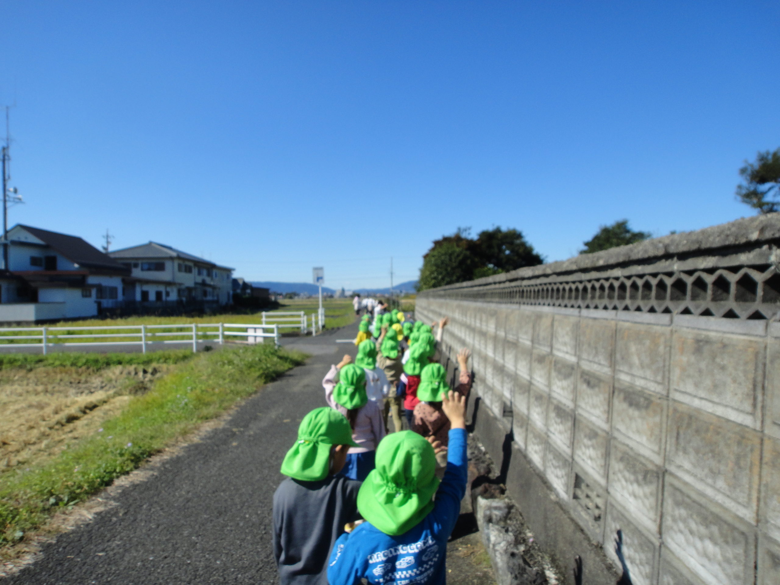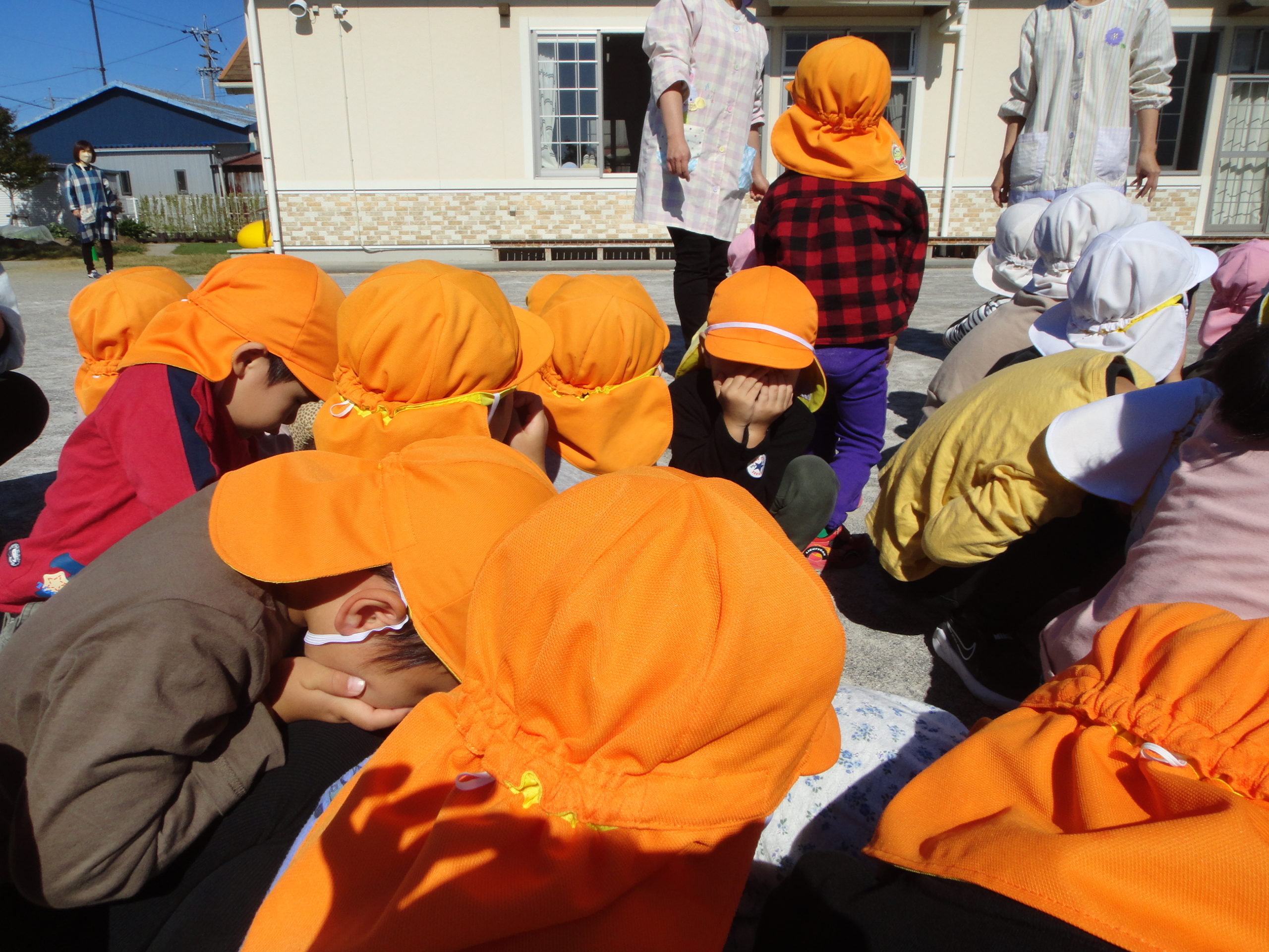 今回、大きい地震を想定しての訓練でしたので、安全確保のため、以上児さんは、農道まで避難しました。