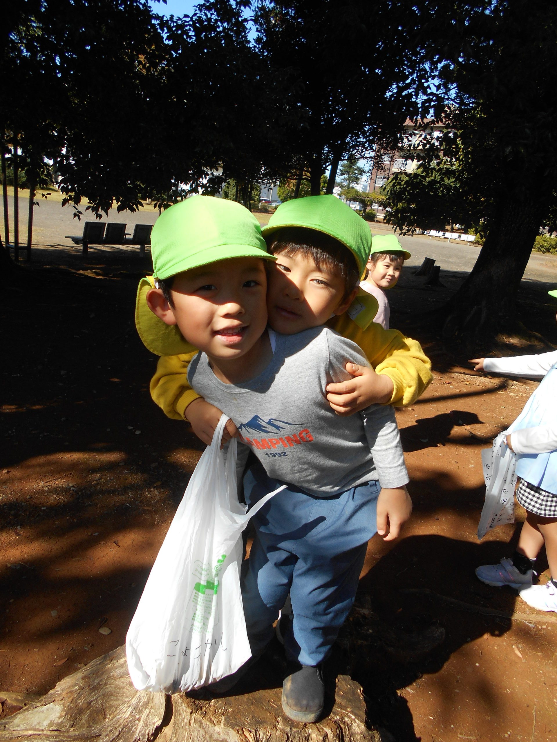 どんぐり拾いで結束を高め、にっこりポーズ😄