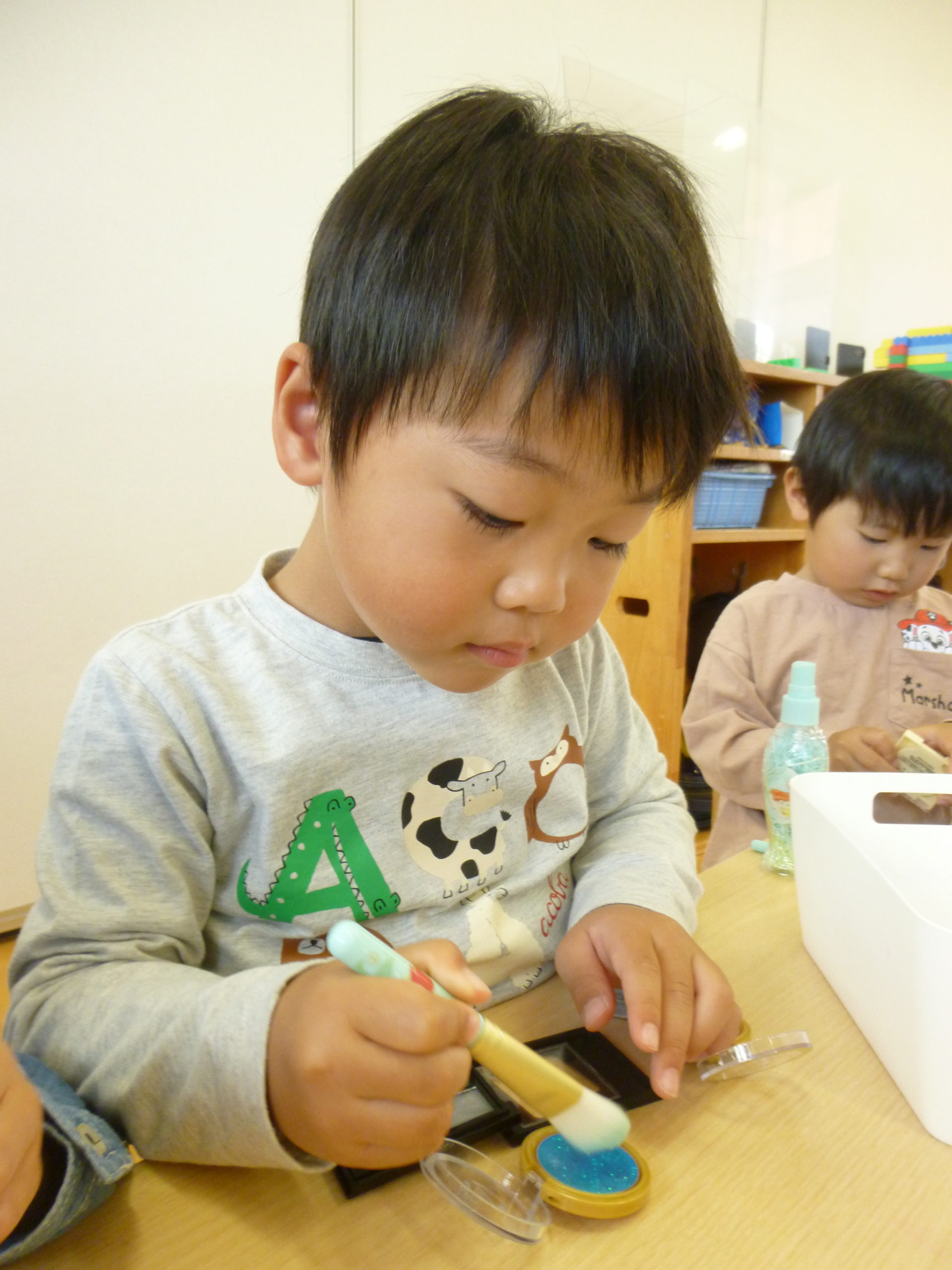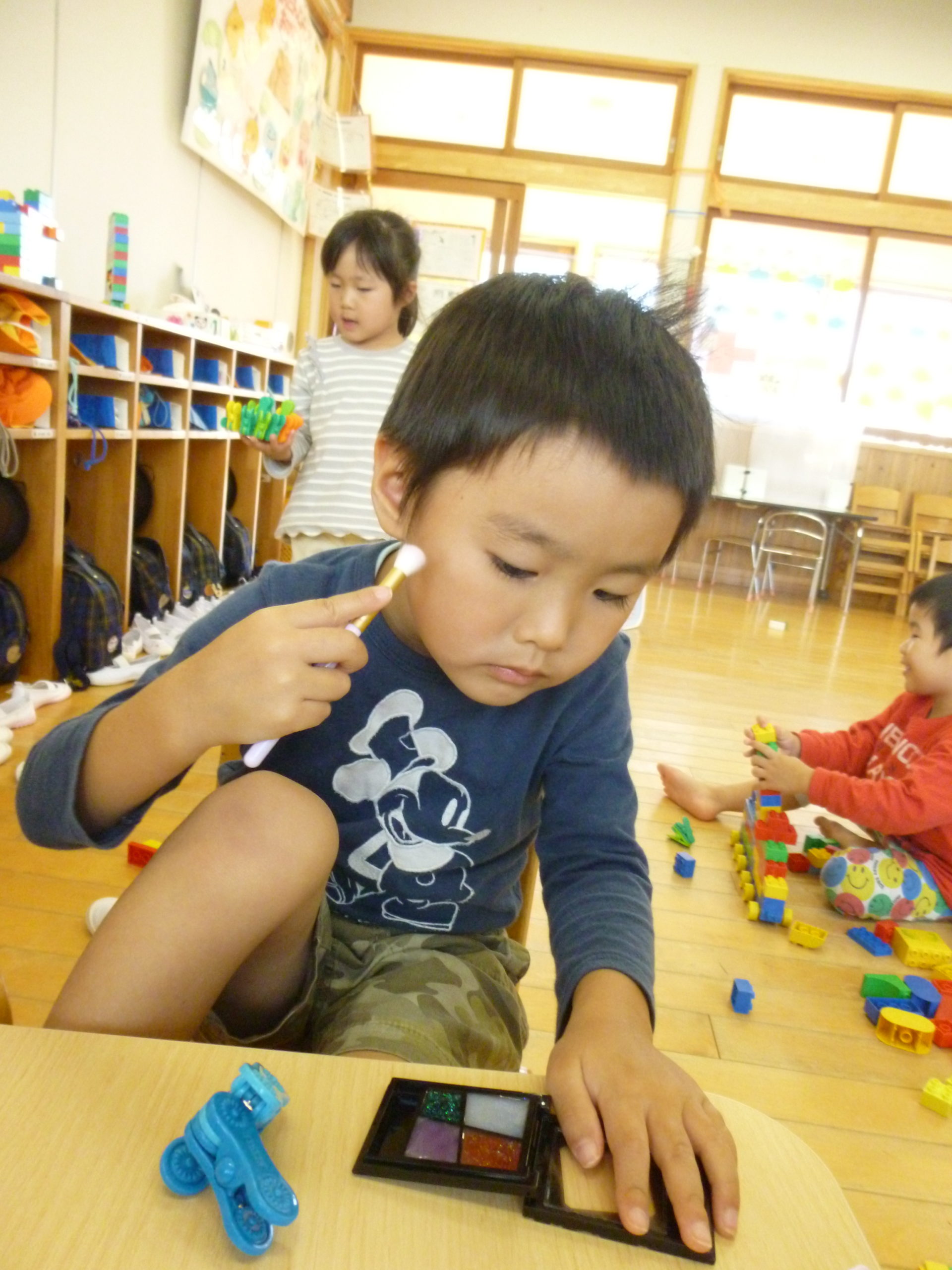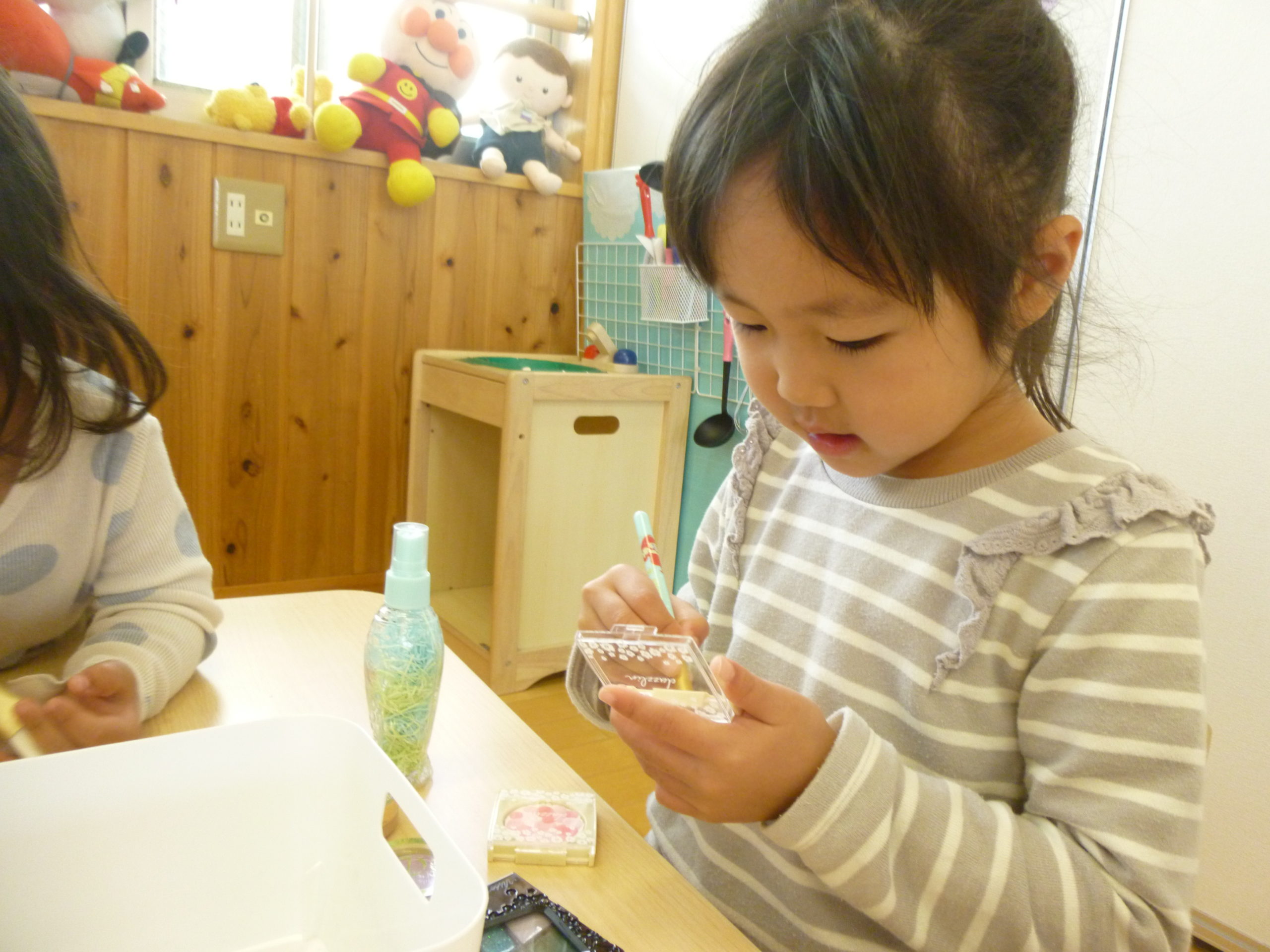 朝の延長で、ぱんだ組のお部屋にあるお化粧ごっこを楽しそうにする子どもたち。そこで、りす組のお部屋にも用意してみました✨