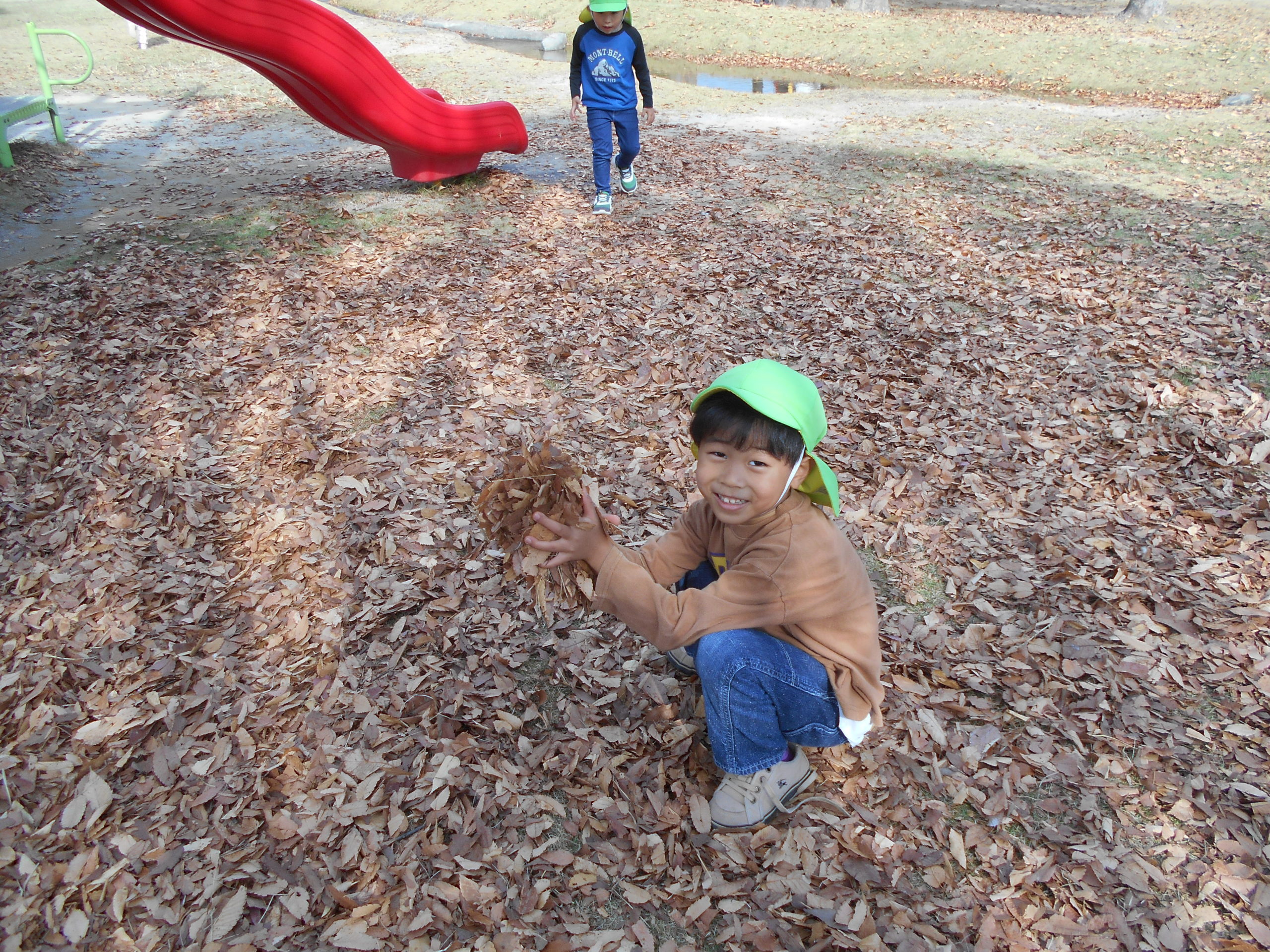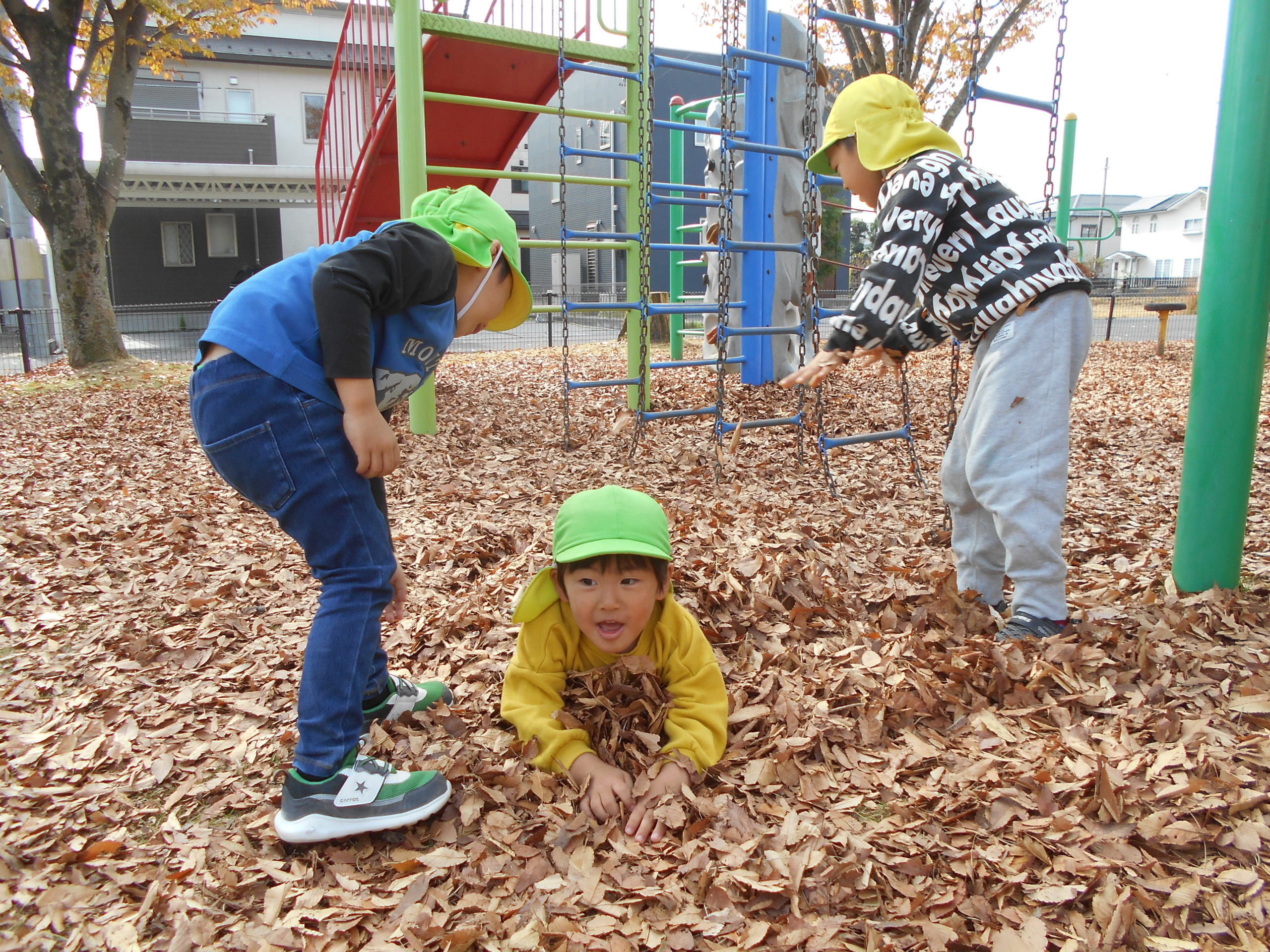 そんな女の子たちの様子を見ていた男の子たちも、落ち葉のお布団作りに挑戦!