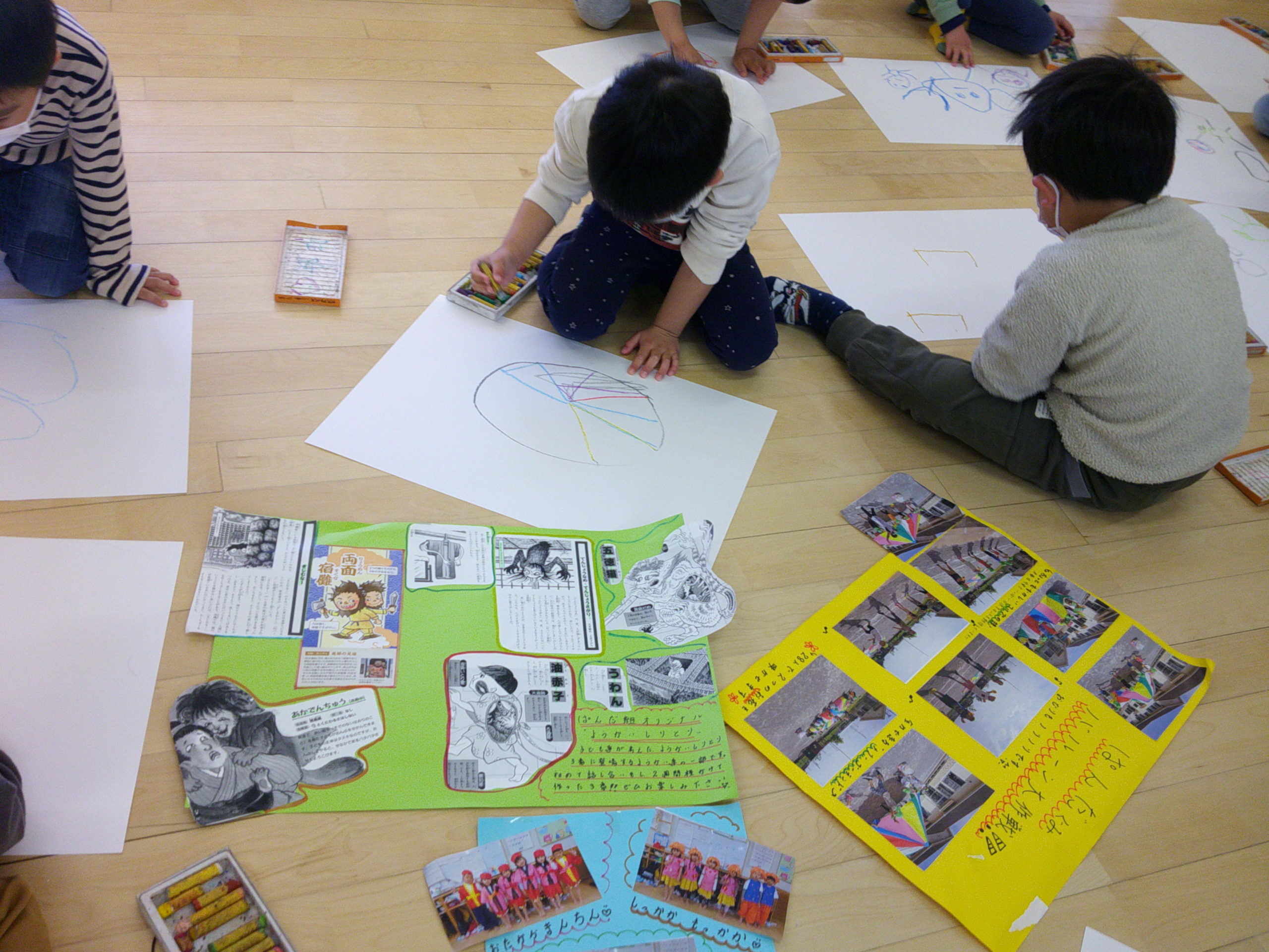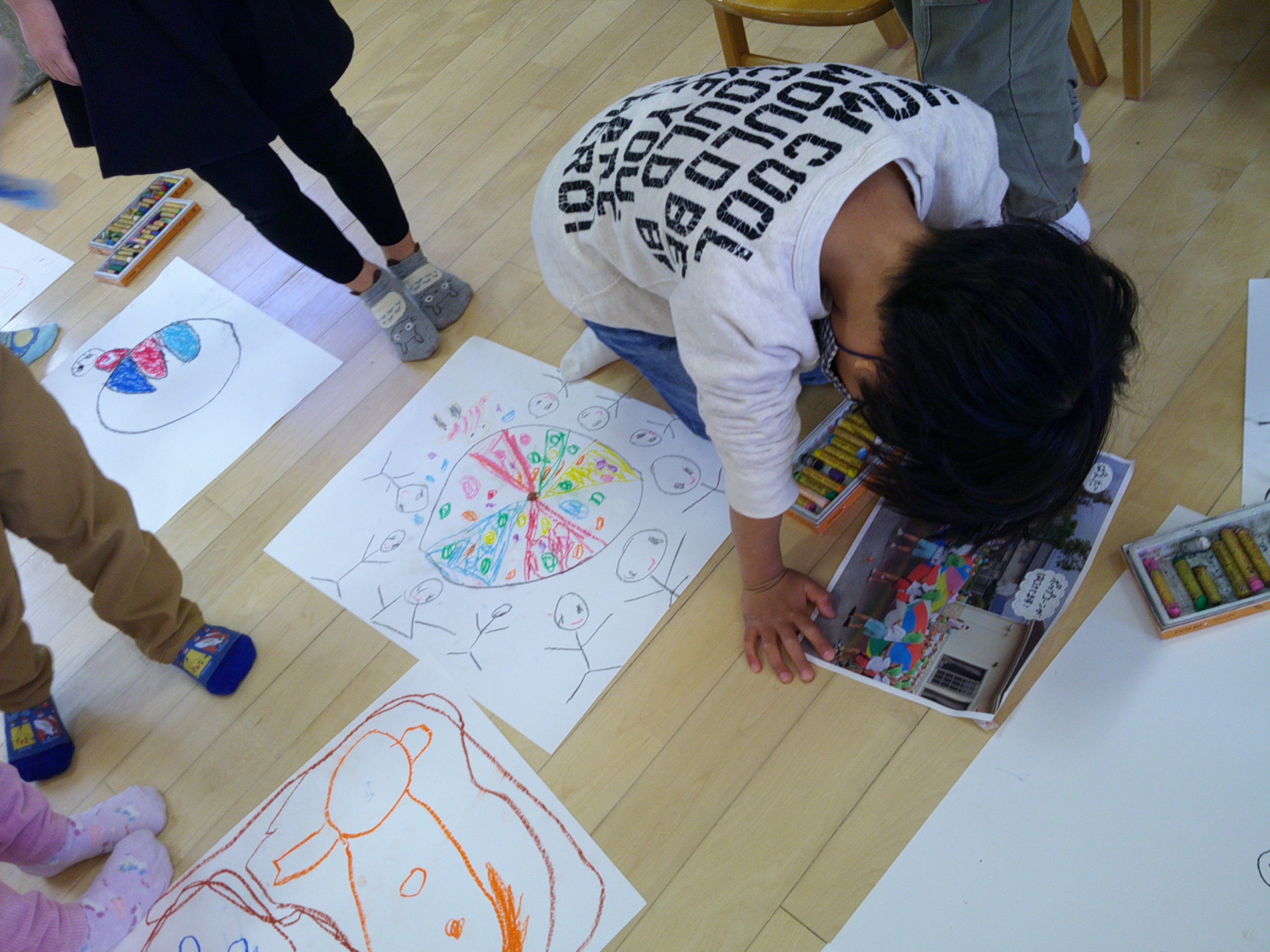 男の子たちも、楽しそうにお互いの絵を見あいっこしながら描き進めます。