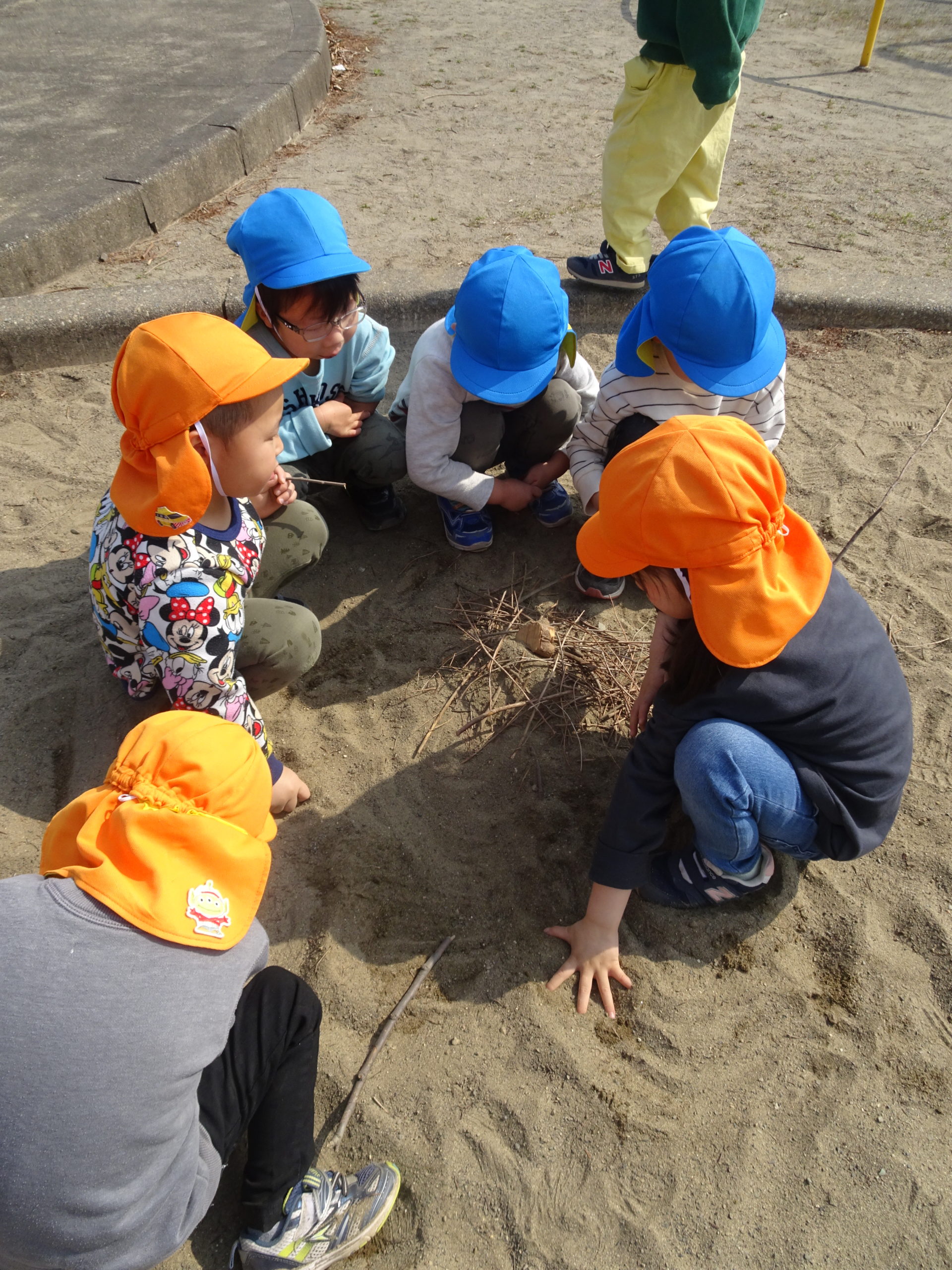 砂場ではみんなで木を集め、焚火をしていました。