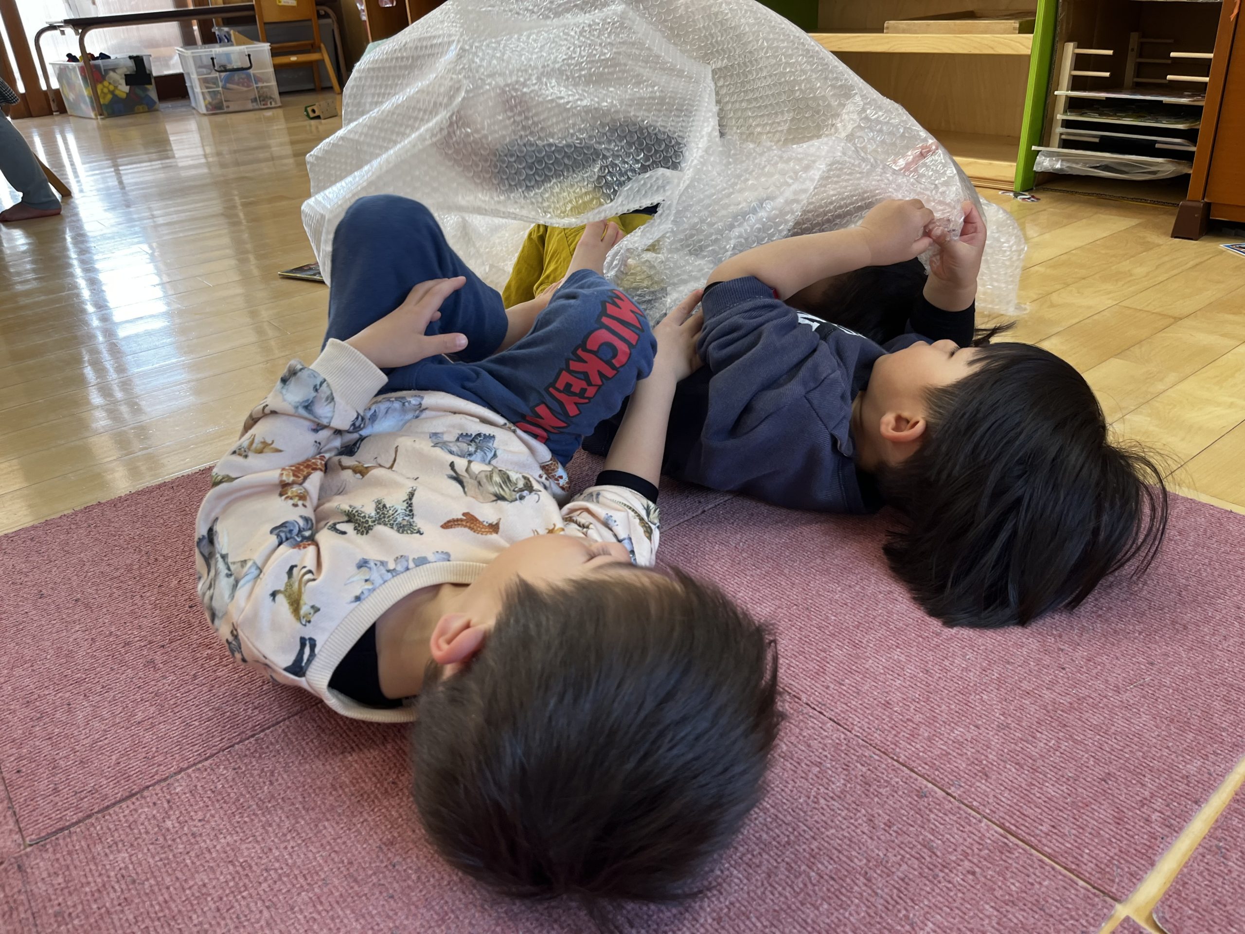 ほかにもぷちぷちの上から寝っ転がってみたり、シャカシャカ触って音を楽しんでみたり、特別大きいサイズだったのもあり大はしゃぎで遊びました💓