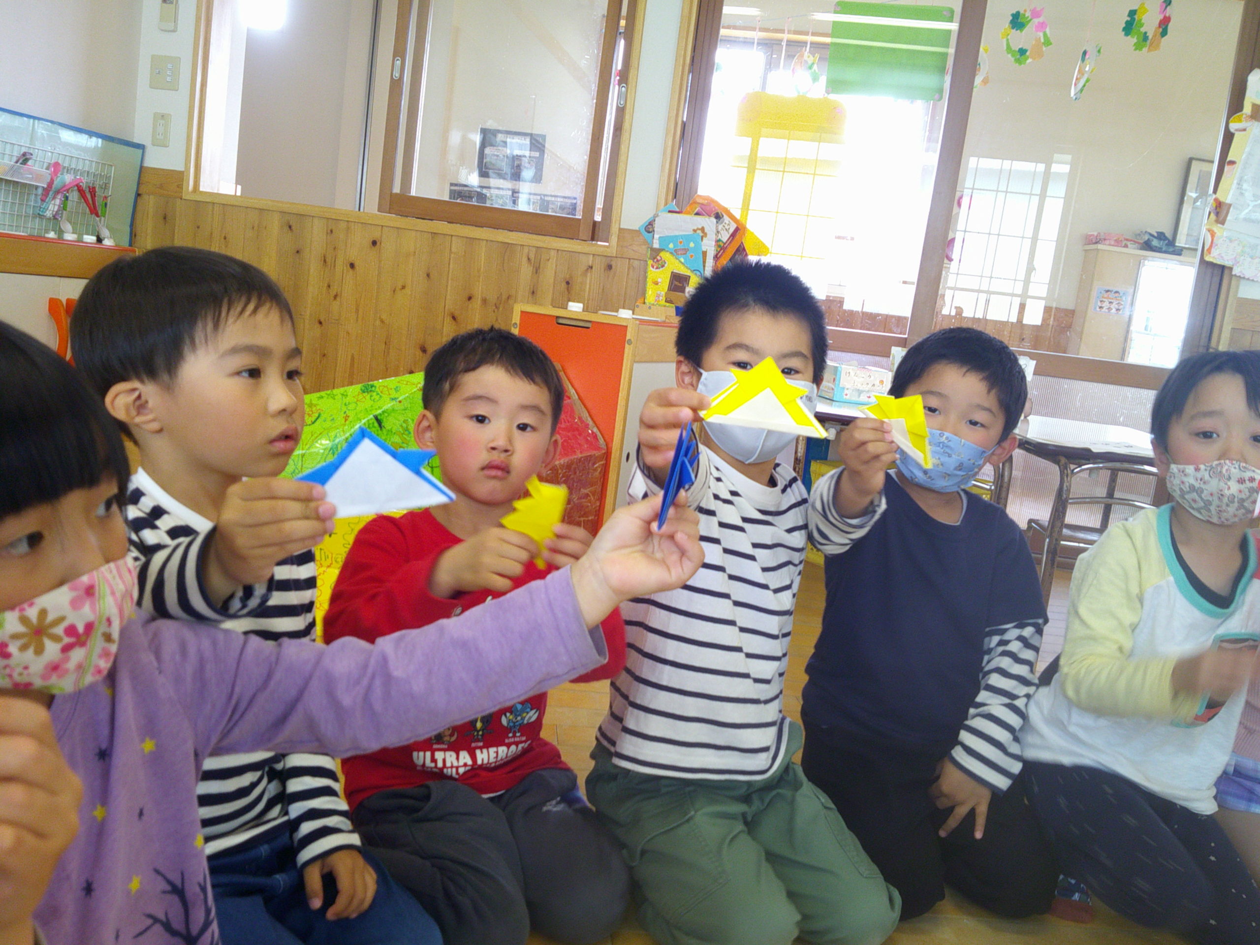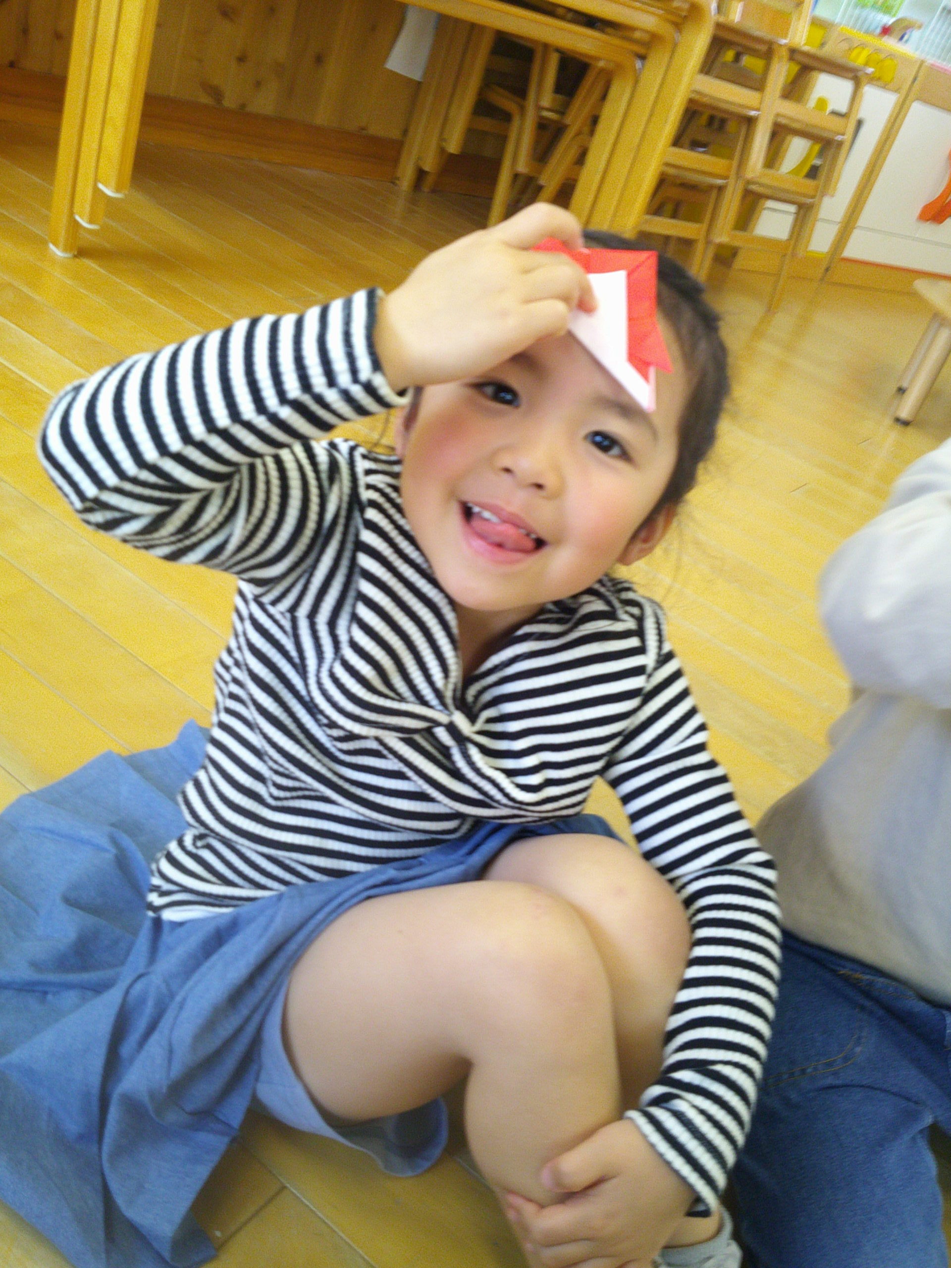 サークルタイムの最後には、みんなで「かぶと」の折り紙に取り組みましたよ❤