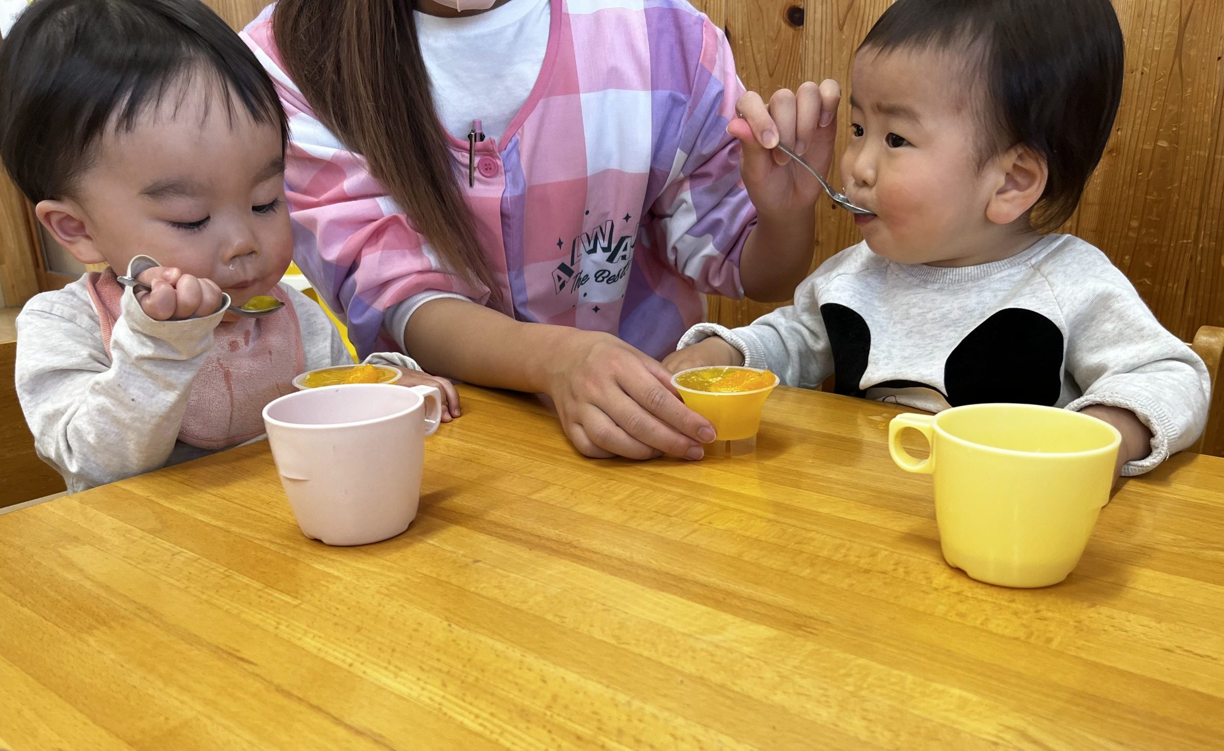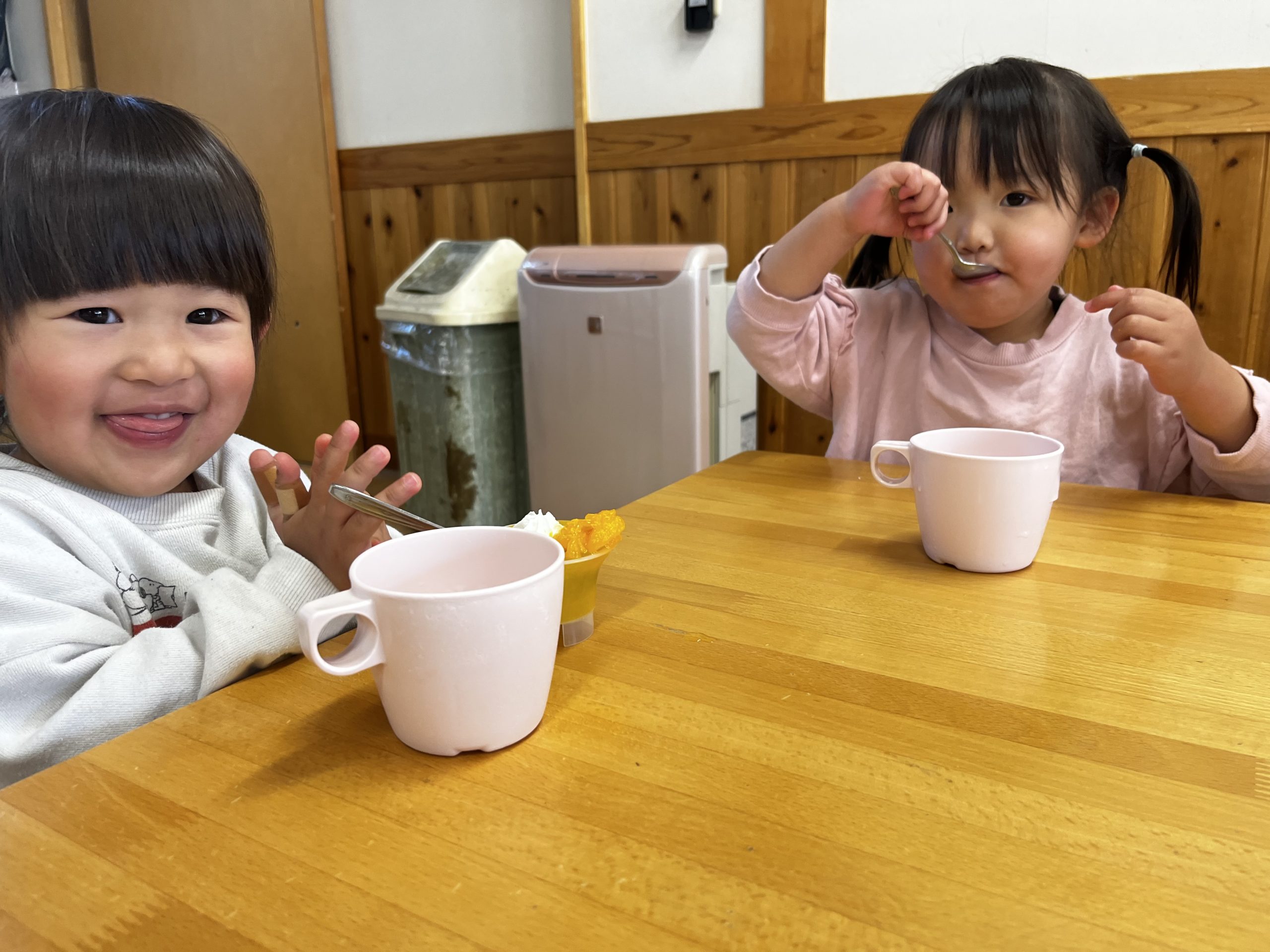 そしておやつの時間にはもう一つのおたのしみ、誕生会ケーキ✨(今回はみかんゼリーのみかんホイップのせ🍊)を食べましたよ😋