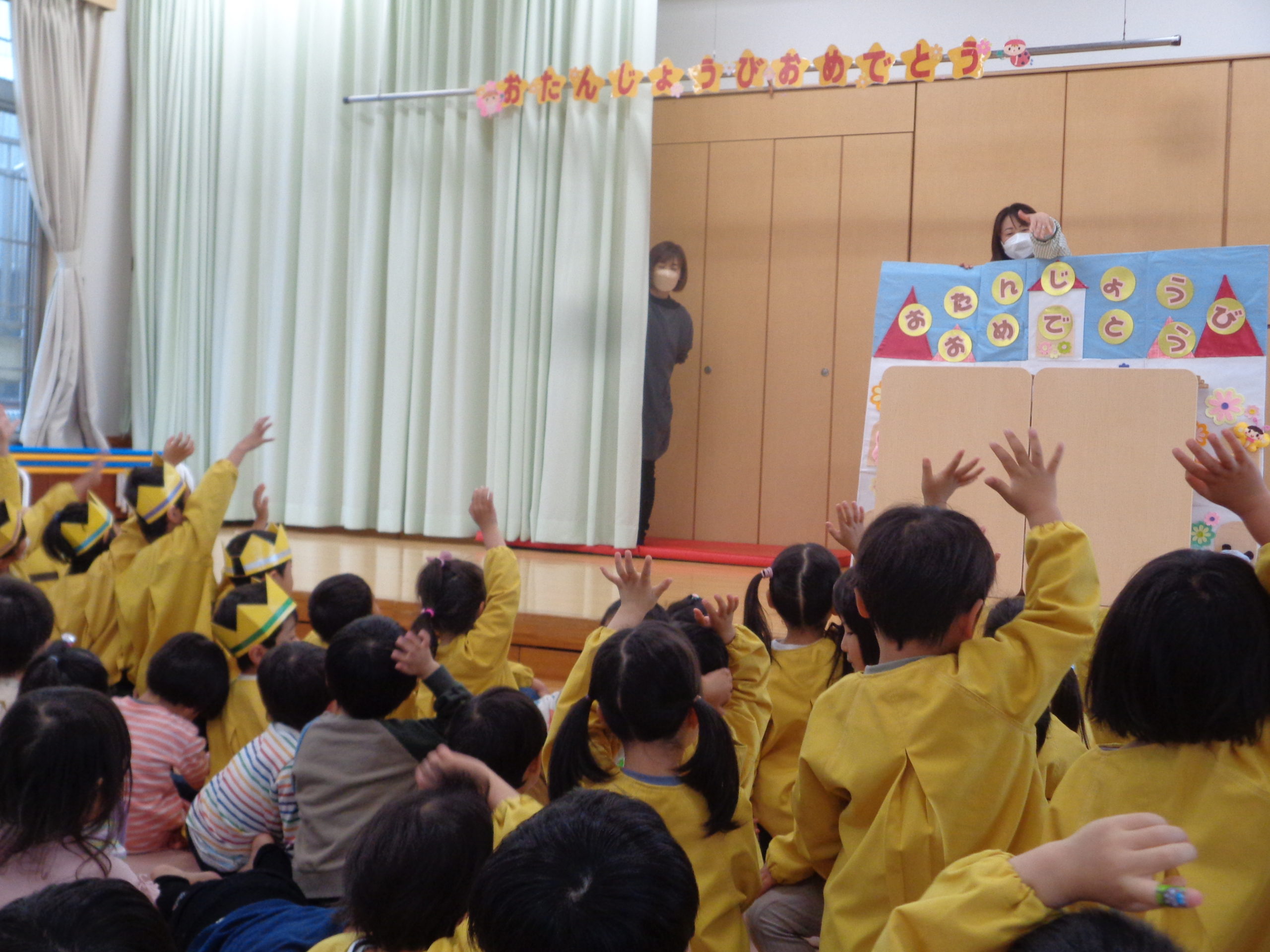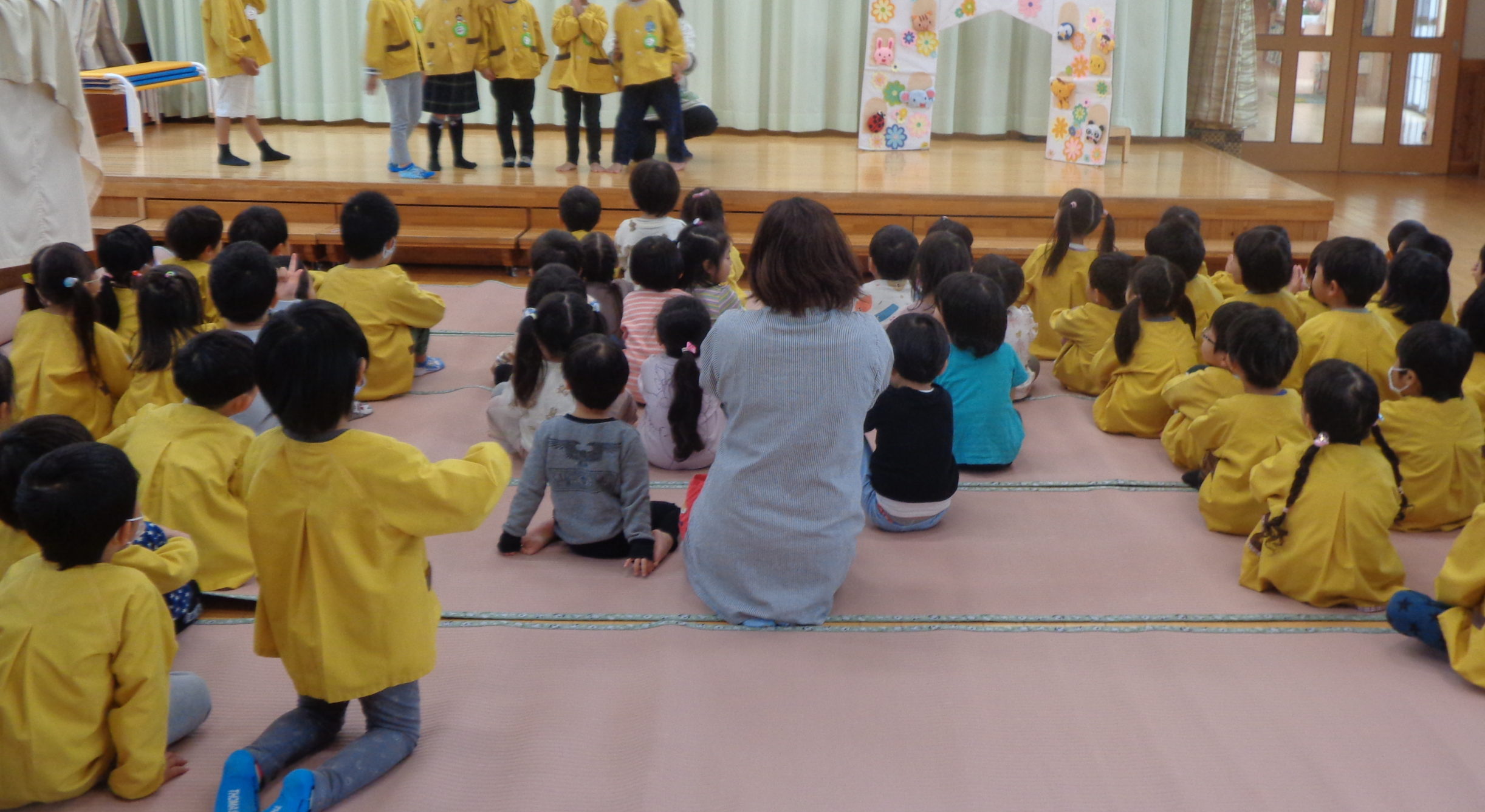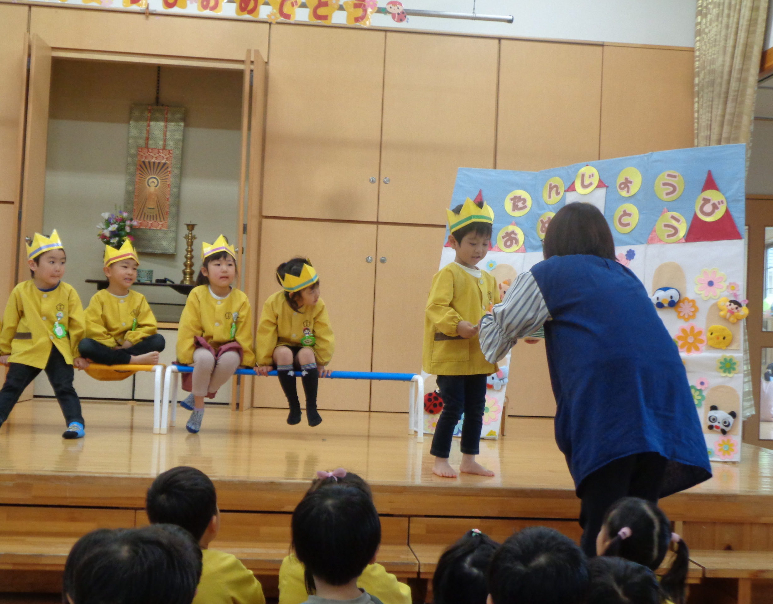 3歳以上児さんたちはホールに集まって誕生会を行いました。