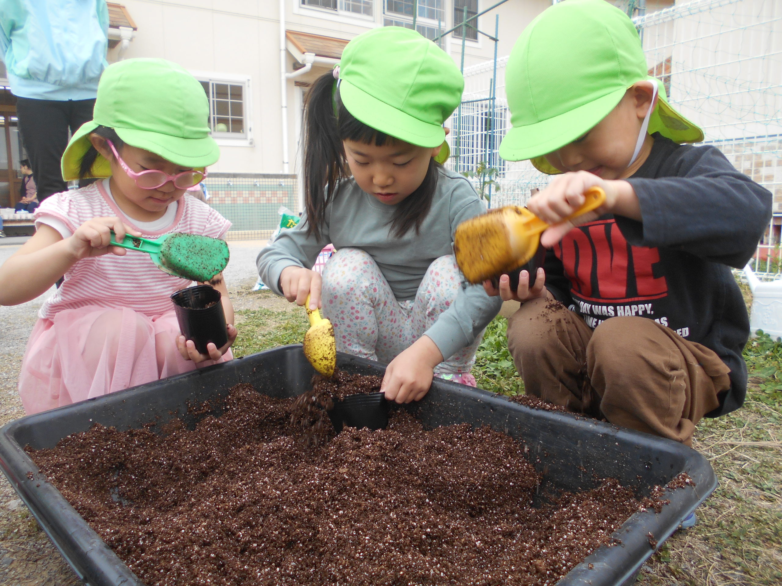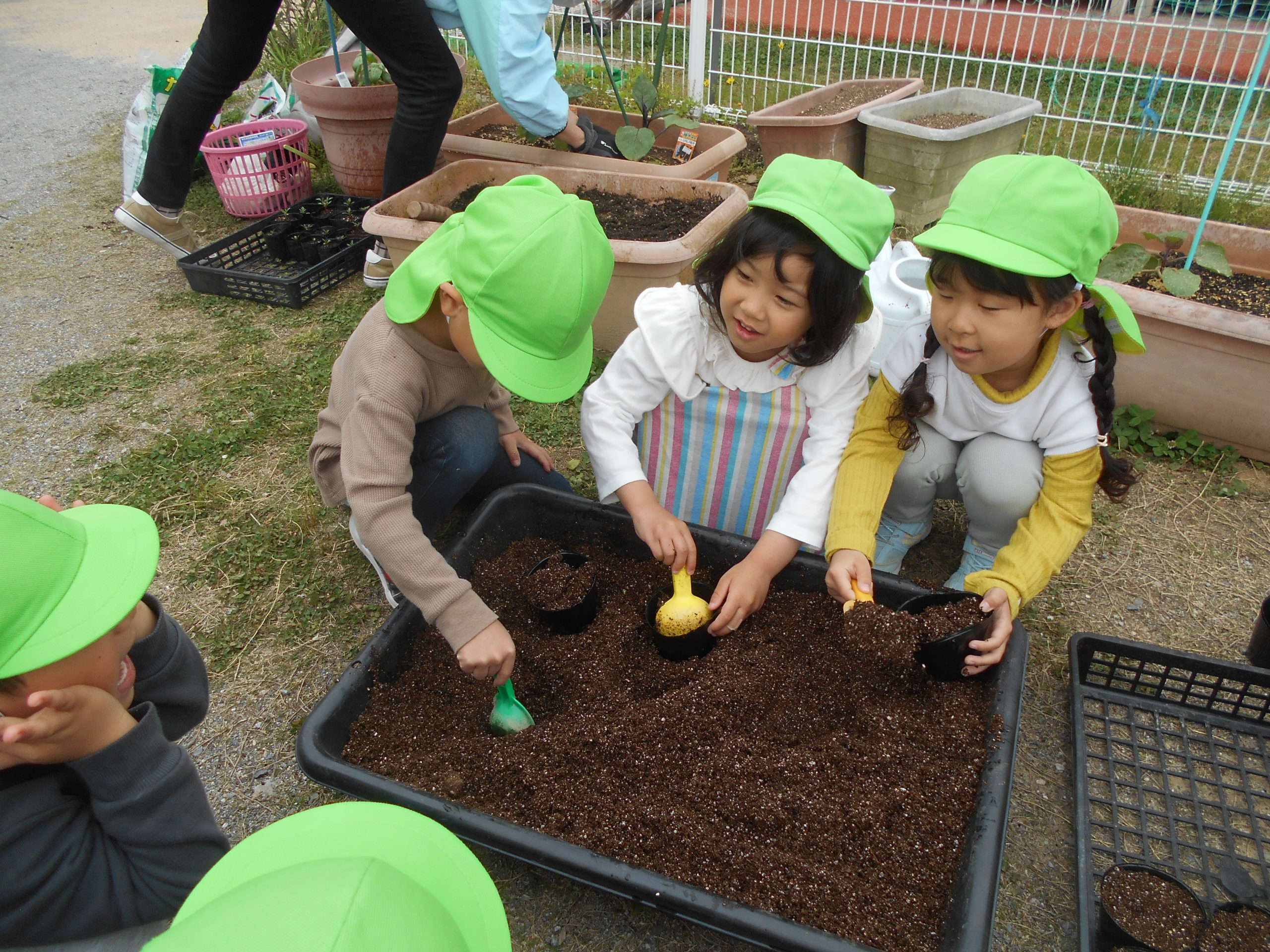 お野菜名人のお友だちのお母さんに教えてもらいながらみんな上手に土を入れていきます。「これくらいにする?」「たくさんいれたよ~」とお友だちと楽しそうに言葉を交わしていましたよ(*^-^*)