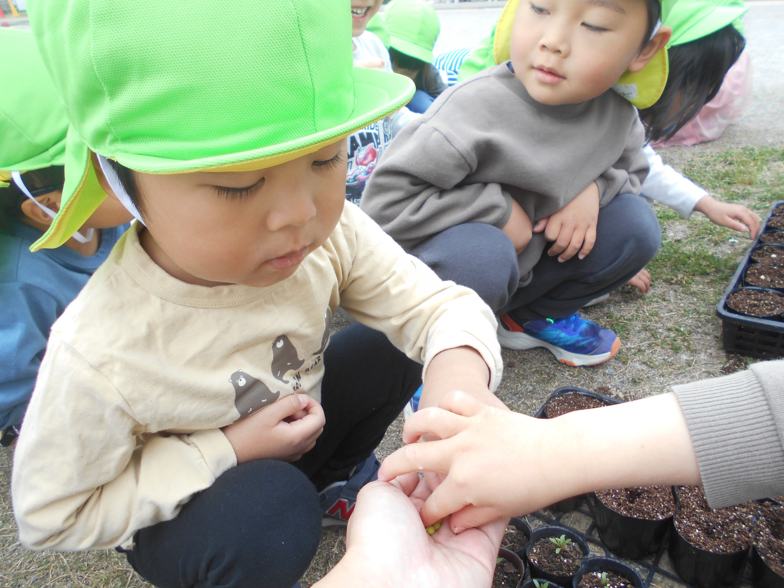 はじめにみんなで種の観察👀野菜によって色や形、大きさが違うのでみんなびっくりしていましたよ!